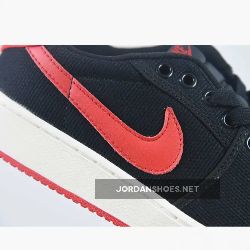 this colorway of the Air Jordan 1 KO Low is constructed out of a full Black and Red canvas base decorated with Red leather Swooshes and heels.