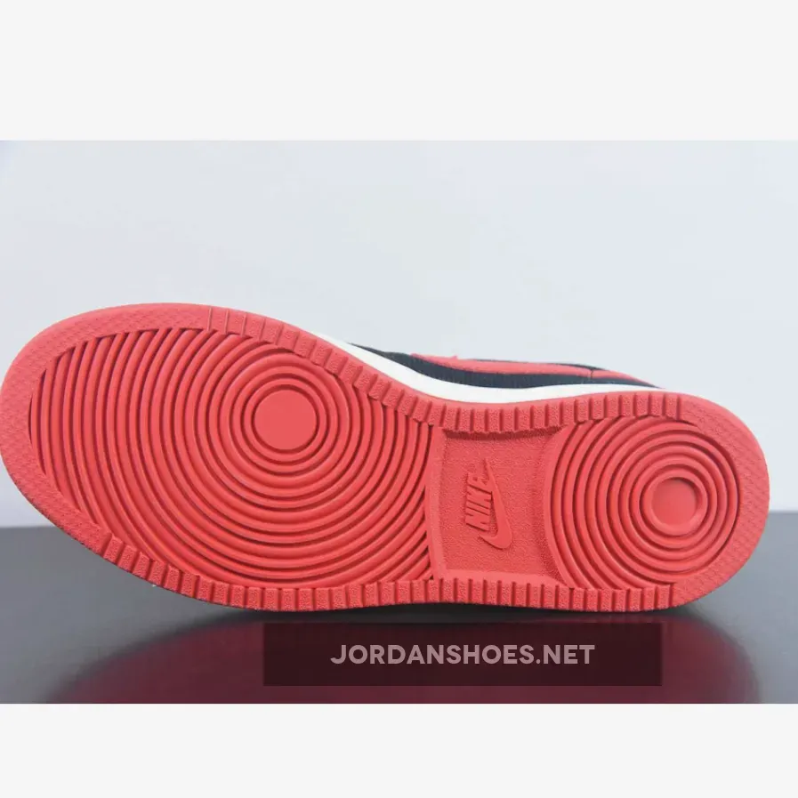 Toe boxes, profile swooshes, and upper heel panels indulge in ruby-colored flair that works with pitch-dark surroundings for a “Bred” makeup.