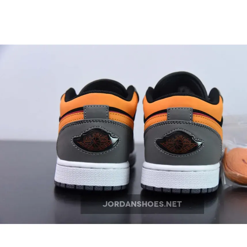 Done in an official color scheme listed as Black, Vivid Orange, Light Granite, Cardinal Red, White, this new iteration of the Air Jordan 1 Low is constructed in a mix of nubuck and leather alongside mesh used on the tongues and inner lining.