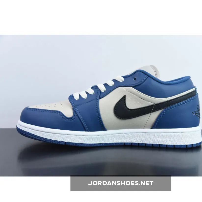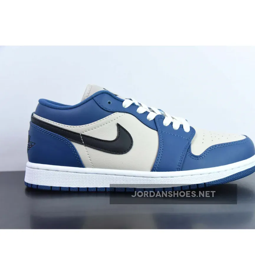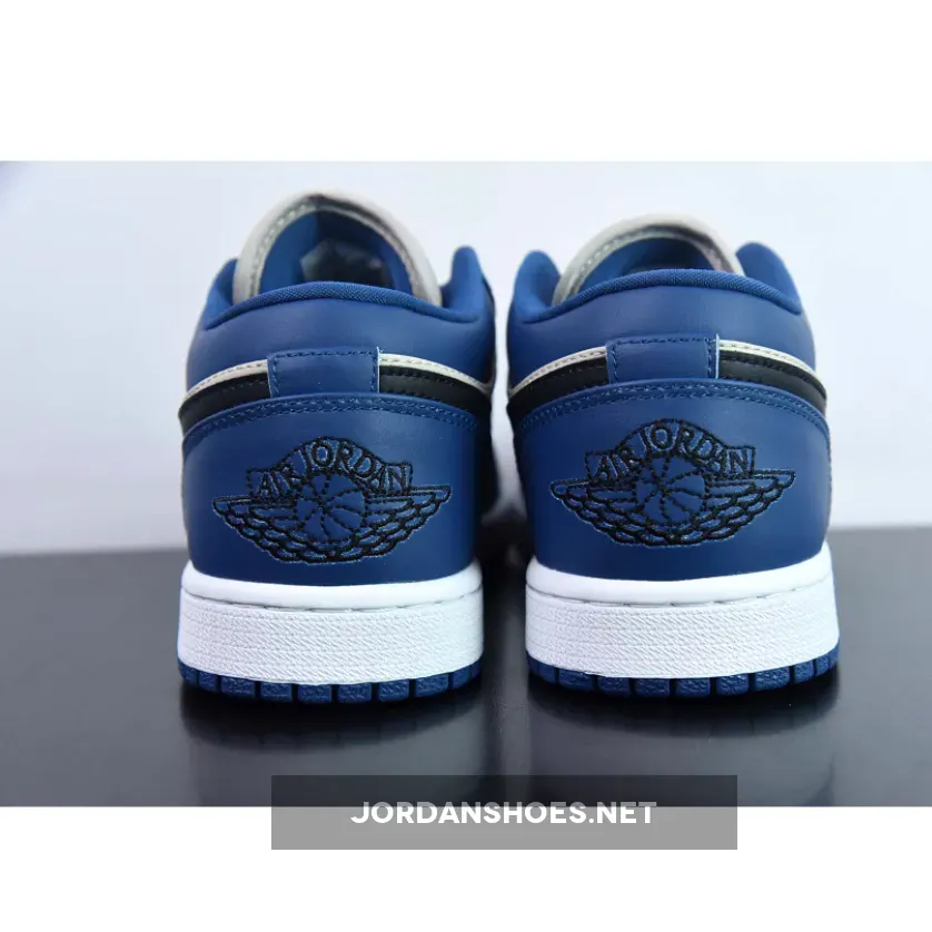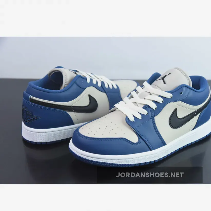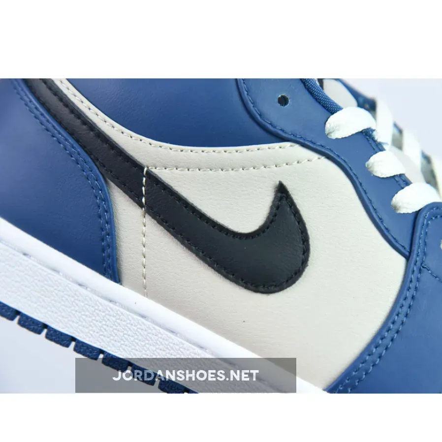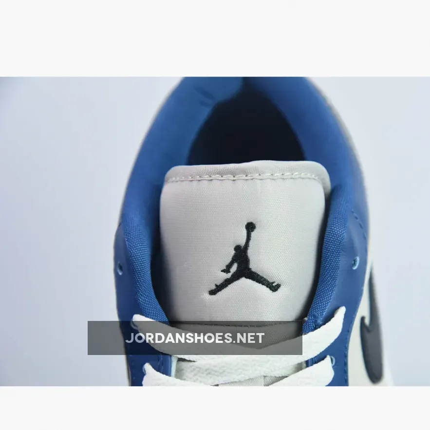 This offering of the low-top Air Jordan 1 comes constructed in a full leather build with mesh tongues and lining. This low-top pair in Low Grey Navy sees white panels overlaid with navy-blue ones and a black Swoosh appliqué tracing the medial and lateral sides with French Blue overlays, Jumpman, and Wings logos. The upper is entirely made from gently pebbled leather for a durable finish. White laces and midsole atop a Navy rubber outsole completes the design.