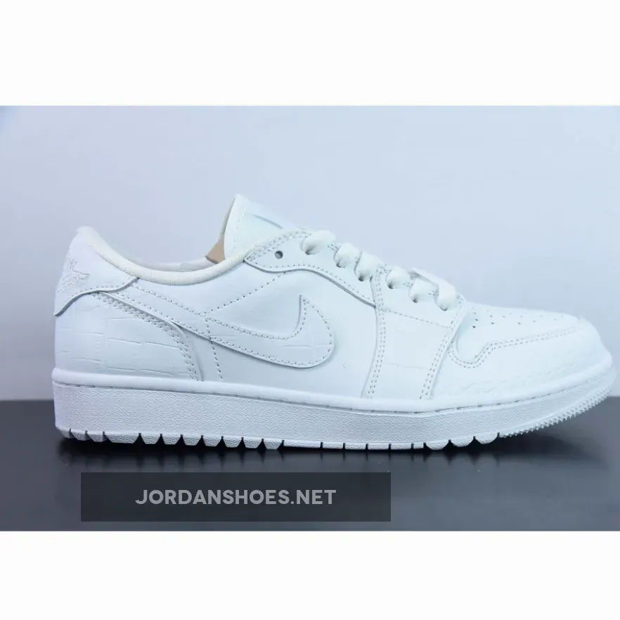 The Air Jordan 1 Low is back in its golf makeup, now sporting a mock-crocodile upper to take a walk on the premium side. The a triple white look, using different materials to bring contrast. White leather on the base with faux Croc skin in white seen on the overlays and Swoosh. The tongue tag is seen in white with the Jumpman and GOLF branding in grey and the Wings logo stitched on the heel in white. Smooth leather can be found on the sidewall and toe box, forgoing the crocodile texture seen on the other panels, providing the flexion needed for the upper to remain comfortable. The midsole has also been given the golfing update with its new tread, containing aggressive lugs that balance traction and pivoting, a key element to anybody’s game.