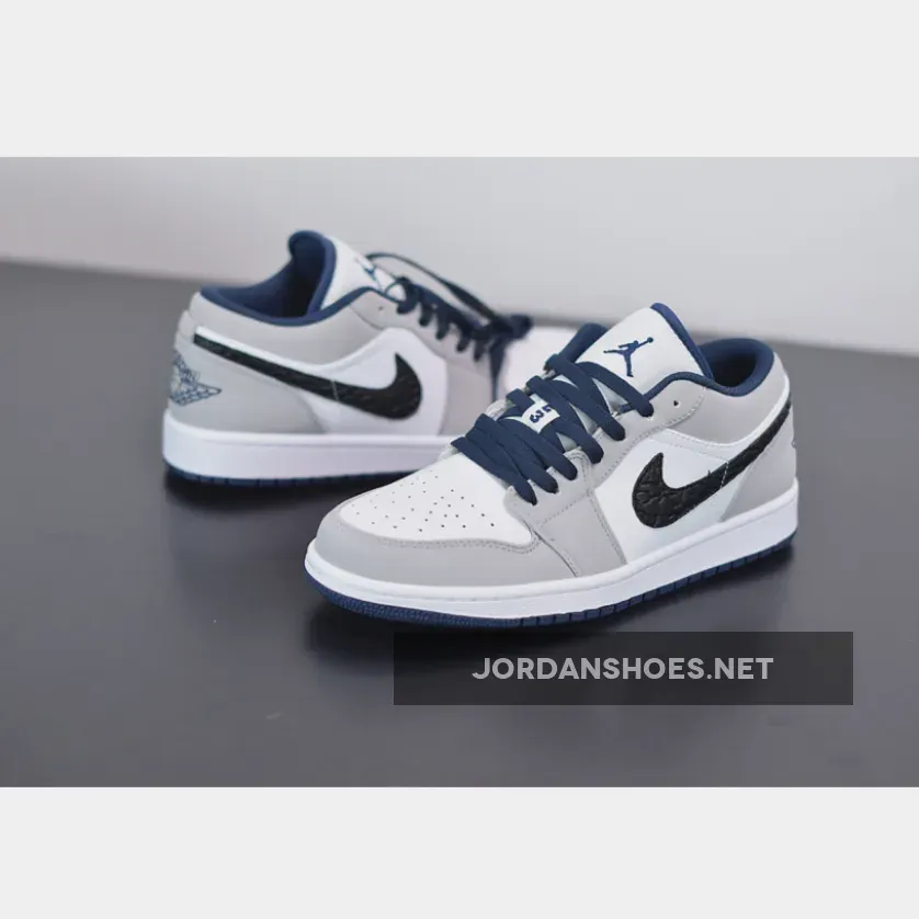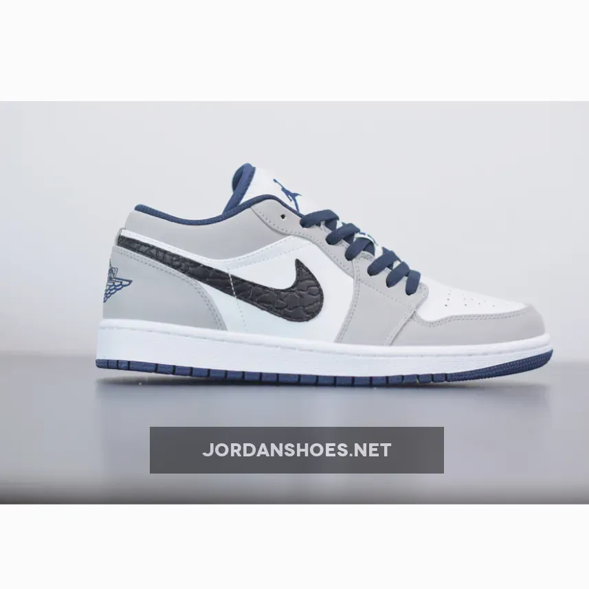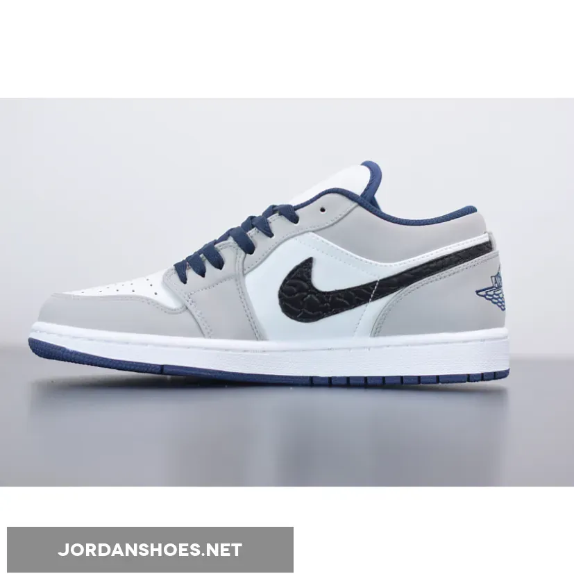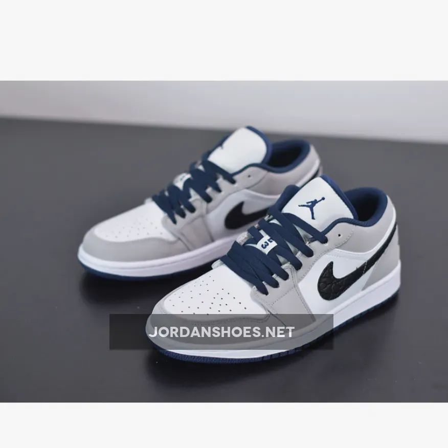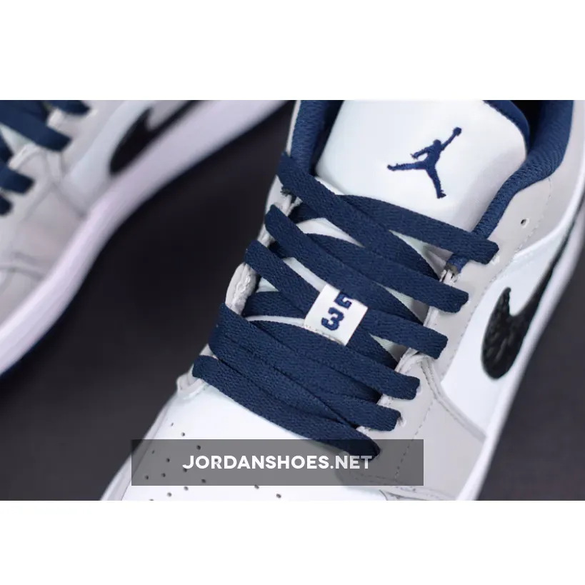 The Air Jordan 1 Low “True Blue” features a White leather base with Cement Grey trim and True Blue accents along with Black hints.