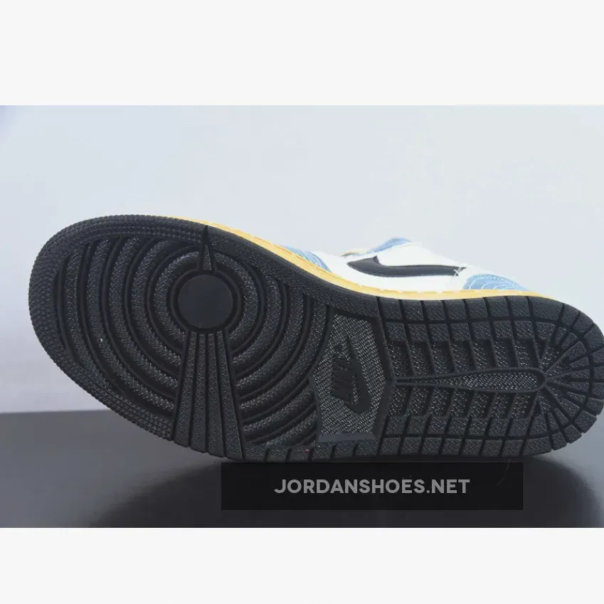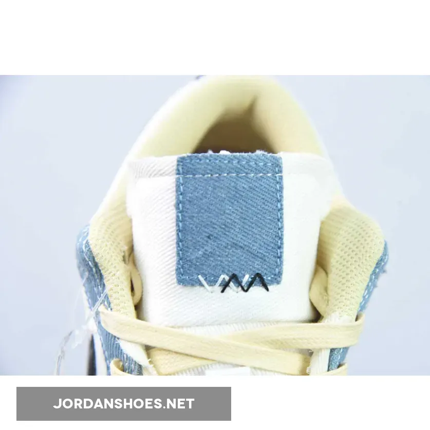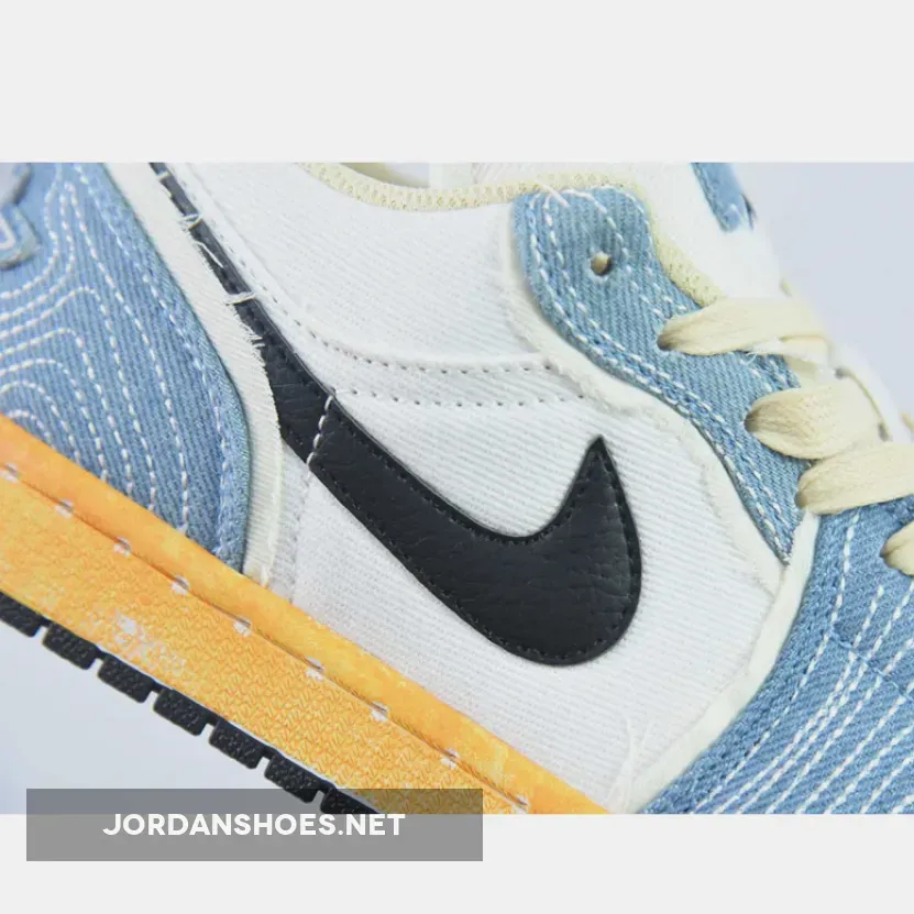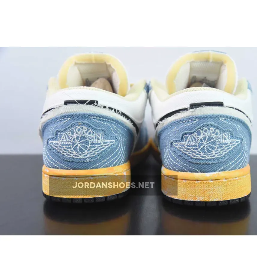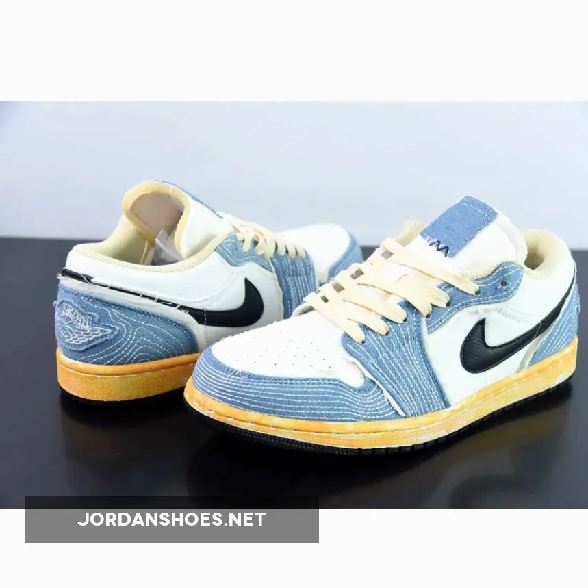 Once more paying homage to the traditional Japanese craftsmanship, the Air Jordan 1 Low Sashiko is given an aged aesthetic made up of a White canvas base with distressing and wear denim fabric overlays taking care of the the toe box, forefoot, eyestay, and heels with frayed edges.