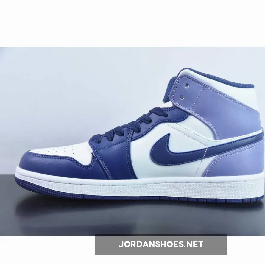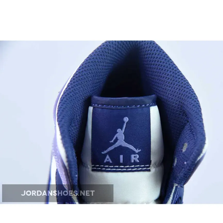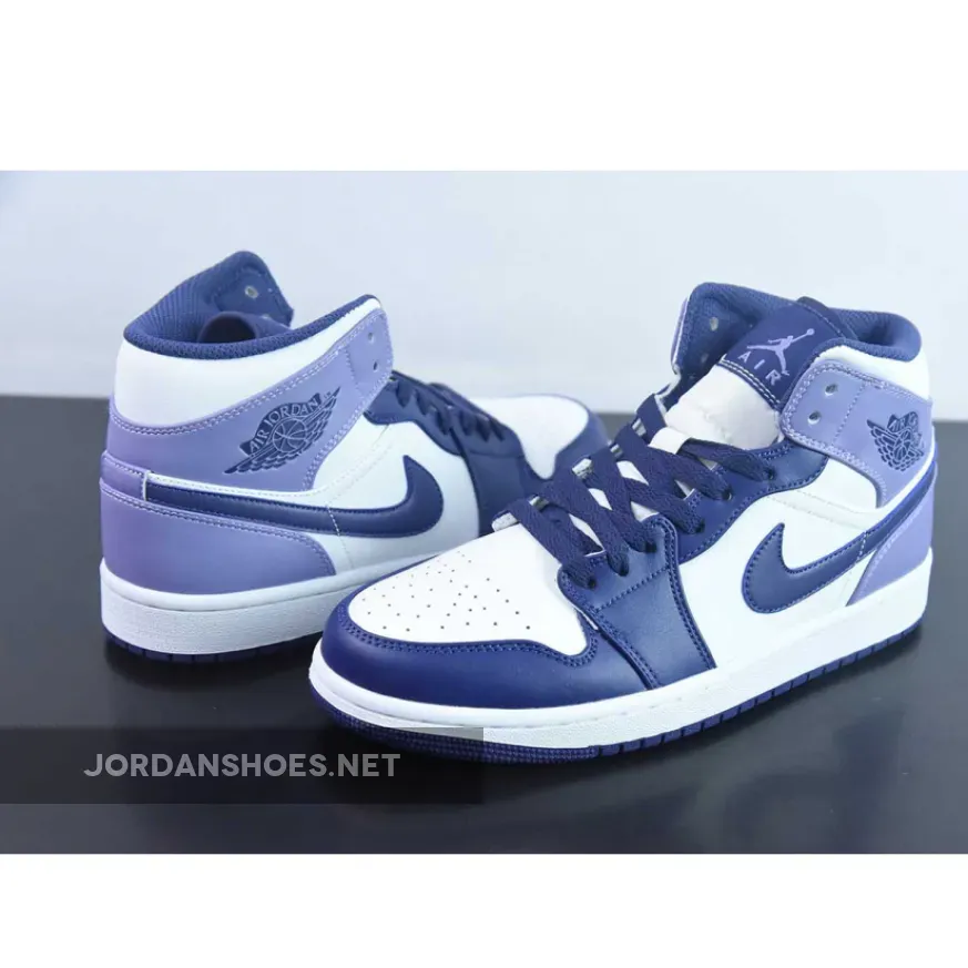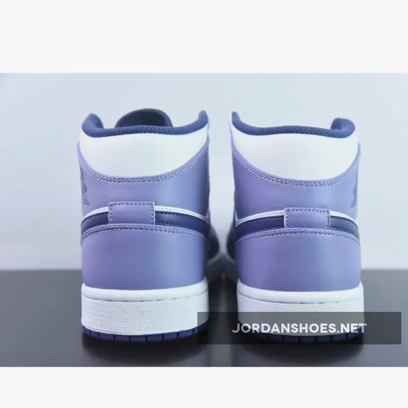 This offering of the Air Jordan 1 Mid features a full leather build on the upper with White serving as the base hue and two different shades of purple seen on the overlays.