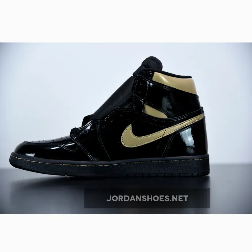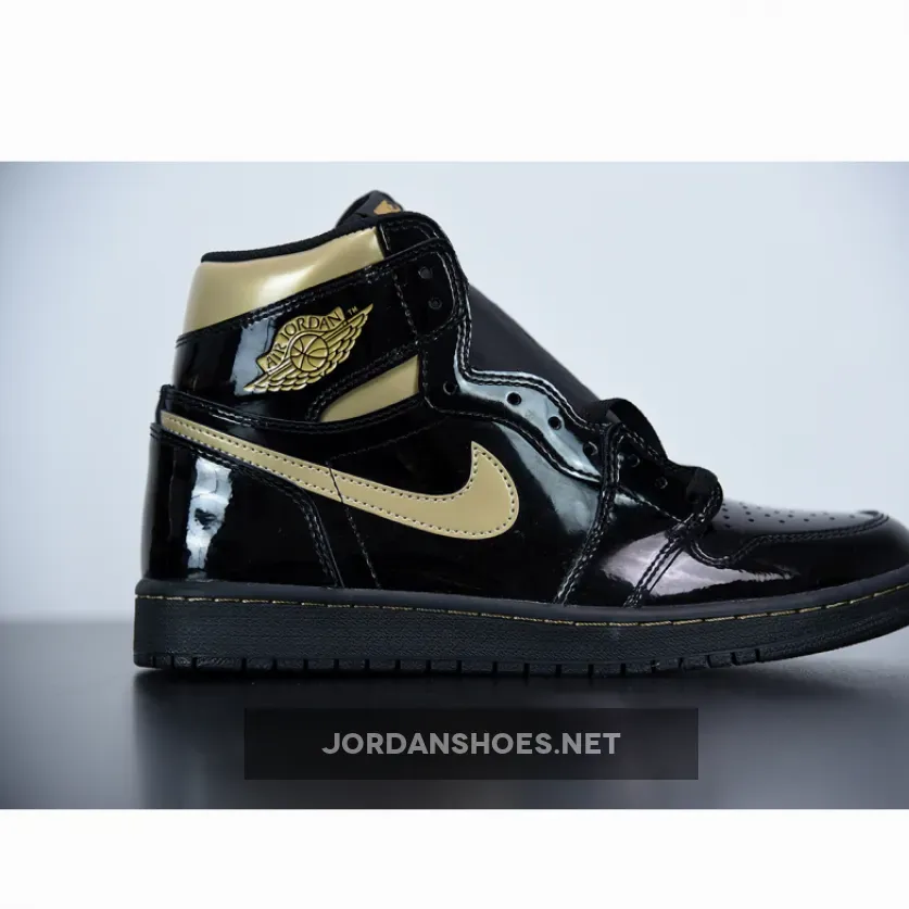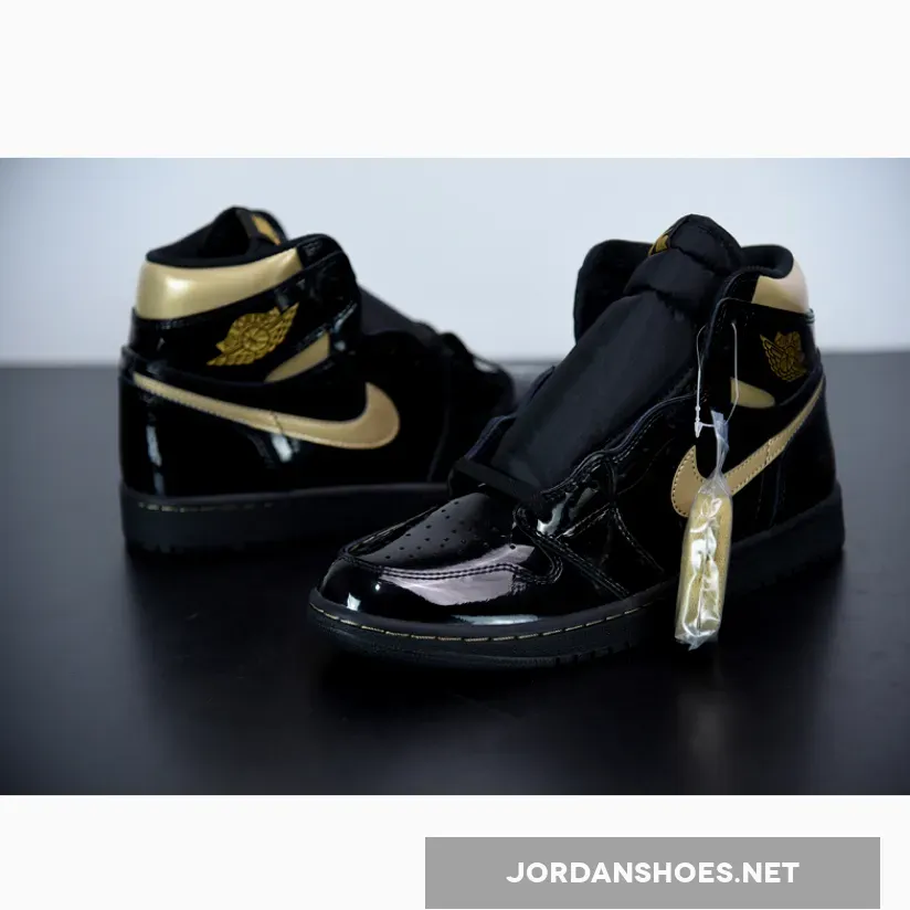 Featuring a Black and Metallic Gold color combination. This Air Jordan 1 resembles that of the Air Jordan 1 Mid that released in 2003. One of three colorways, it was the first to feature patent leather and release to the public. Furthermore, Black patent leather across the uppers while Gold patent leather is applied to the Swoosh logos and ankle. Lastly, we have ‘Nike Air’ branding on the tongue, which is done in Gold while a Black outsole finishes the look.