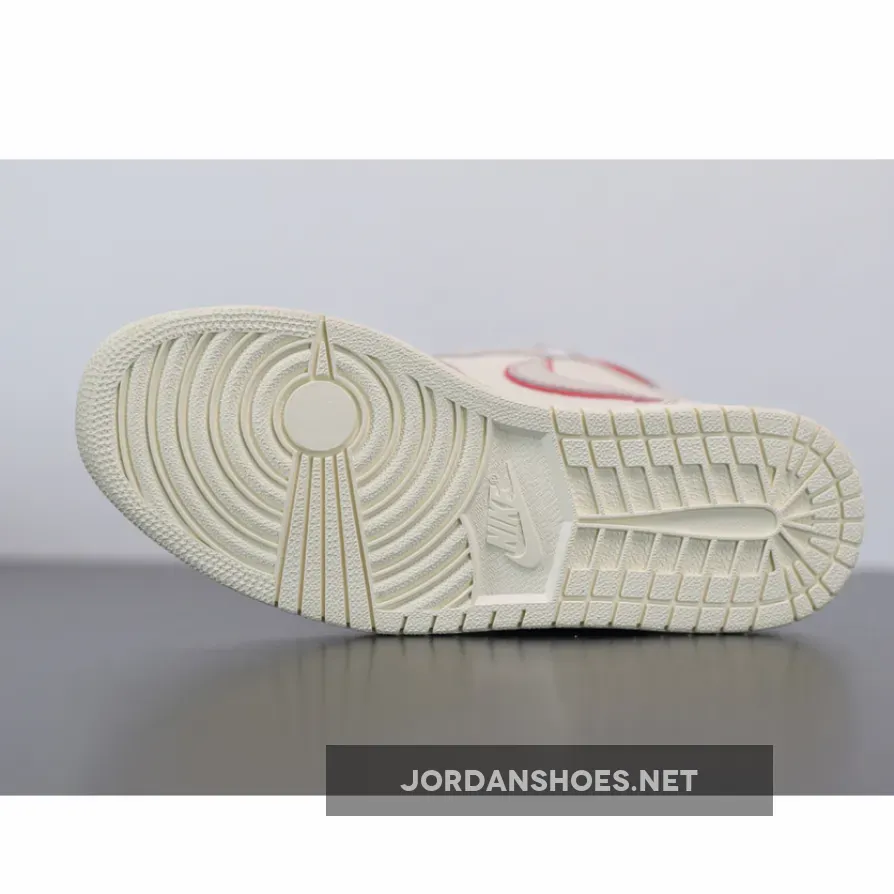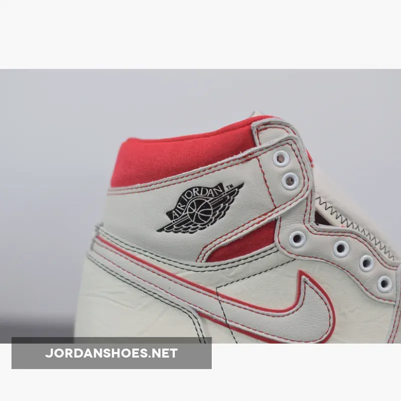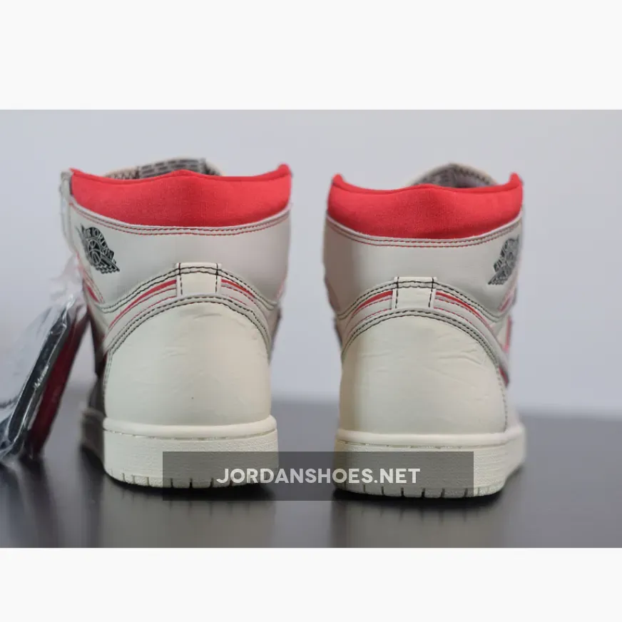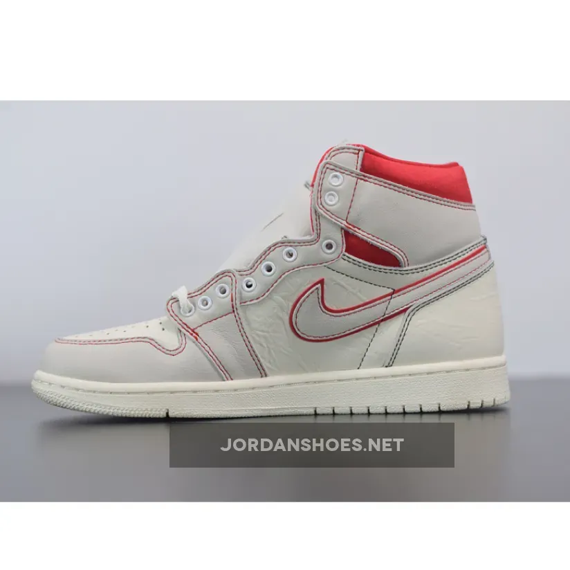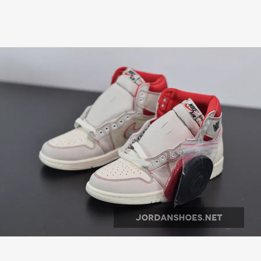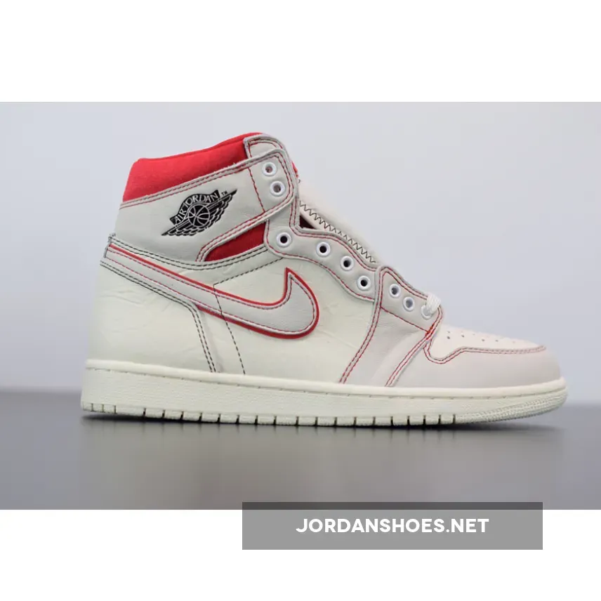 Dressed in a Sail, Black, Phantom, and University Red color scheme. This Air Jordan 1 features a Sail leather upper with Red accents on the stitching, outlined Swoosh and ankle collar. Black detailing on the Wings and tongues atop a Sail sole completes the design.