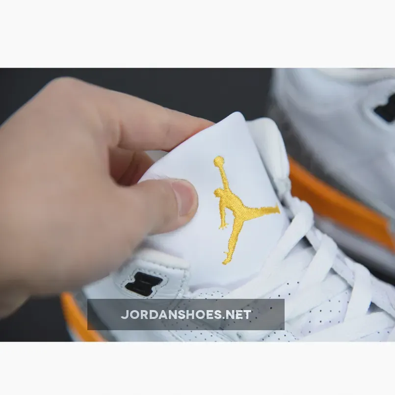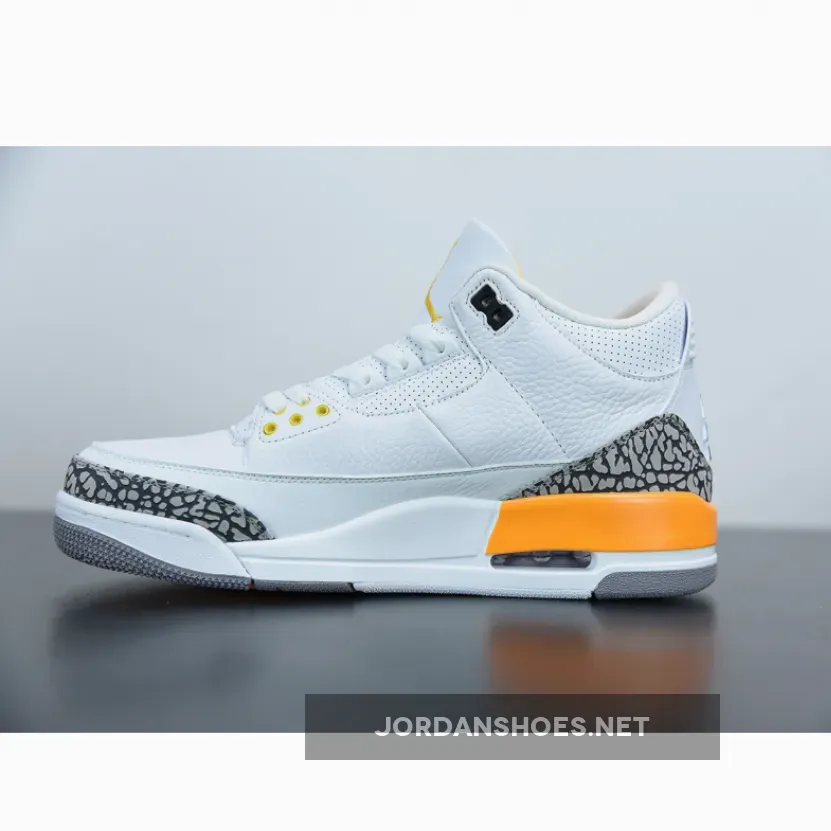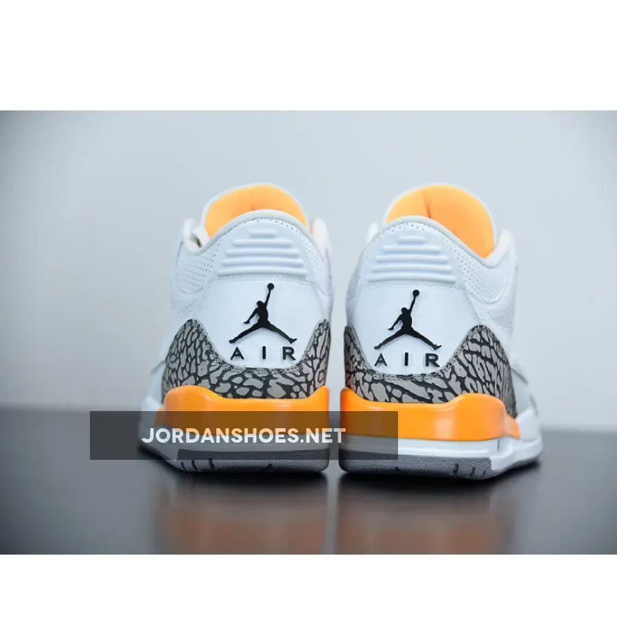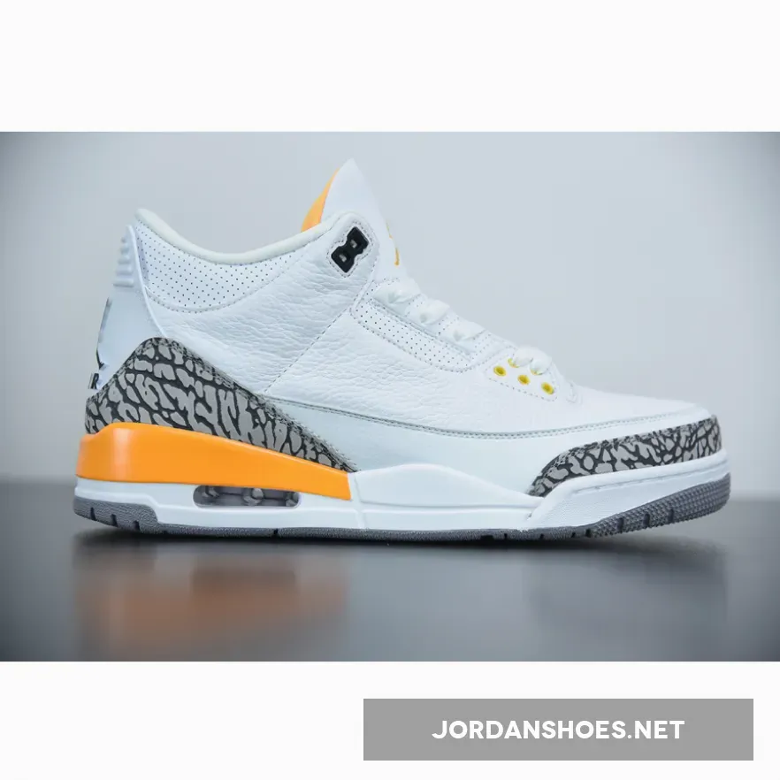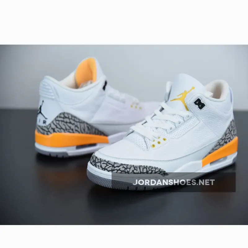 This Air Jordan 3 features a White tumbled leather upper with hits of Laser Orange throughout the sockliner, eyelets and midsole. Incorporating iconic elephant print on the toe and heel, this iteration is completed by a Laser Orange Jumpman “Air” hangtag. though branding at the rear and underfoot forgoes its beloved 1988-form in favor of retro styling.