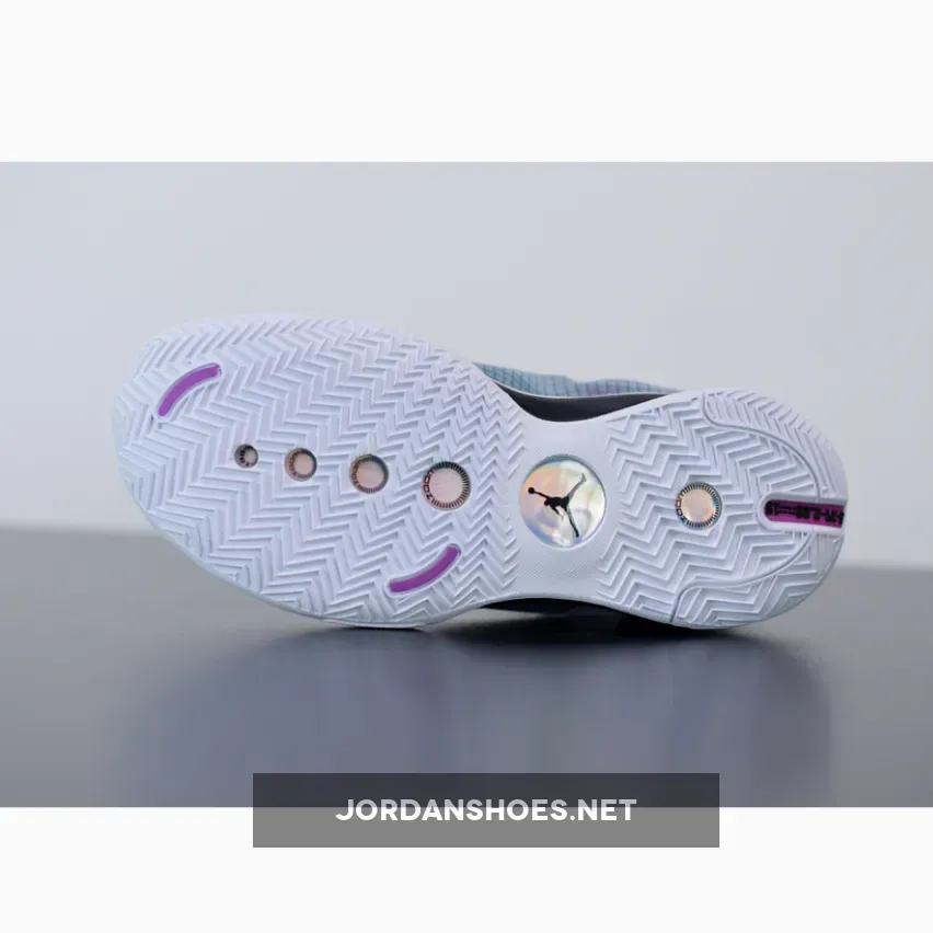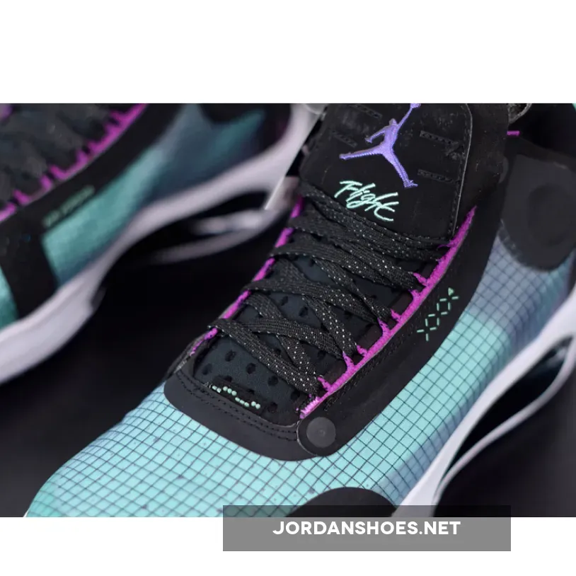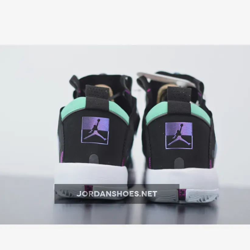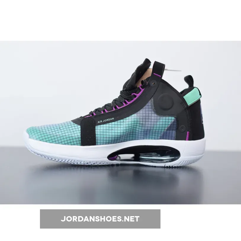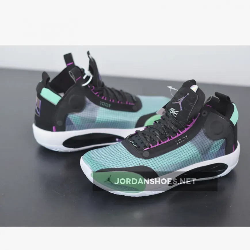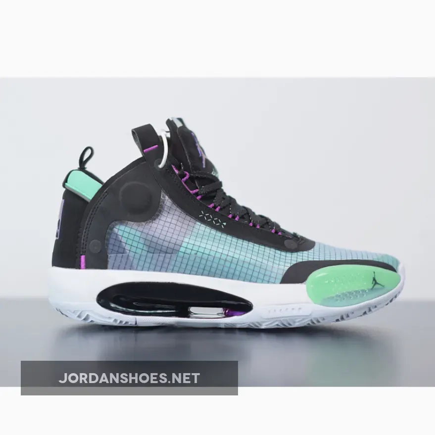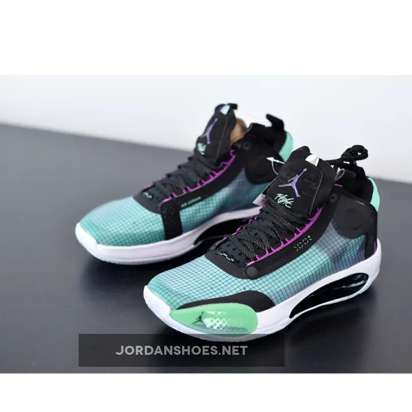 Dressed in a Blue Void, Green Glow, Black, and Metallic Silver color scheme. The Air Jordan 34 is one of the lightest Air Jordans to date.