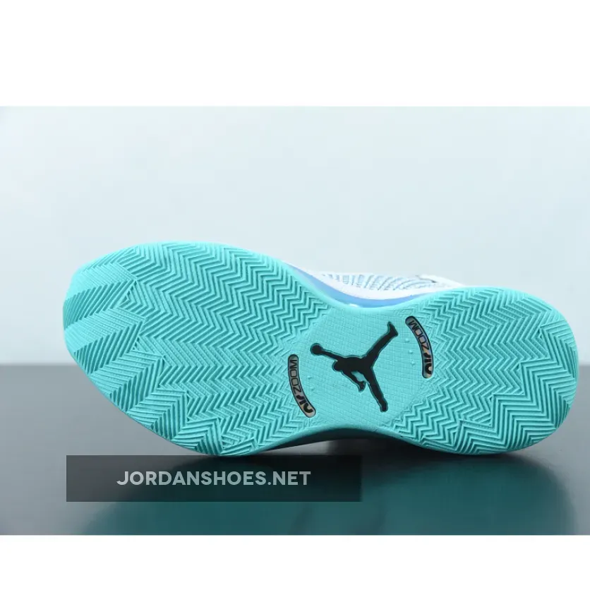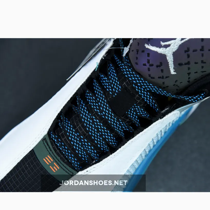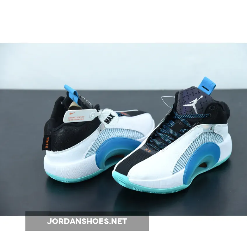 Going over this Air Jordan 35, it features both White and Black throughout the base. Next, we have Teal and Blue on the Eclipse plate, side panels, laces, tongue pull tab, and the rubber outsole. Guo Ailun’s logo adorns the right tongue while a Jumpman logo lands on the left. Following, the heel tag features Chinese characters in Red while more Red lands on some of the branding. Lastly, a unique graphic covers the insoles.