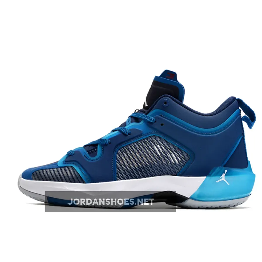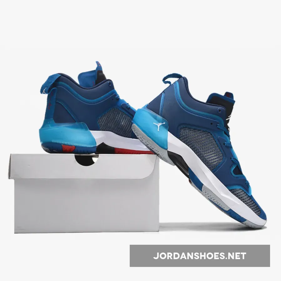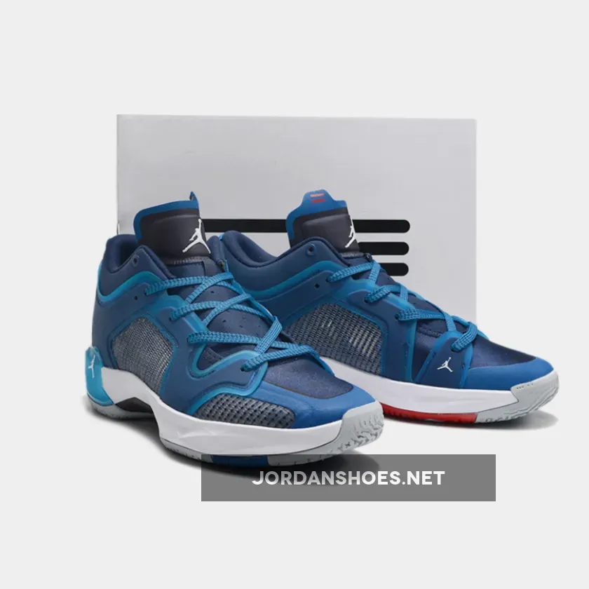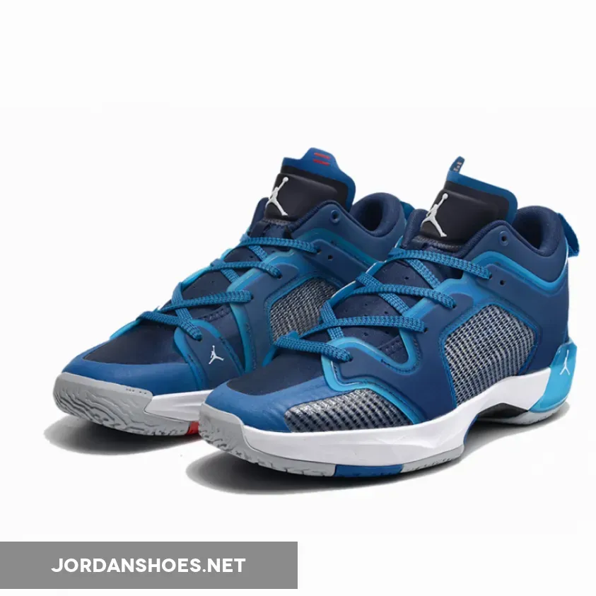 This Air Jordan 37 Low features a Military Blue, White, Midnight Navy, True Red, and Sky Grey color combination. Highlighting the shoes, Featuring the same sequence of Greek letters that appeared on the latter collection’s heel insignia, its white and blue crest renders a singular appearance atop the left tongue in place of its typical Jumpman logo. Finishing the look is a crisp white midsole unit and semi-translucent icy blue heel counter pairs with sectioned grey embellishments along the tread underfoot..