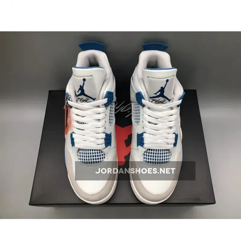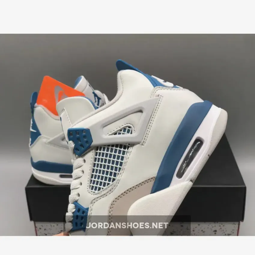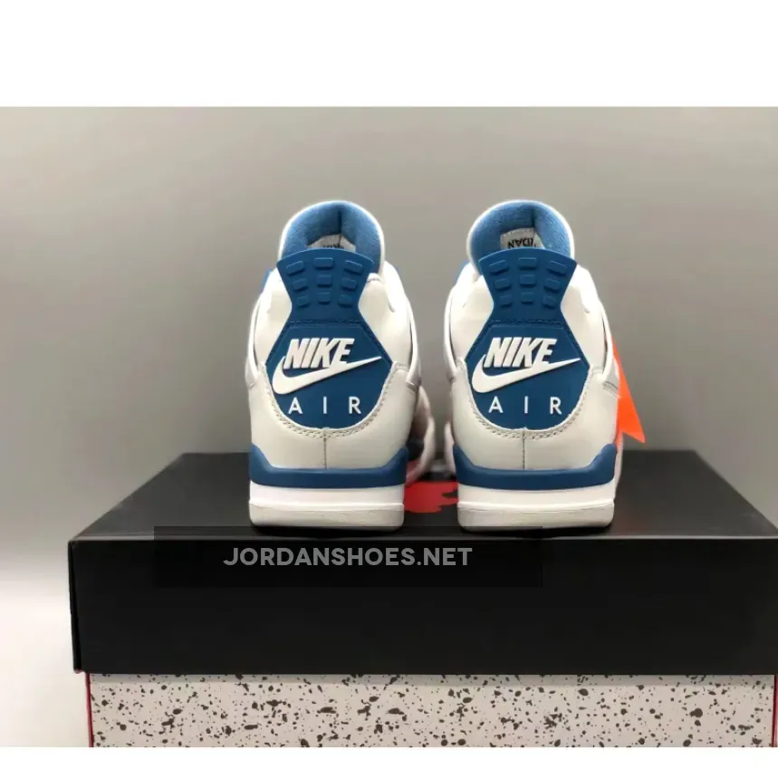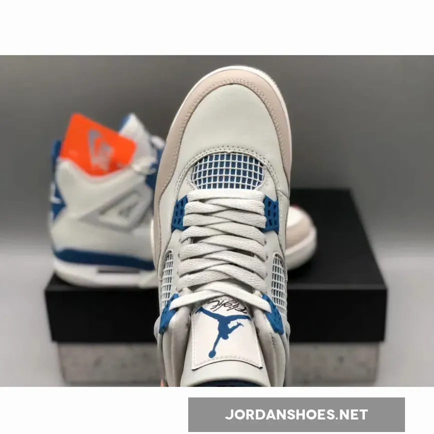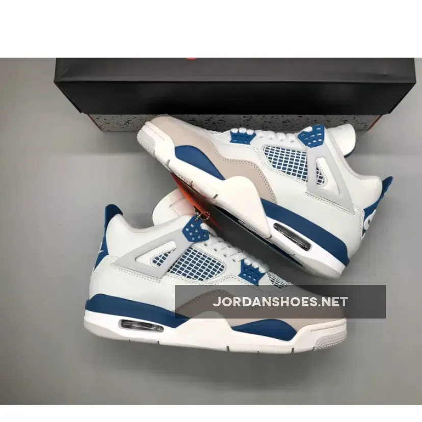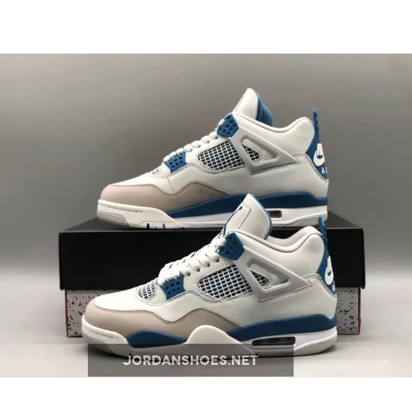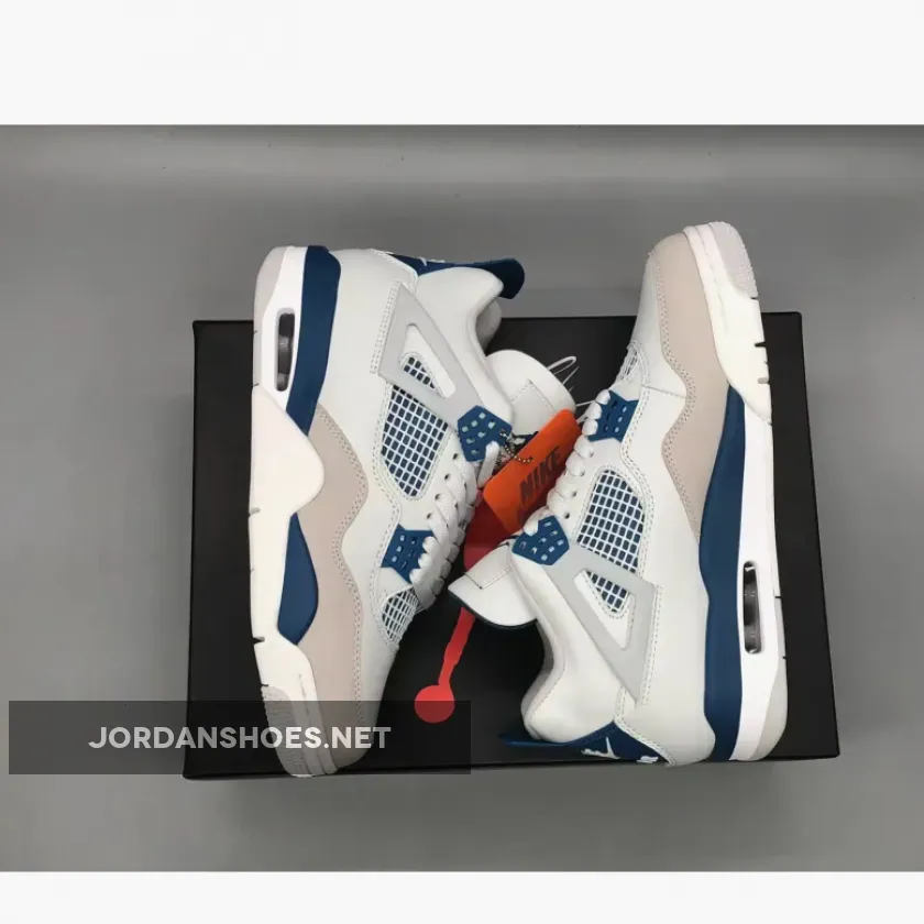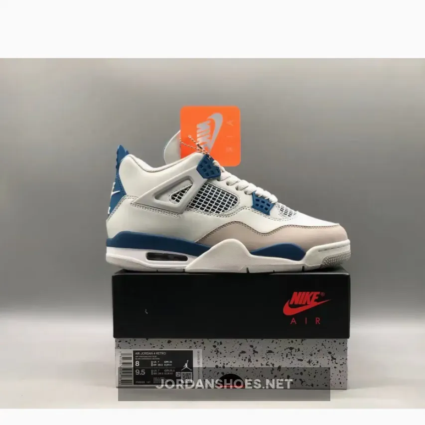 The Air Jordan 4 showcases a timeless color scheme consisting of Off-White, Military Blue, and Neutral Grey. Its upper is crafted from Off-White leather with overlays in Neutral Grey adorning the toe area. The quarter panel is equipped with a “Military Blue” underlay and topped off with the AJ4’s signature net. The design is elevated by Military Blue accents on the eyelets, midsole, heel tabs, and Jumpman logos on the tongues. Adding to the authenticity, the heels bear “Nike Air” branding in White, while a White, Blue, and Grey rubber outsole completes the overall aesthetic.