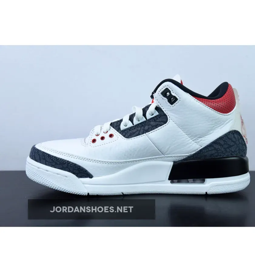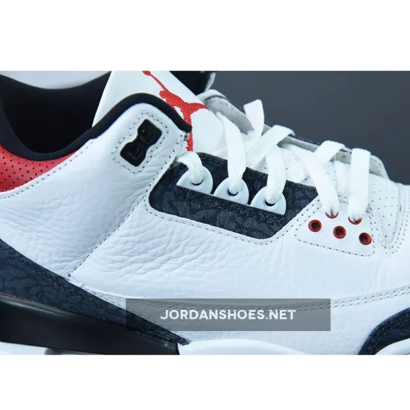 The Jordan 3 Retro SE-T CO JP Fire Red Denim features a white, Fire Red, and black leather against a denim upper and with deep, Fire Red accents at the eyestays, tongue lining, and heel lettering. From there, a grey elephant-like pattern receives a finish in raw denim to add trim to the toe and heel, and the Nike “Swoosh” appears at the back of the silhouette accompanied by Japanese characters to complete the design.