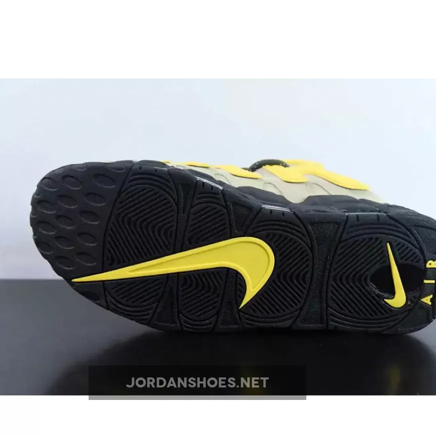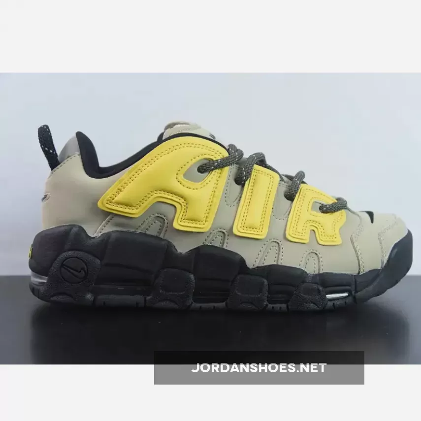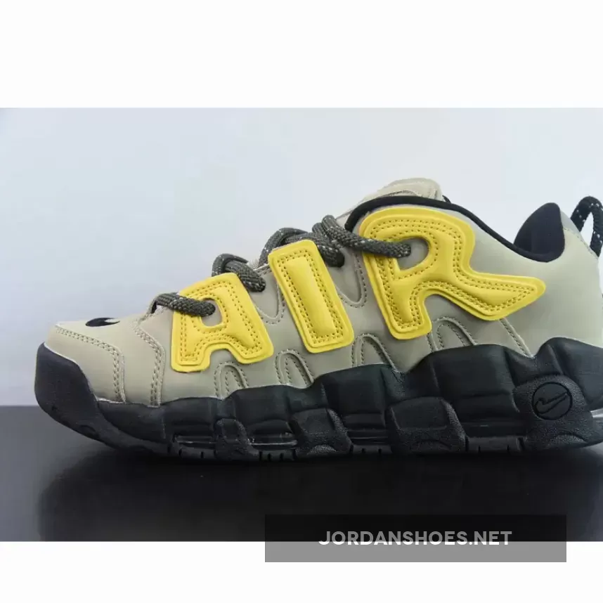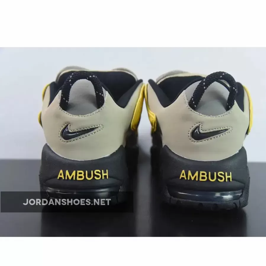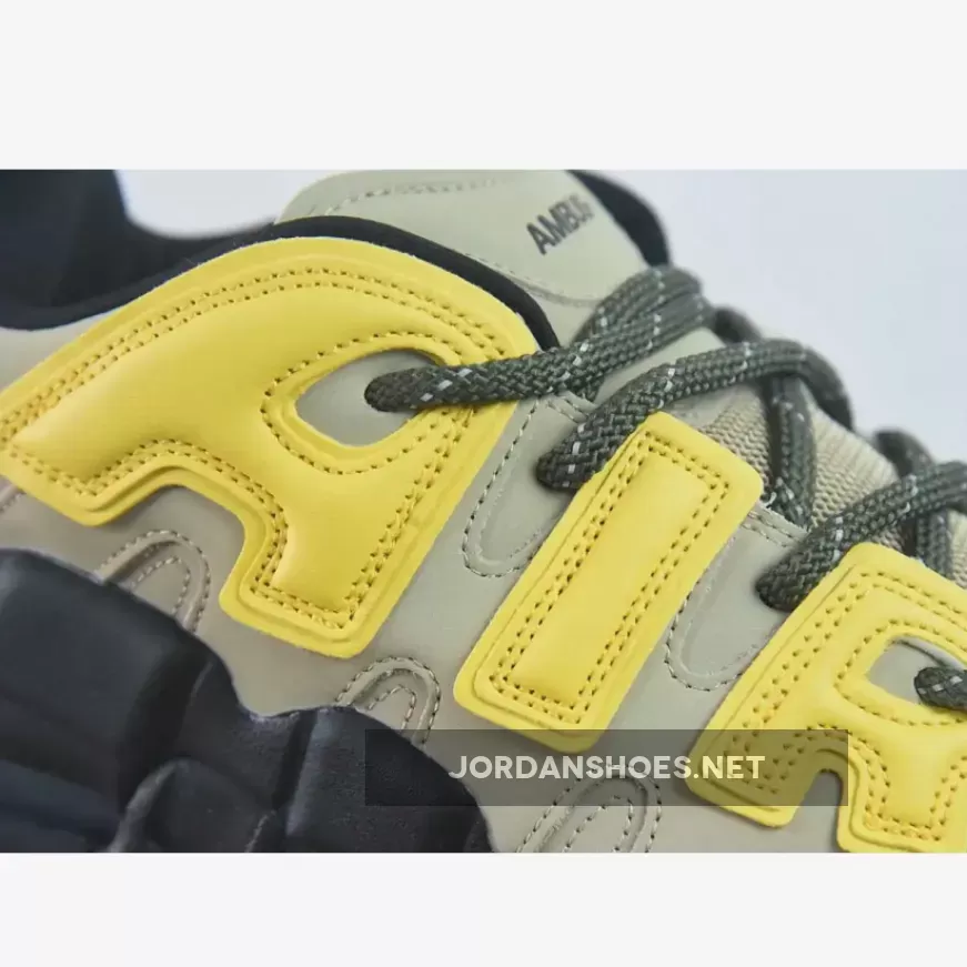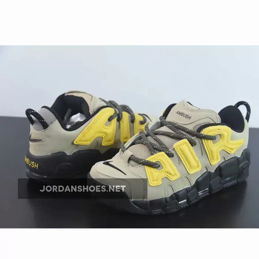 The Nike X Ambush Air More Uptempo Low ‘Limestoner’ features a Tan nubuck upper, Black embroidered mini Swoosh, and Yellow accents, creating a versatile look..