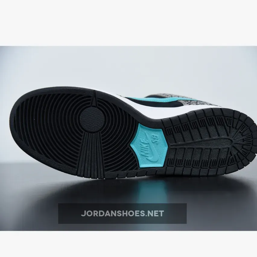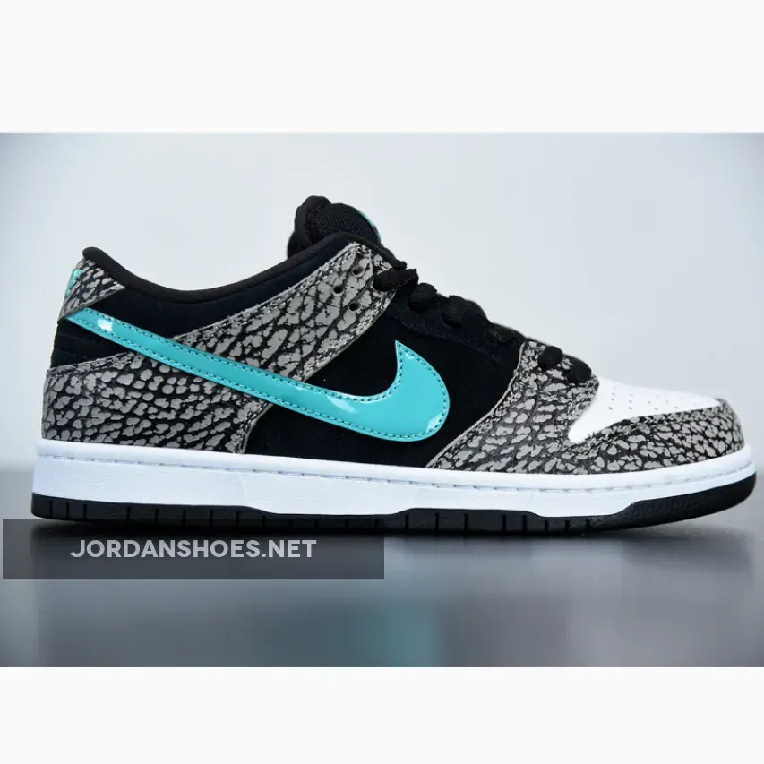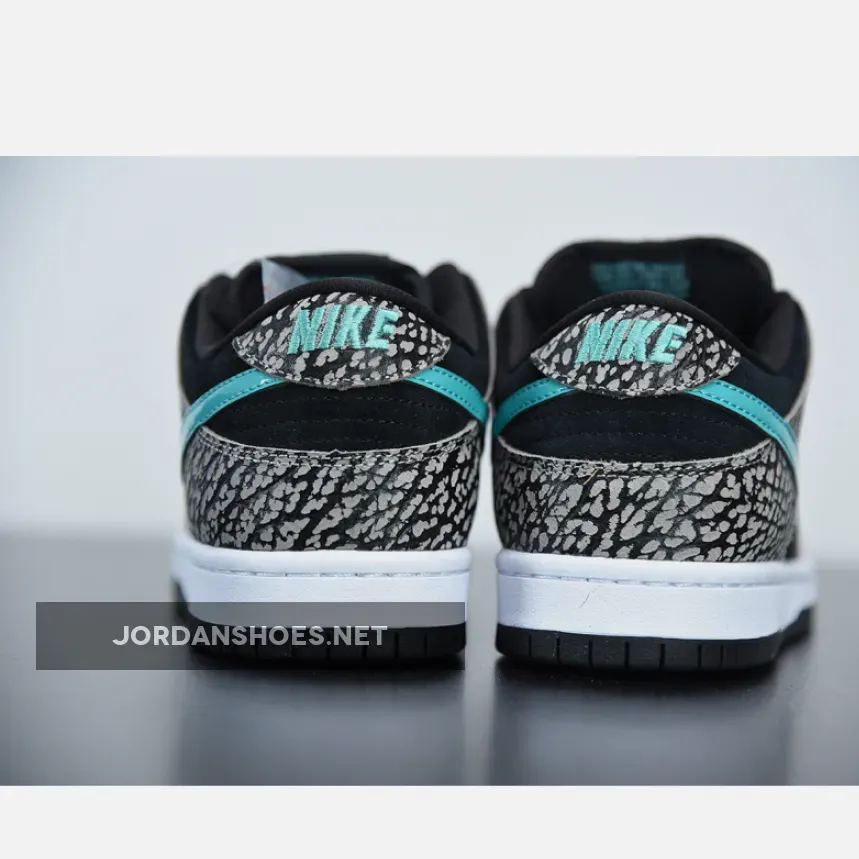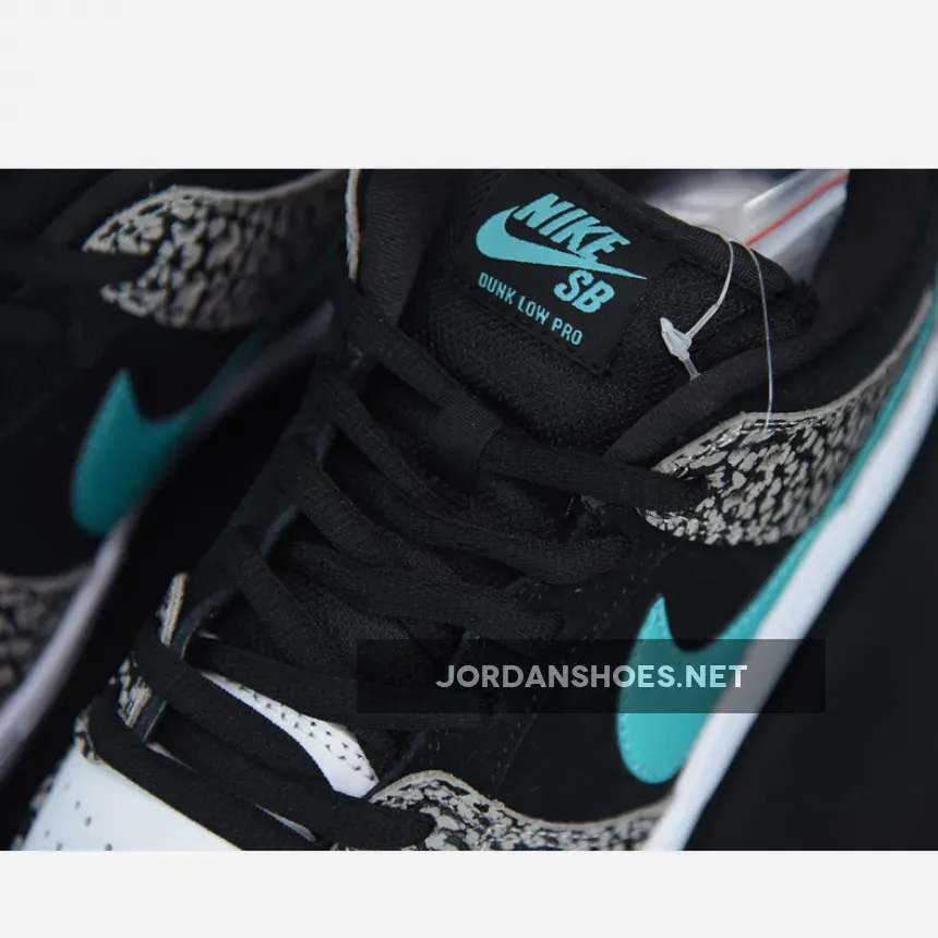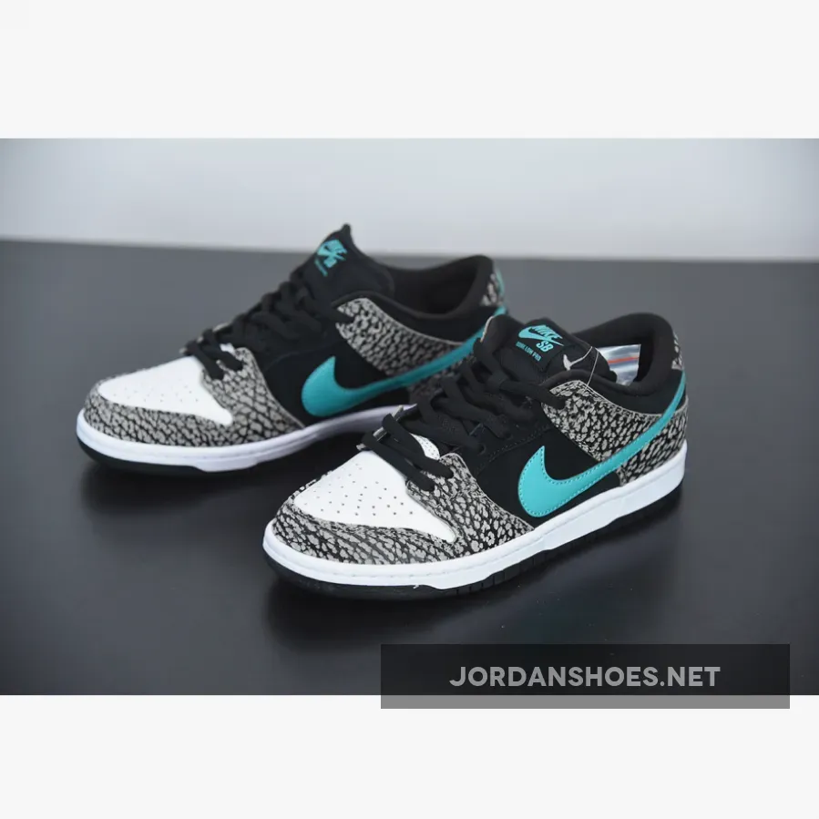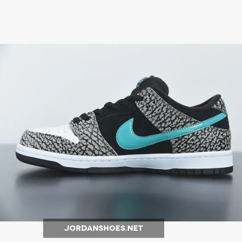 This Nike SB Dunk Low is inspired by the iconic atmos x Air Max 1 “Elephant,” as the sneaker borrows the same aesthetic as the runner and features a white leather gracing the toe cap, followed by black for the side panels and ankle portionn. And Air Jordan 3-reminiscent patterns and “Clear Jade” accents – the latter consisting of profile swooshes and branding on the tongue and heel.