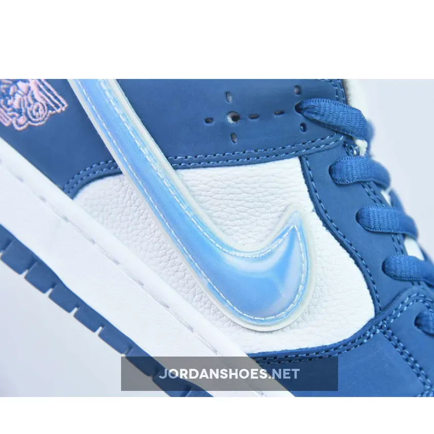 The LA-based streetwear label upgrades the classic SB model with a crisp white and blue color scheme.This offering of the Born x Raised x Nike SB Dunk Low features a White premium leather upper and lining with Blue nubuck overlays, mesh tongues atop a White midsole and Blue rubber outsole.. Highlighting the shoes, we have Born x Raised’s motto, ‘One Block At A Time,’ embroidered on the forefoot and placed on the tongue labels. Next, “In Loving Memory” is heat pressed onto the laces with branded lace tips, 3D text on the midsole’s heel with co-branded tongue labels, heels, insole, and outsole completes the design. Co-branding lands on the tongue labels, heels, insoles, and outsole, while holographic Swooshes and heel tabs finish the look