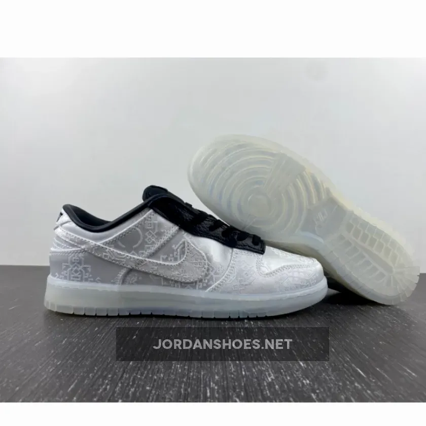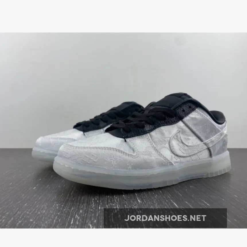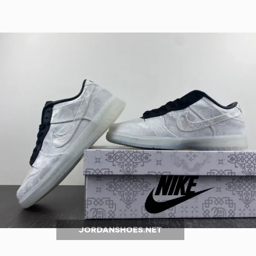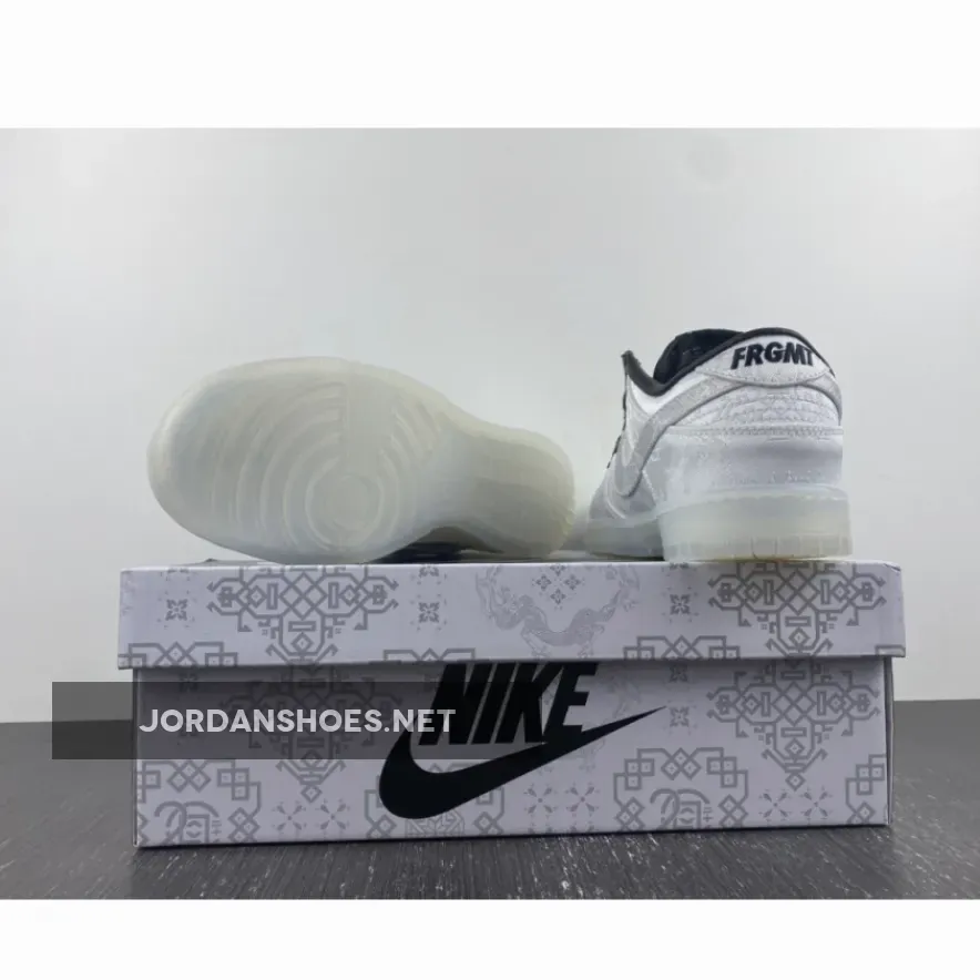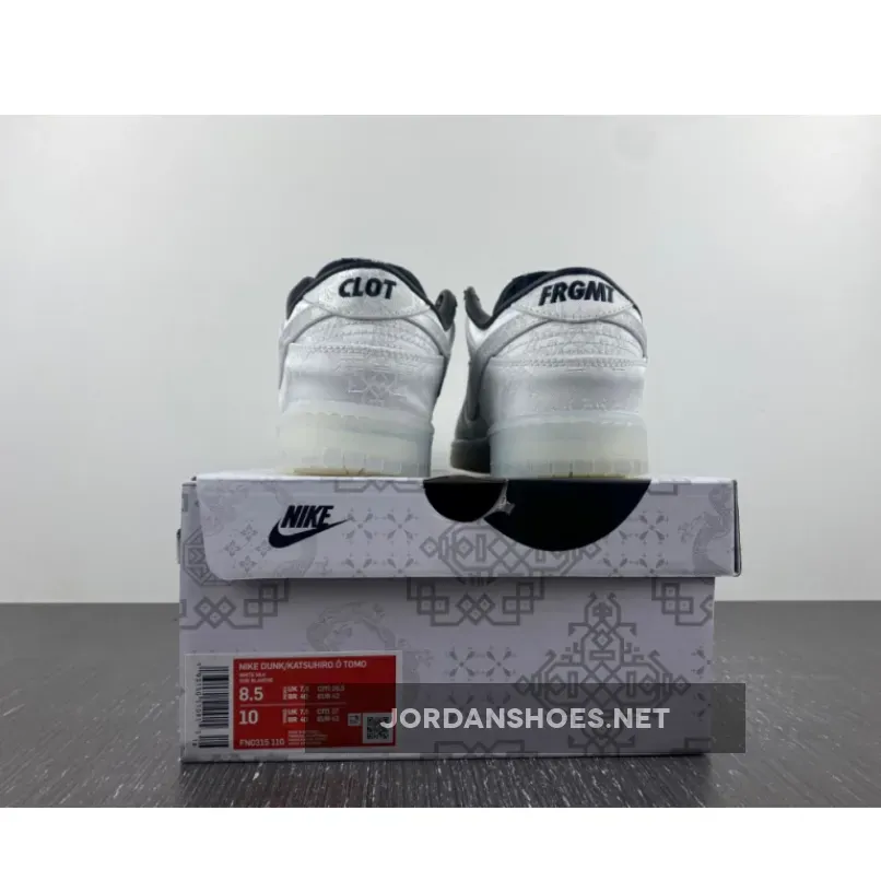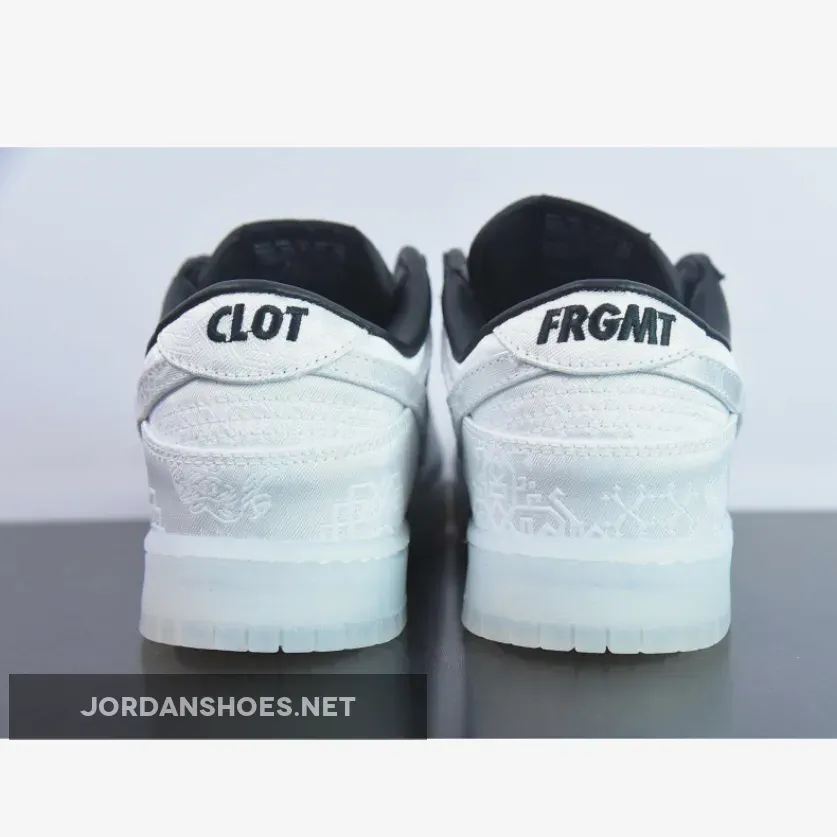 the Clot x Fragment x Nike Dunk Low features a tearaway silk upper in White with Black leather eyestays and lining atop a translucent outsole. “FRGMT” branding is embroidered on the heels, while co-branded Clot and Fragment logos are stamped onto the insoles. The shoe will also come housed in special packaging.