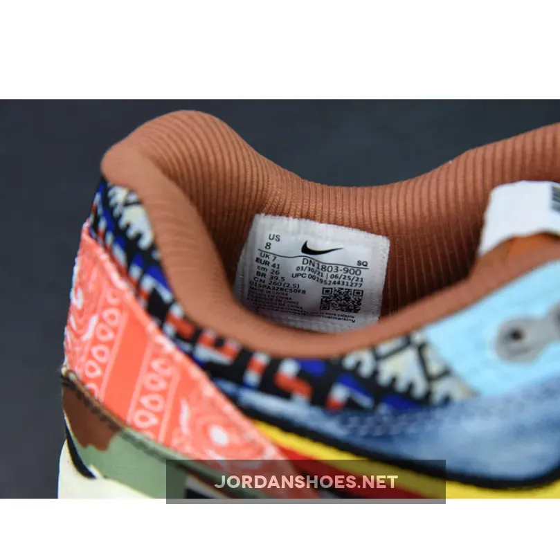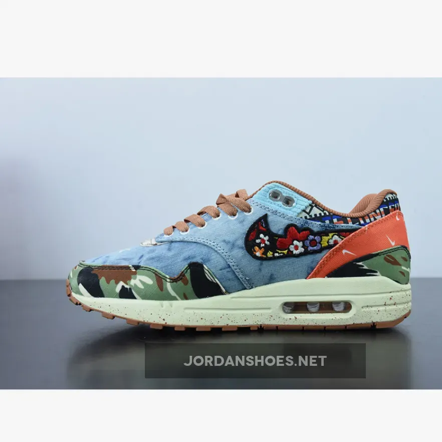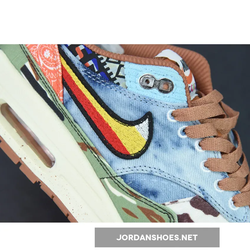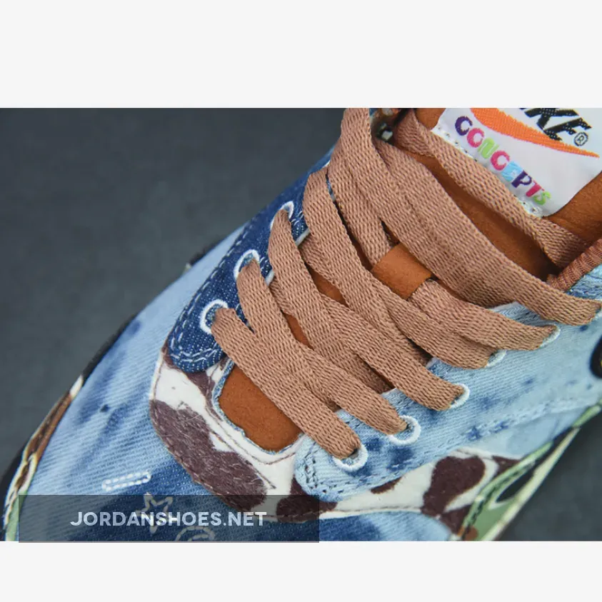 The Concepts x Nike Air Max 1 “Heavy” celebrates the iconic AM1 silhouette’s 35th anniversary by paying homage to 60s and 70s inspired design cues. Also referred to as the Air Max 1 “Denim Tiger Camo” due to the shoes mismatched and psychedelic upper, there is a lot to unpack with this sneaker.Panels of denim, tiger print, tie-dye, camo, bandana print, and a floral swoosh are all present on this collaboration. There are also incredible details throughout this shoe such as embroidery and nods to both Concepts and the Swoosh brand. Paying homage to the music of the period, the “Far Out” sneaker even comes with a hang tag in the shape of a guitar pick.