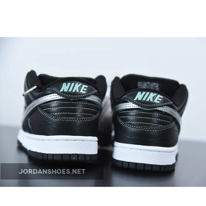 The pair features a black leather upper and black crocodile panels reminiscent of the original release wrapping the toe and heel. Additional details include a removable metallic silver Swoosh, Tiffany-colored Velcro, quilted liner, and a Diamond on the tongue also borrowed from the classic 2005 release. The heel tab can be flipped up to reveal “Diamond” branding stitched in black underneath. Tiffany blue insoles, a white midsole, and black outsole complete the design. As a nod to OG SB collectors, the pair also sports the signature puffy tongue of SB Dunks from the mid-2000s.