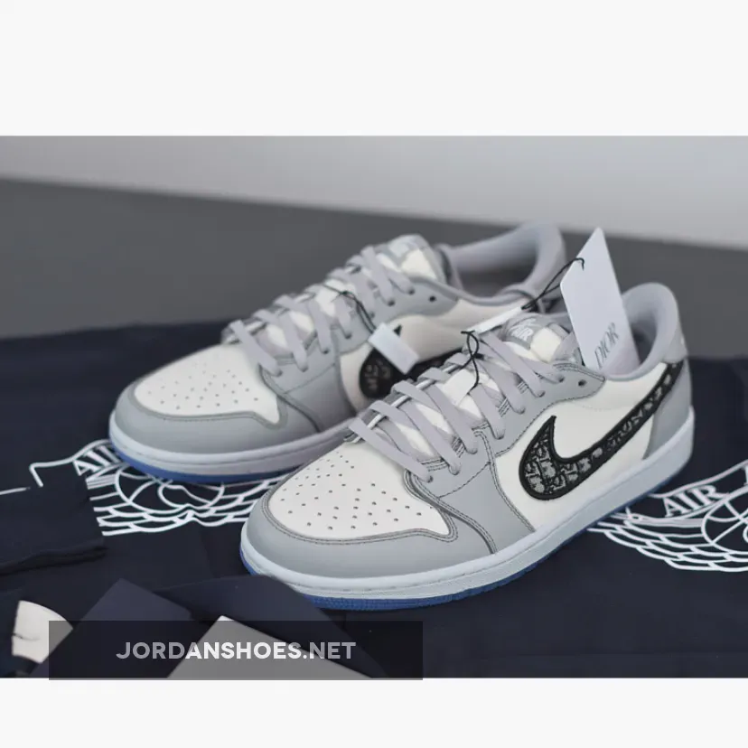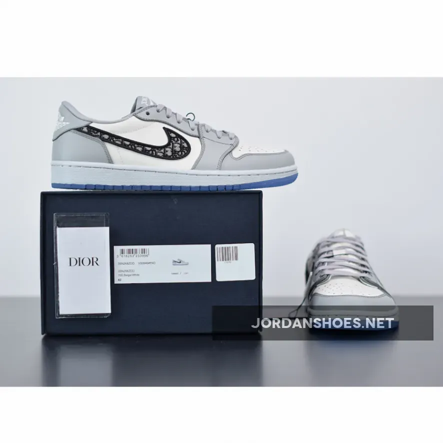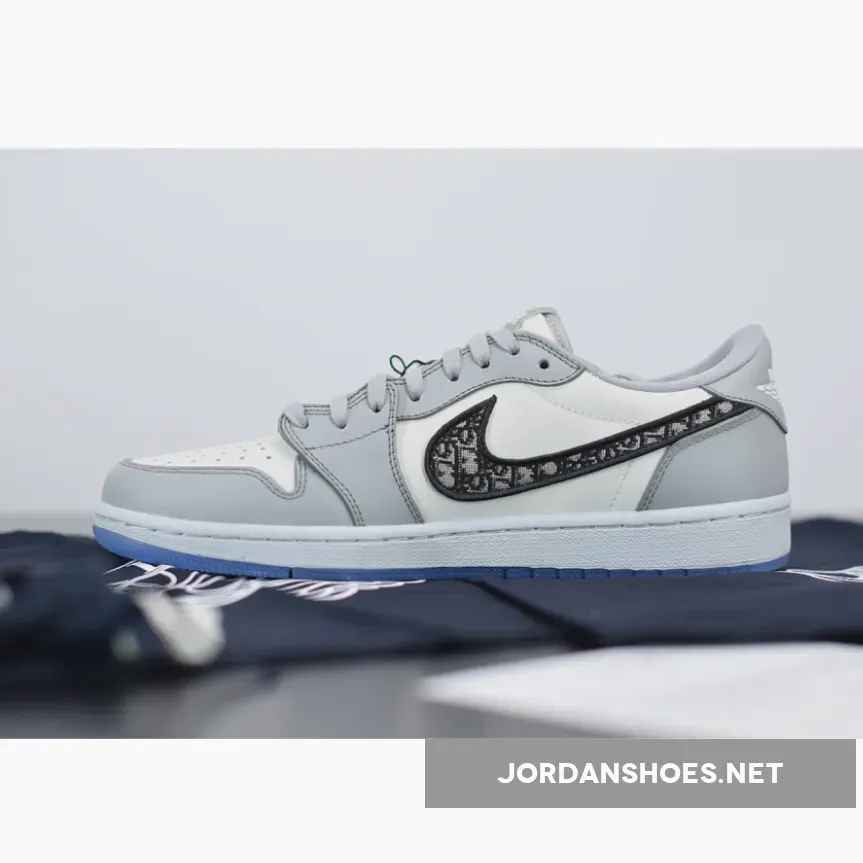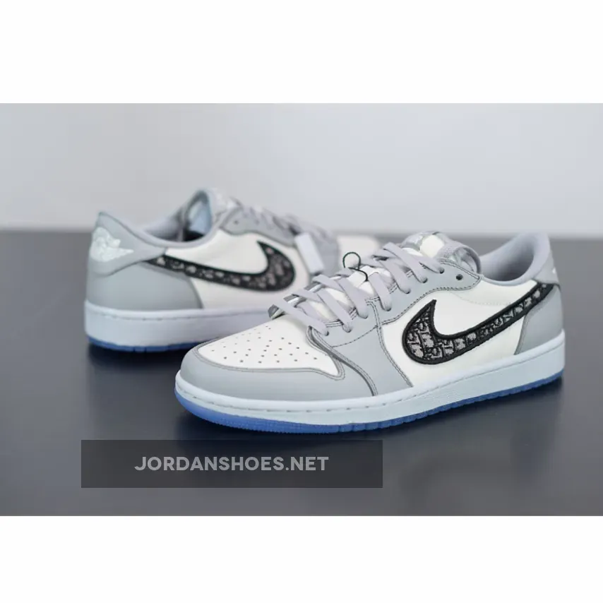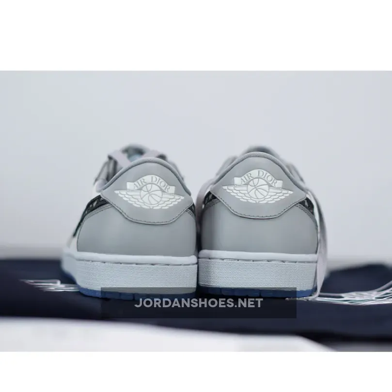 This Dior x Air Jordan 1 Low comes with a similar color blocking and design as the high-top featuring a White and Grey upper with “Air Dior” branding on the tongues and Wings logo on the heel. An all-over printed Swoosh logo on the sides atop a co-branded icy translucent outsole completes the design.