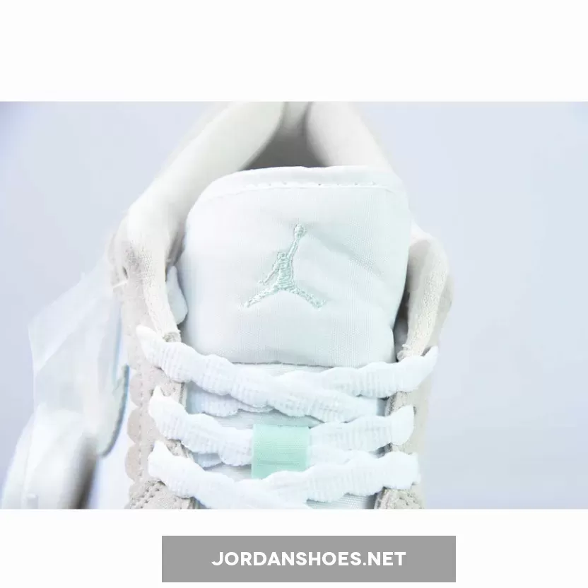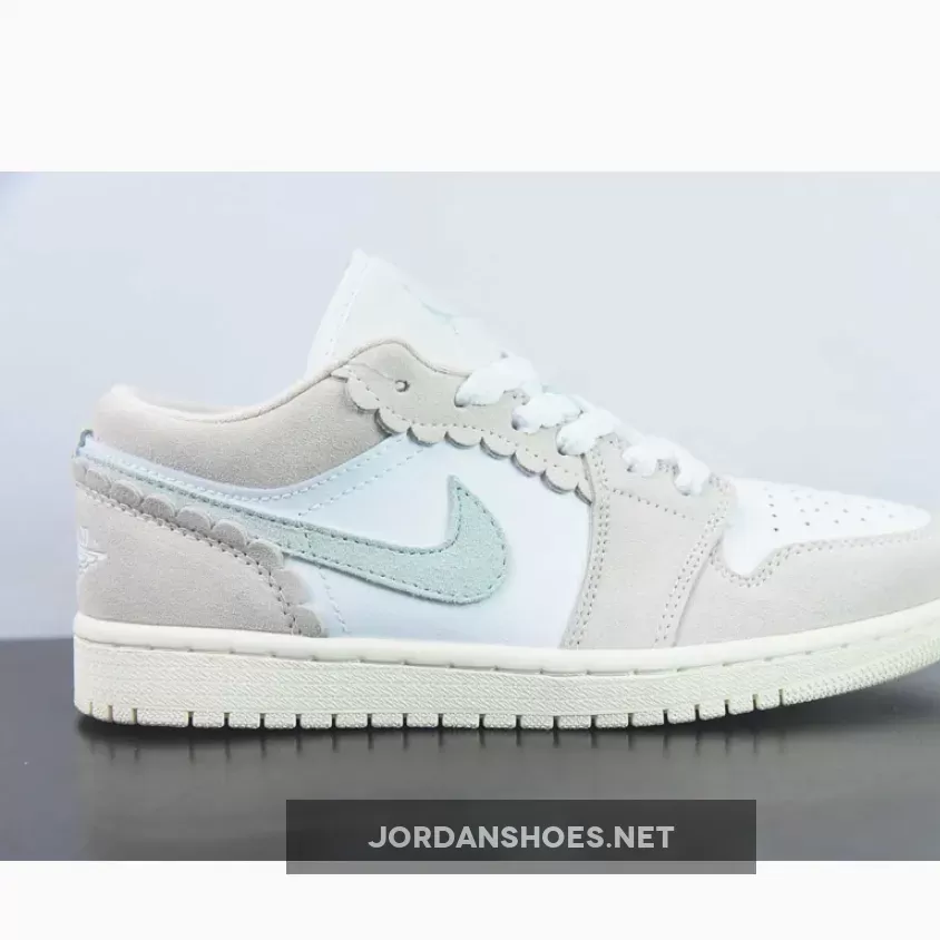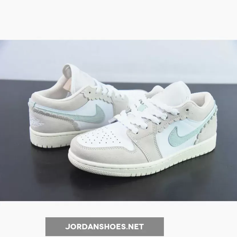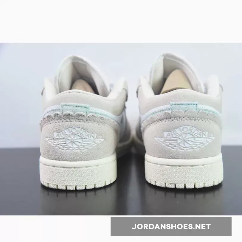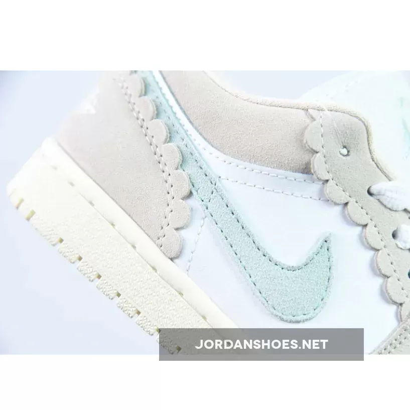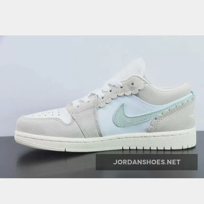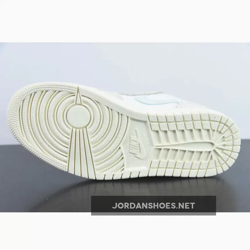 This offering of the Air Jordan 1 Low comes constructed in a mix of leather, suede, and mesh materials. It features a White base, tongue, and laces, with pastel Pink suede overlays with wavy edges on the eyestay and heels. Soft Blue accents on the Swooshes, Jumpman tongue logos, and heel tabs with White embroidered “Wings” in the rear atop a Sail rubber sole completes the design.