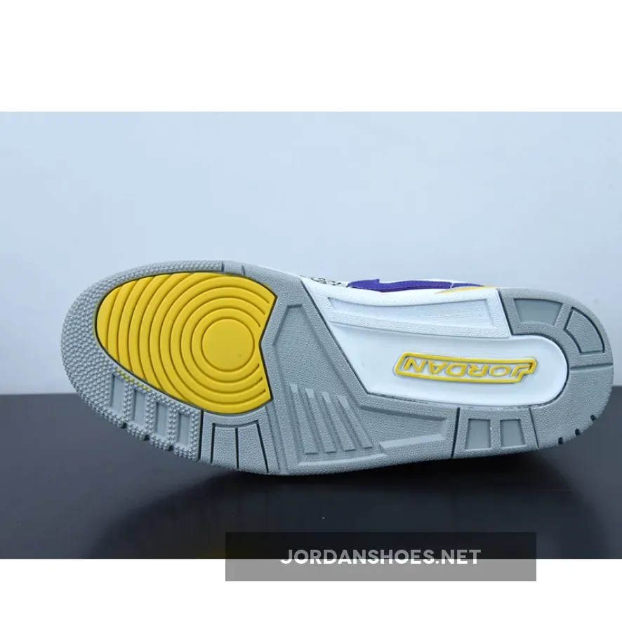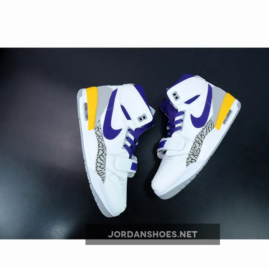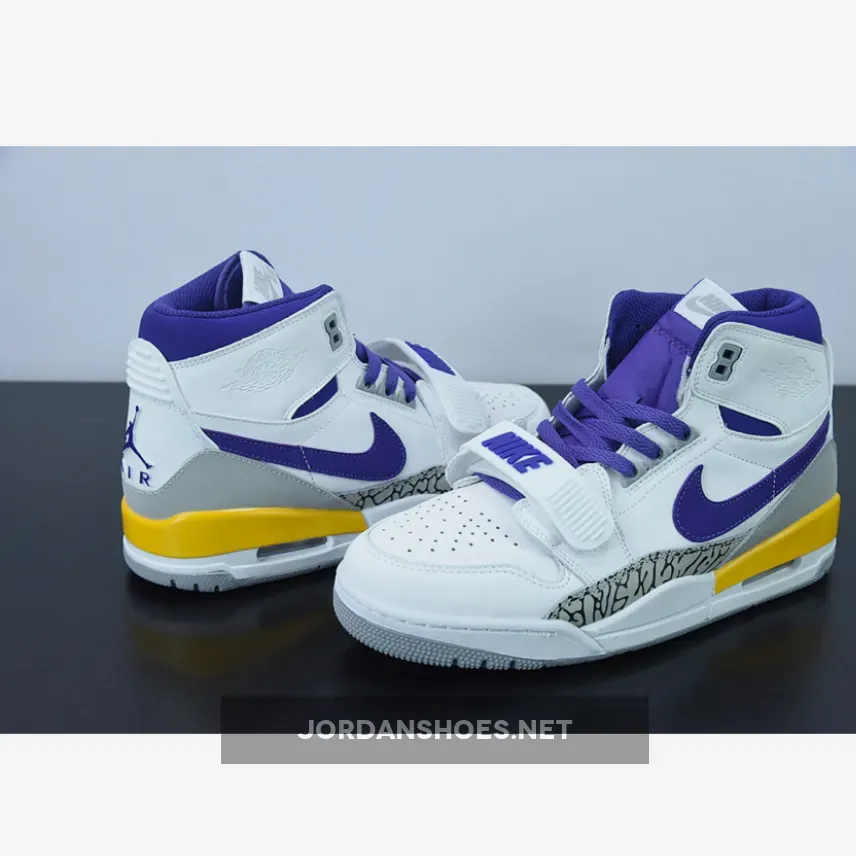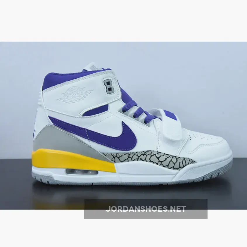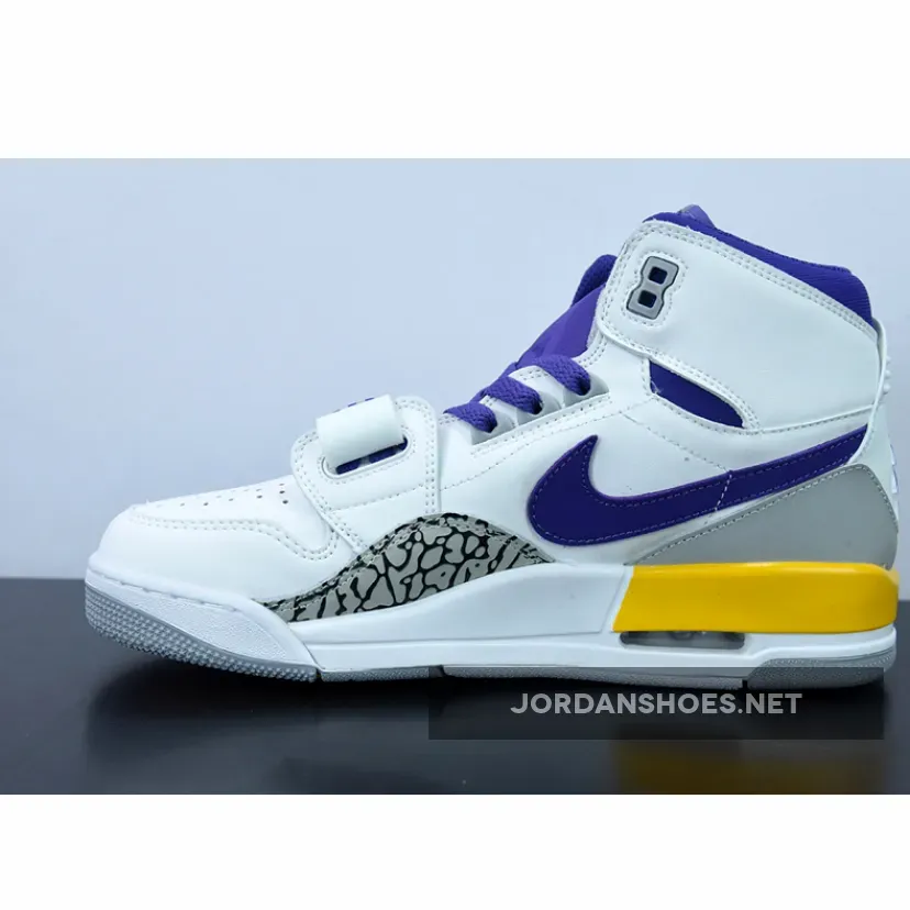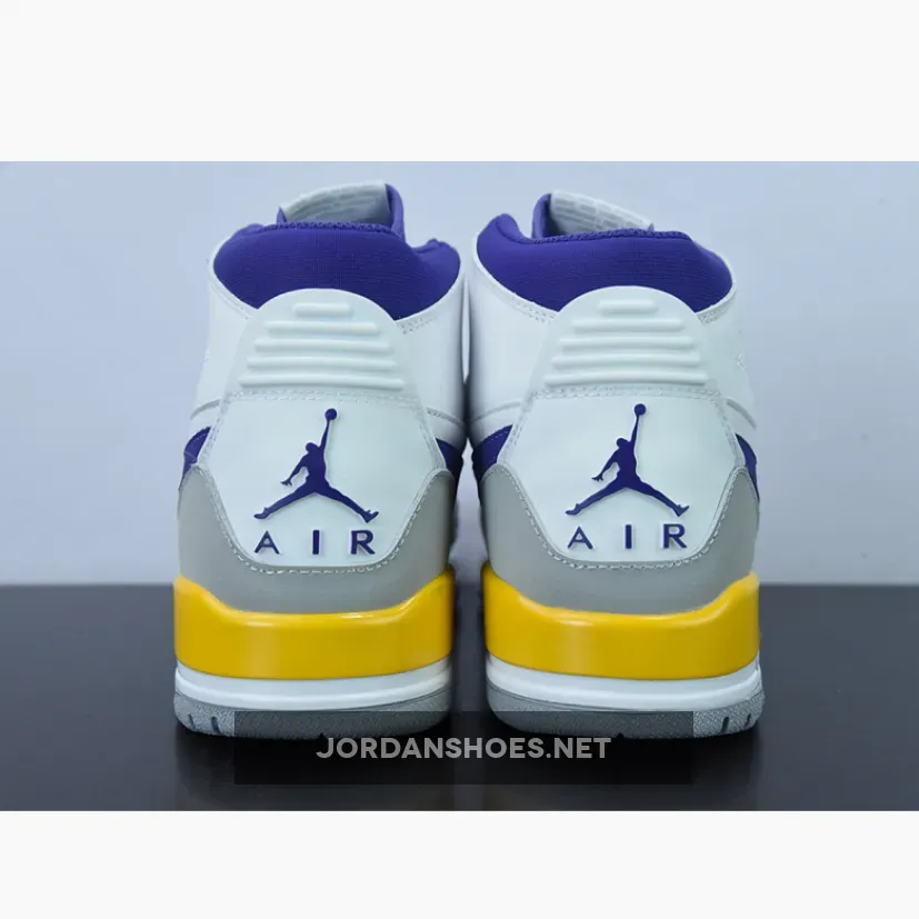Dressed in a White, Field Purple, and Amarillo color scheme. This Don C x Jordan Legacy 312 features a White leather upper paired with Purple and Yellow accents. Other details include Grey suede wrapping around the lower heel, along with its signature elephant print.
