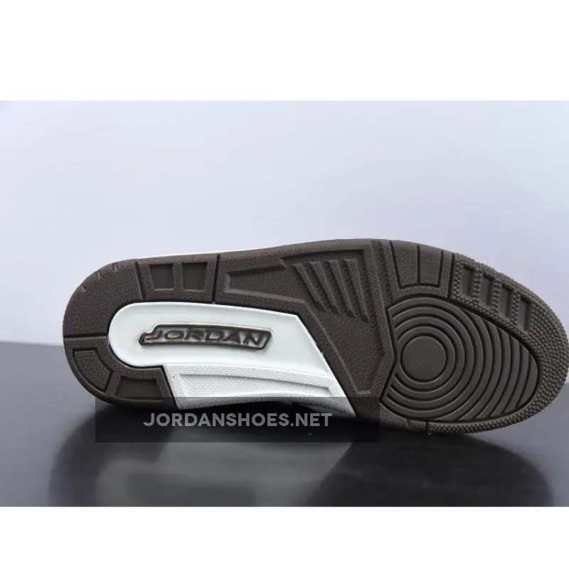 Light Cocoa hues determine the smooth leather mudguard and forefoot strap while balancing the Air Jordan 3-inspired heel tab from opposite ends.