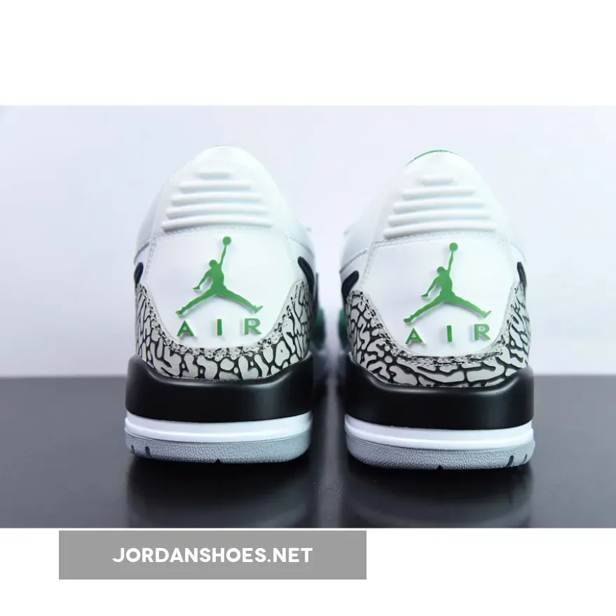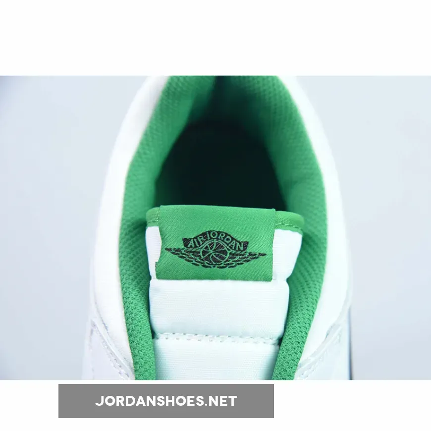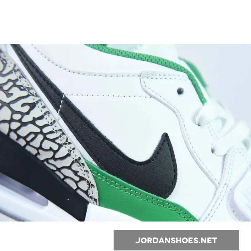 the pair embarks on a lightened take on the iconic color blocking, exercising crisp white leather uppers contrasted in seldom along the jet-black Swoosh and heel mudguard.and the vibrant green accents consume the sock liner, tongue trim, mid-foot overlay and branding atop the forefoot strap and Jumpman affixed to the heel for an illuminated finish.