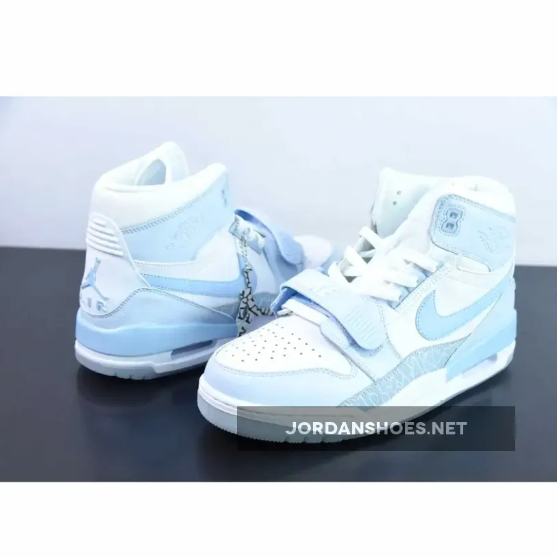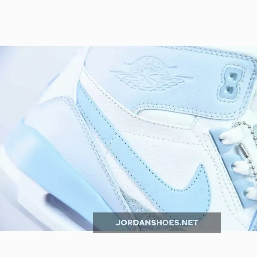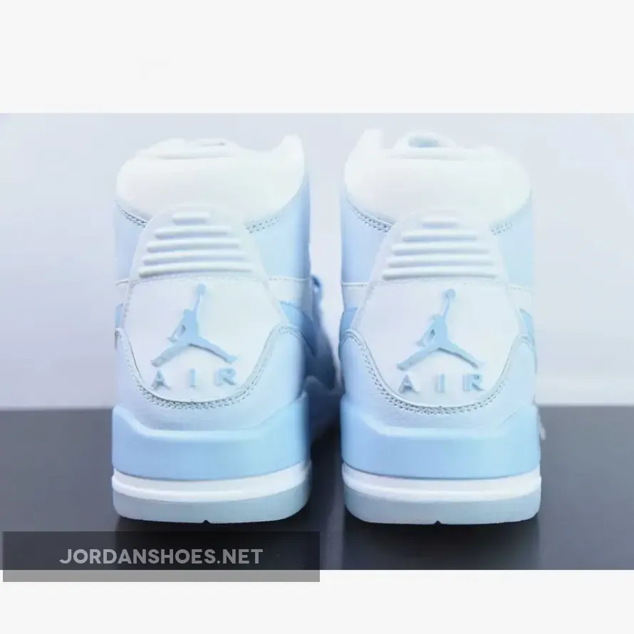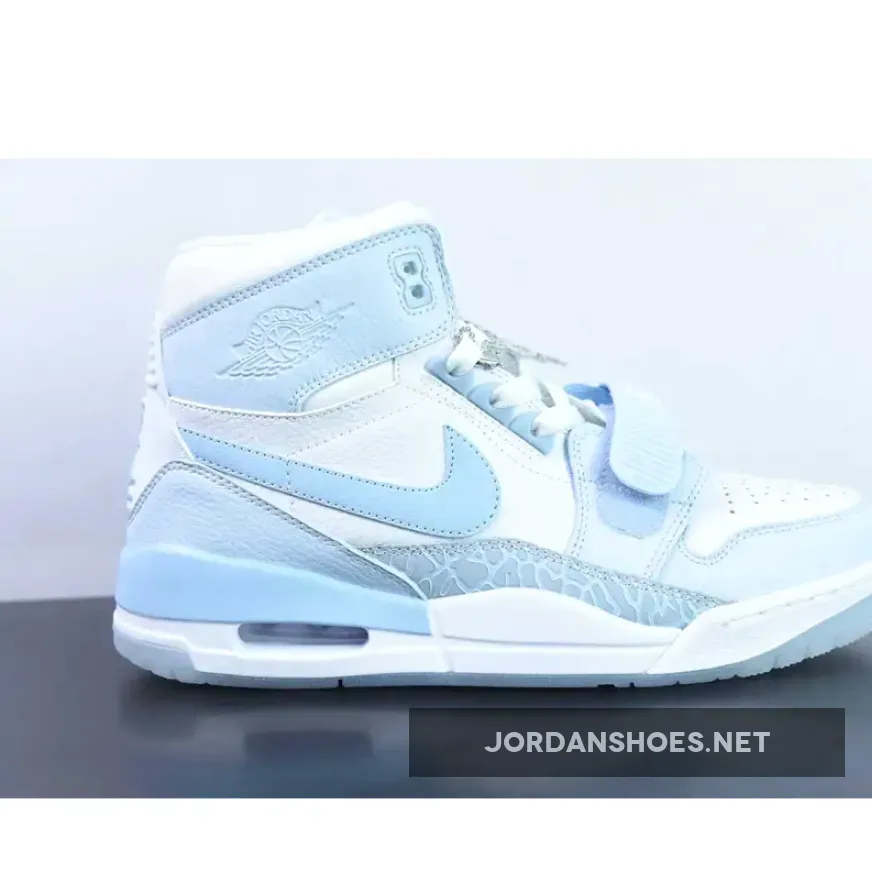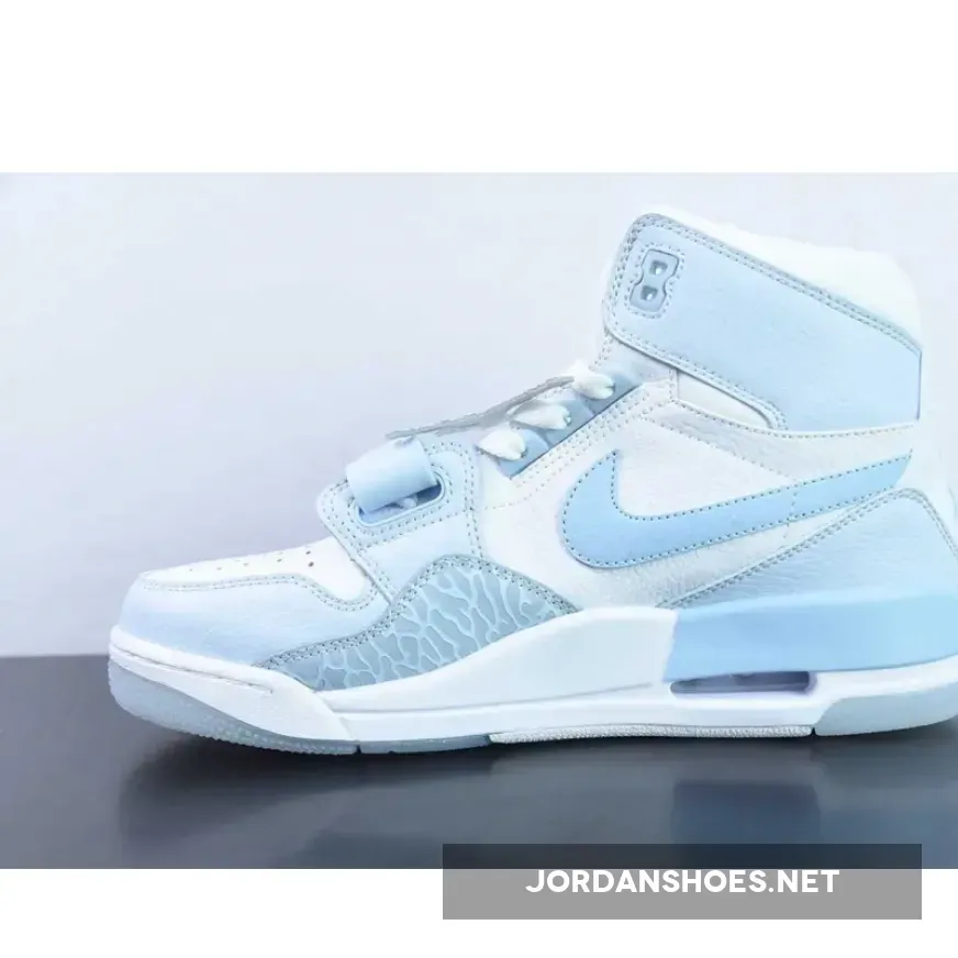 The Jordan Legacy 312 “Arctic Blue” sneakers stand out with their unique combination of materials and colors. The upper is crafted from quality leather, providing a durable and stylish base. Donning a “colorless” base and light blue contrast around the forefoot, along the tongue, and across the heel.