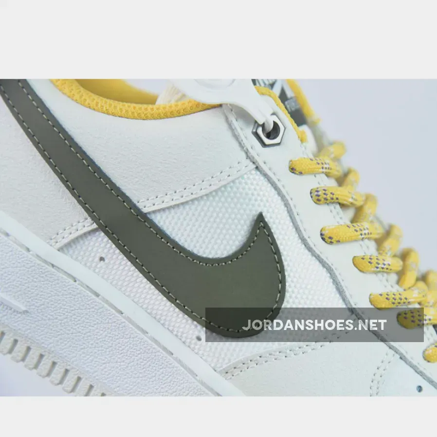 Done in Light Bone, Cargo Khaki, Summit White, and Vivid Sulfur, this Nike Air Force 1 Low starts off with Summit White on the base with leather noted on the toe box and mesh placed on the side panels.