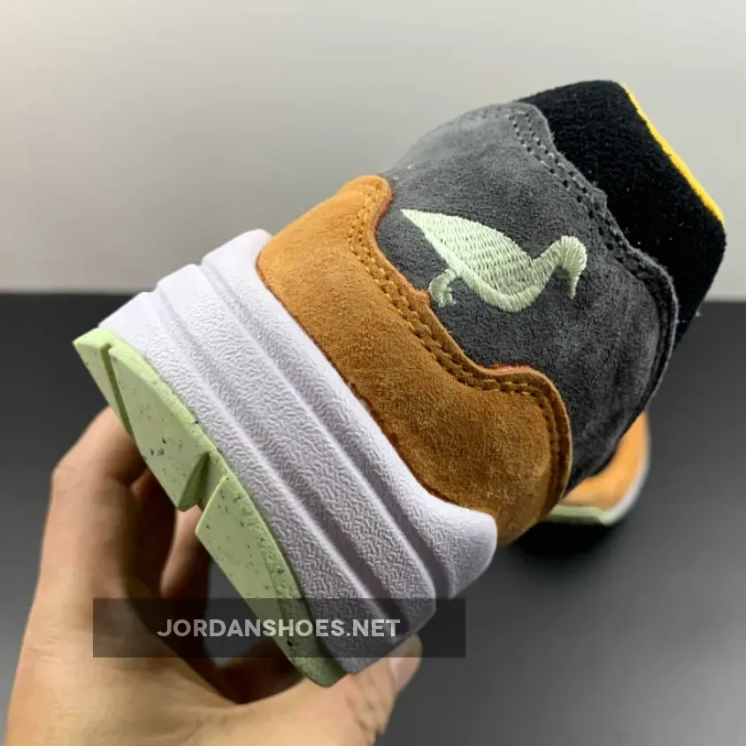 Crafted with premium suede materials, the sneakers boast a color combination that invokes the aforementioned collection’s “Ceramic” pair: “Kumquat” and “Honeydew” animate mudguards, profile swooshes, and other supporting accents, while “Black” and “Anthracite” cover the majority of the Air Max‘s center panels. The cushioning and traction solution underfoot maintains a relatively straightforward arrangement, with midsoles favoring a “White” look. Visible Airbags and waffle-patterned tread revert to “Honeydew” flair. Lastly, a duck figure is embroidered onto each shoes’ spine, rounding out the “Ugly Duckling” theme.