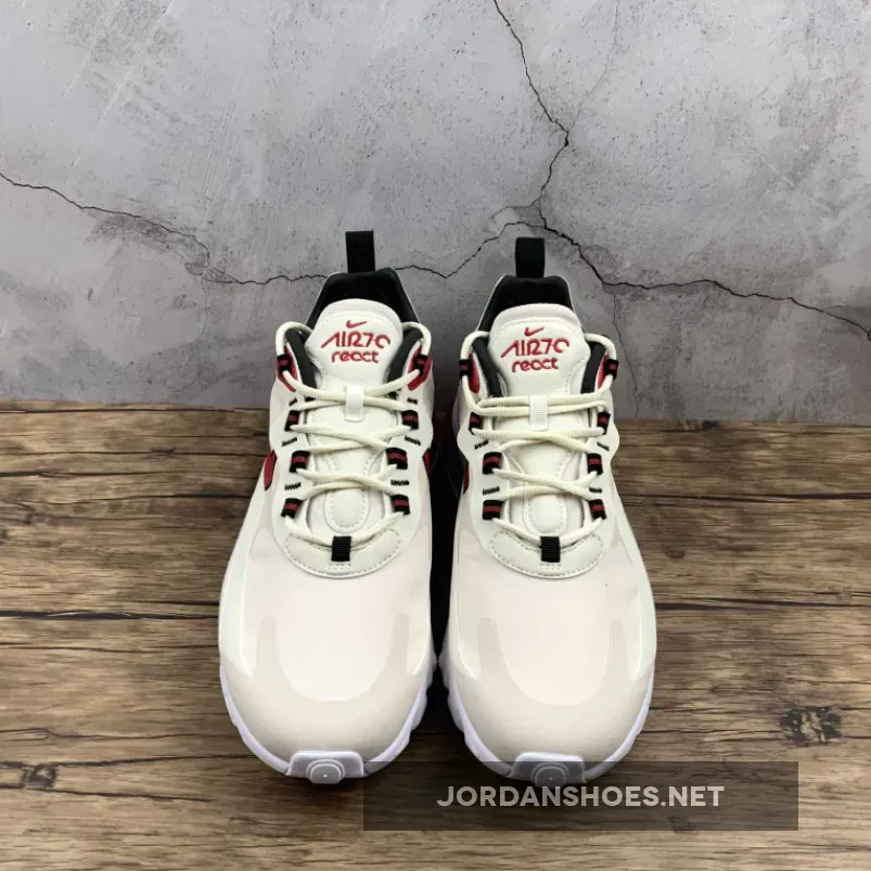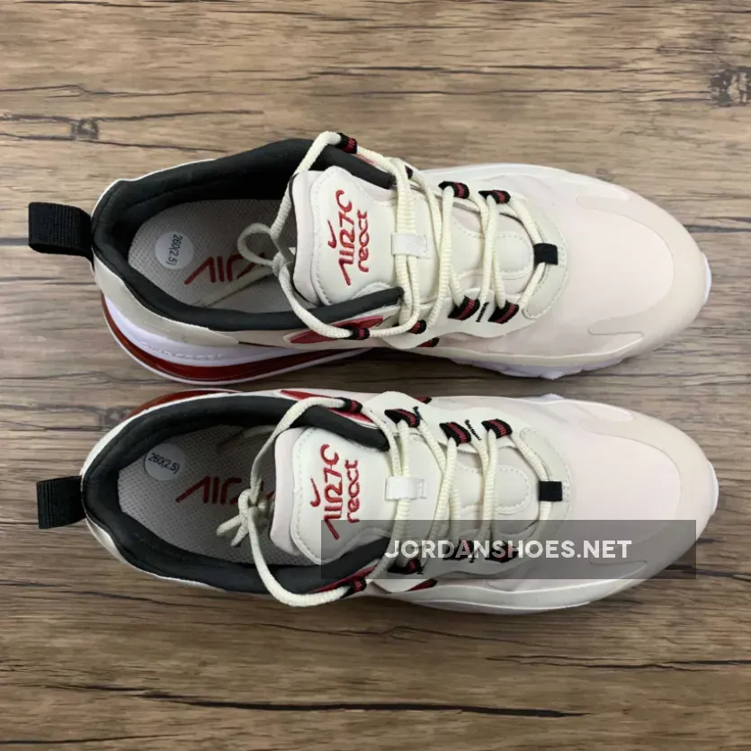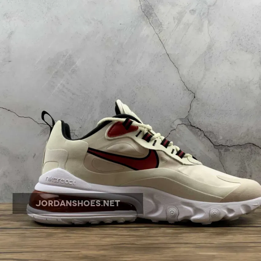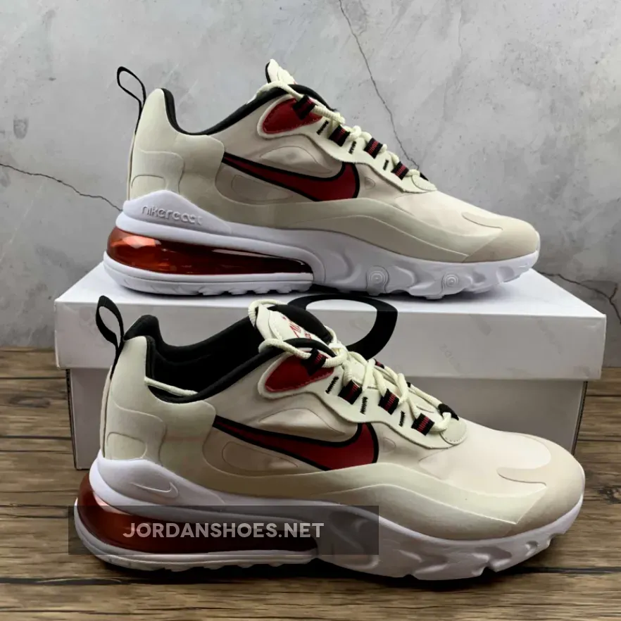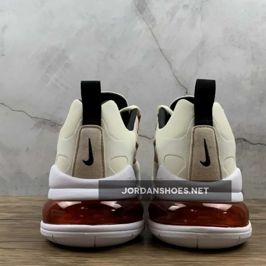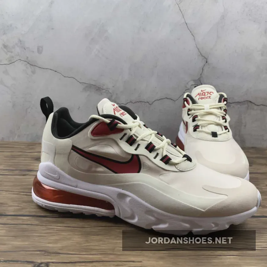 This offering of the Nike Air Max 270 React features a Light Orewood Brown and Sail upper with suede overlays. Highlighting the shoe are Cardinal Red accents paired with Black lining atop a White React sole.