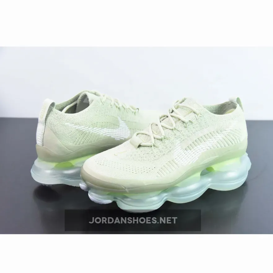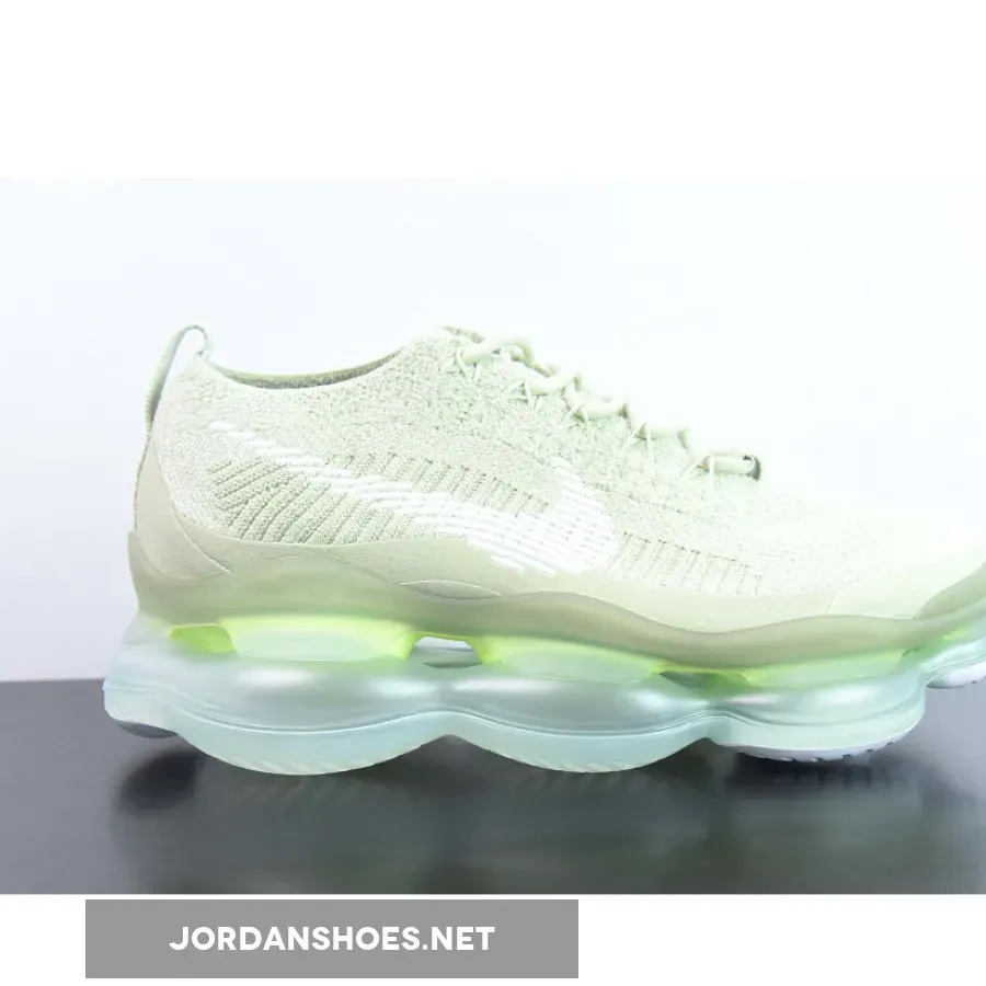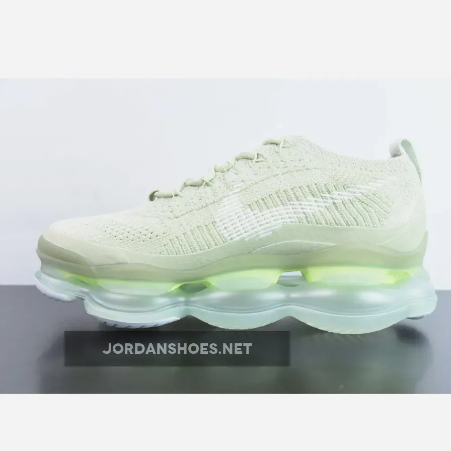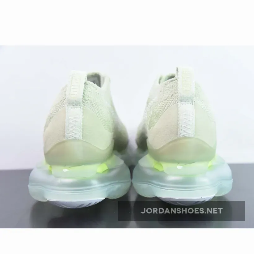 The shoe’s unique Flyknit chenille upper appears in a soft green hue that reaches from the toe cap to the heel tab. White branding elements provide contrast with its Swooshes on each side and dotted branding at the tongue and heel tabs. Tonal mini Swooshes also arrive in front of the lacing system and at the heel’s midsole. Its signature oversized sole unit is packed with Air technology in a translucent white presentation to complete the look as the brand describes it as using enhanced Air that offers “tomorrow’s comfort today.”