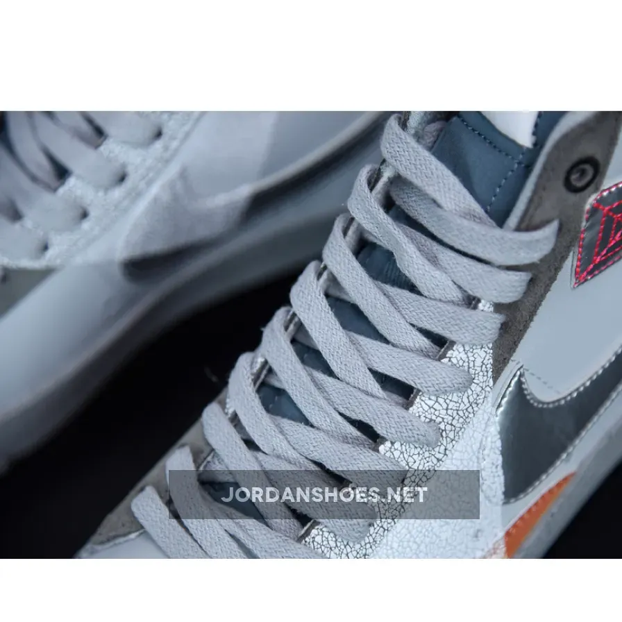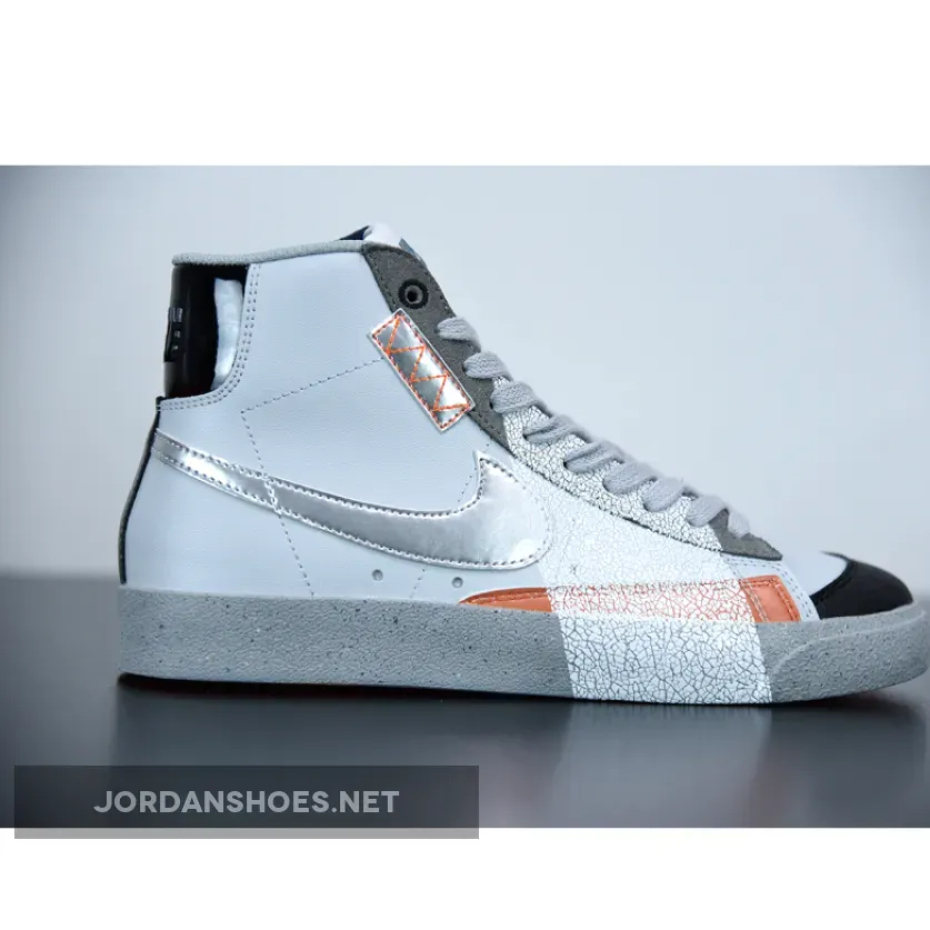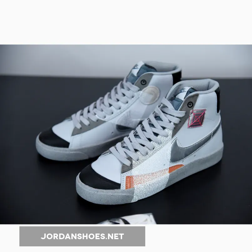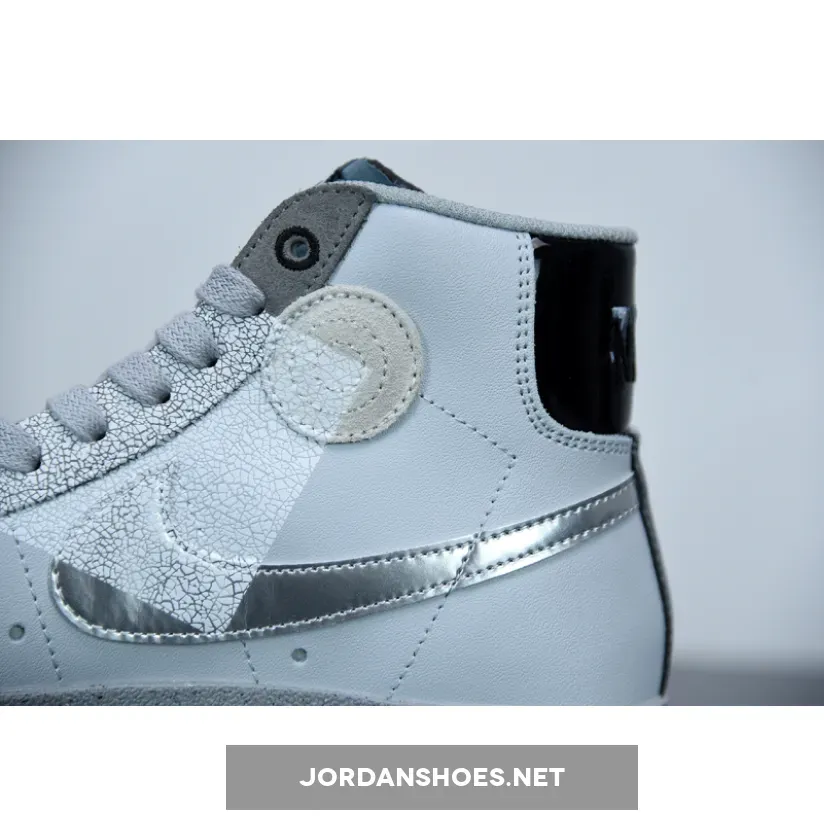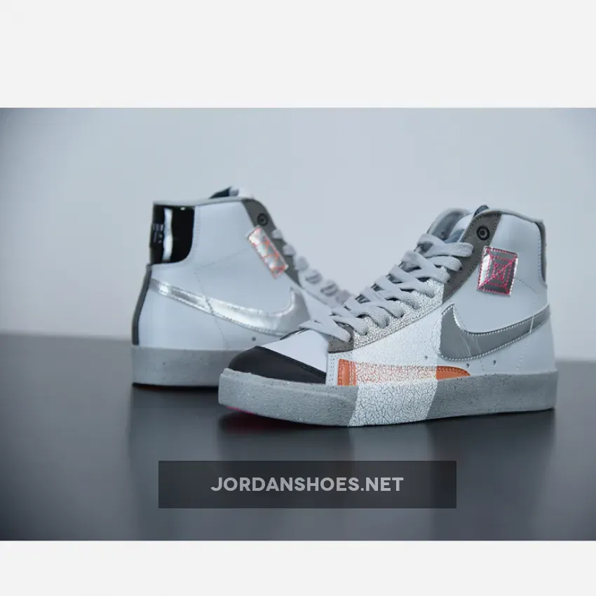 Clad in various shades of grey and blue, the mid-top Blazer makes a statement with the assortment of metallic silver accents throughout its upper. Suede along the forefoot and tongue not only deliver varying texture, but also color-blocking to the pair, with the former sporting a bright orange. The latter features a white paint stroke from lateral midsole to medial midfoot, adding a crackled finish to the lace guard and swoosh it covers. Appropriate for the experimental take, “NIKE” branding on the heel is double-layered, with the text underneath boasting a larger size and reverse orientation. Sole units revel in a midsole slightly reminiscent of the Space Hippie line and vibrant pink tread. Finally, sockliners are branded with “沪”, which translates to the “Shanghai, China” and a swoosh logo.