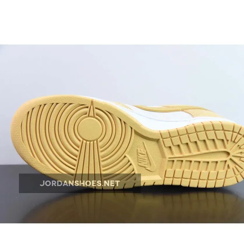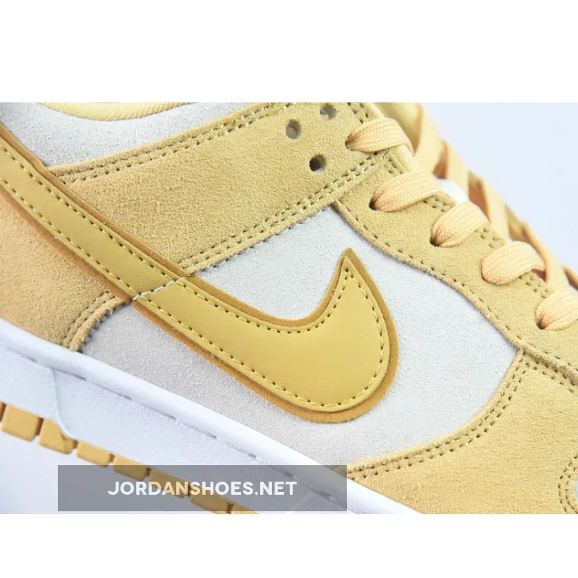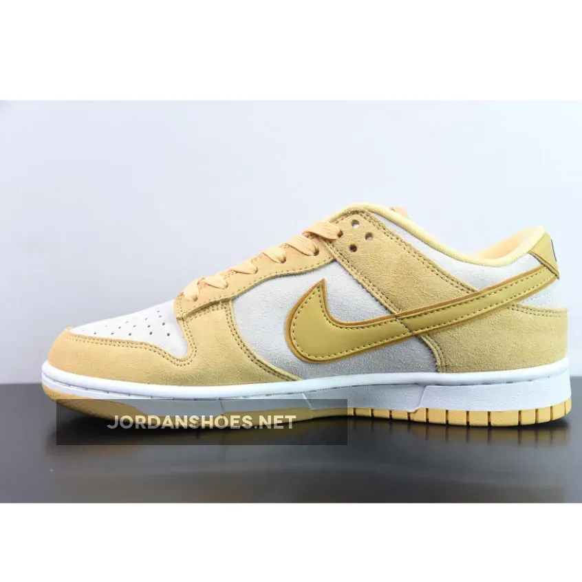 This Nike Dunk Low may be named Gold Suede, but there is more to it than just gold. With the side panel, toe cap and parts of the heel in soft shade of off-white, the gold suede overlays on mudguard, eyestay and heel highlight the construction of the sneaker and allow it to shine. Yellow Gold patent makes an appearance on the iconic Swoosh and the rectangular logo patches on the tongue. A fresh white midsole is stitched to the upper, and grounded by an outsole that perfectly matches the Gold Suede details. The Nike logo is stitched in black on the gold collar patch for maximum effect. Double and triple stitching on the heel emphasise the quasi-artisanal quality of this coveted sneaker.