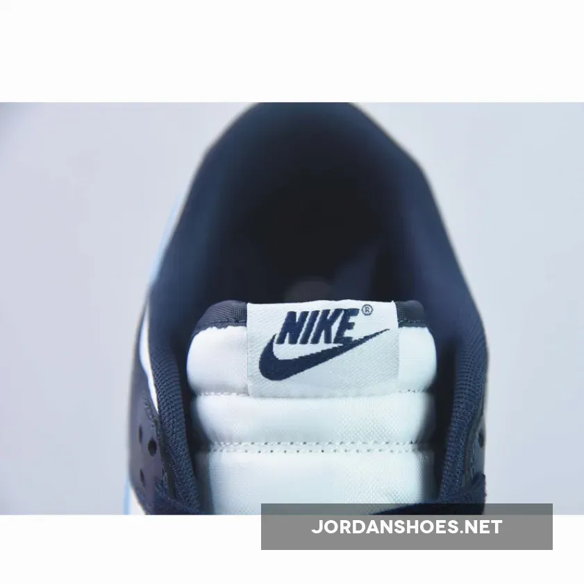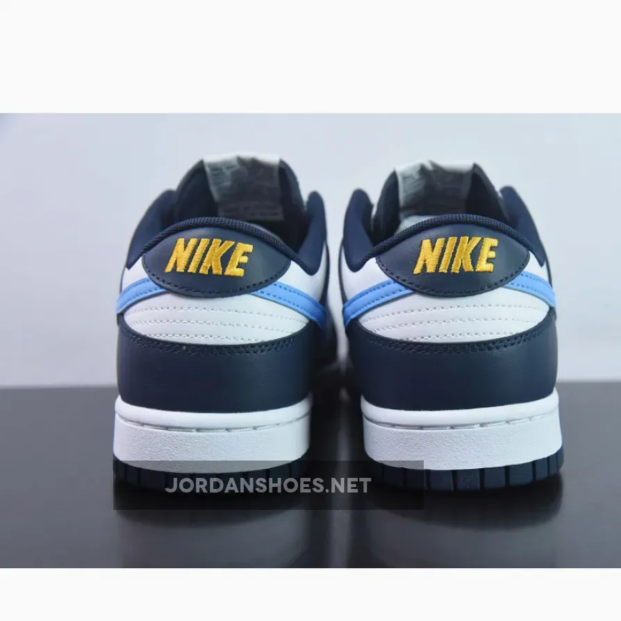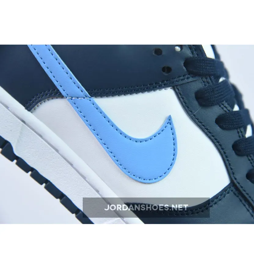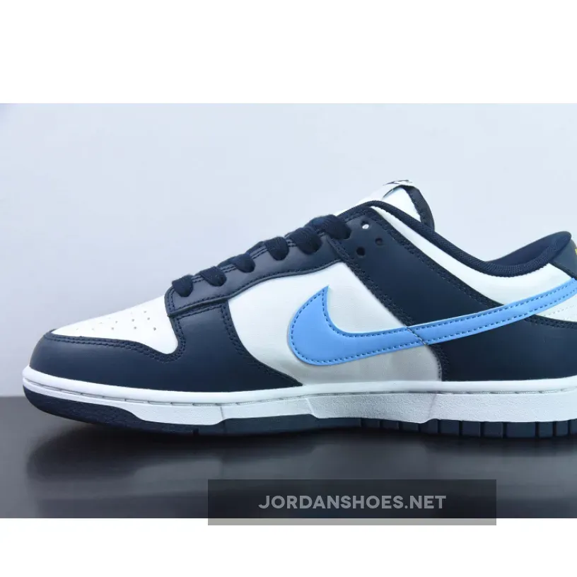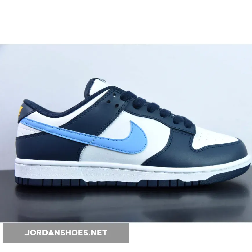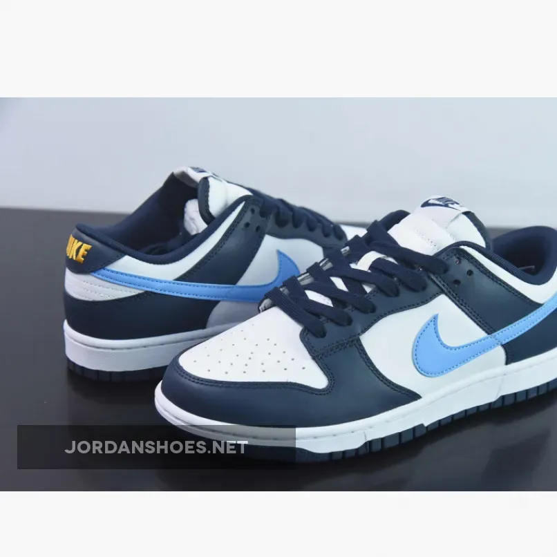 This low-cut Dunk has a smooth leather base in pristine white. The leather overlays on the toe cap, mudguard, eye stay panel, foxing and heel tabs are all in a dark navy blue, matching the tongue lining, mesh sock liner, tongue branding and insoles. “University Blue” is then applied to the Swoosh as well as the logo hits atop the insoles, while orange threads highlight the “NIKE” embroidery stitched into the heel tab. A white midsole and a navy rubber outsole finish off the look of this sneaker.