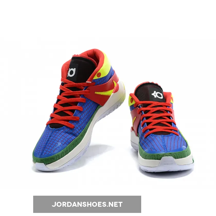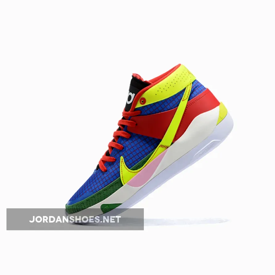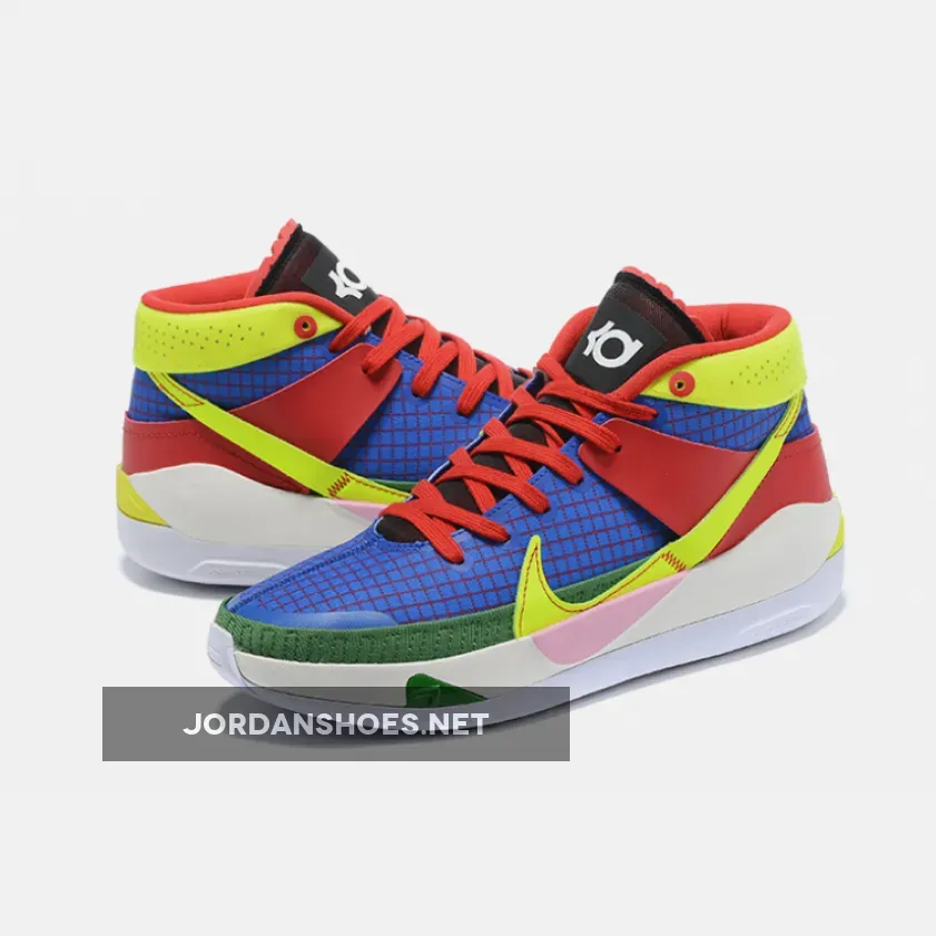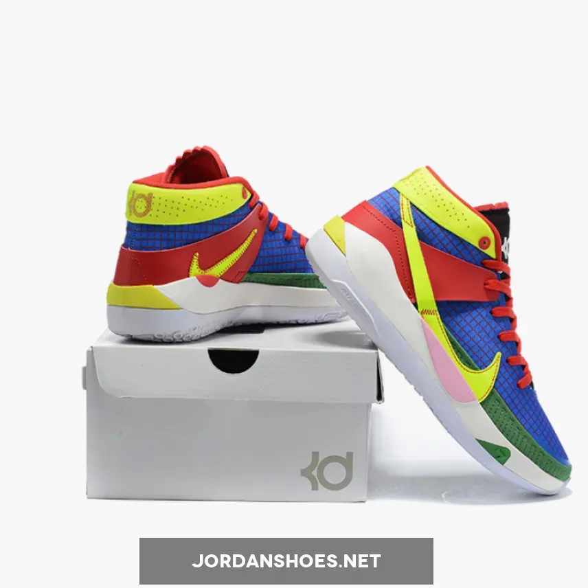 Going over this Nike KD 13, it utilizes splashes of different colors for a playground like feel. Highlighted with Blue on the upper while Red grid patterns runs across it. Following we have Green on the trimming along the forefoot while both Red and Volt is spread throughout. Some of the other details includes NY vs NY on the insoles while White covers the midsole and most of the rubber outsole.