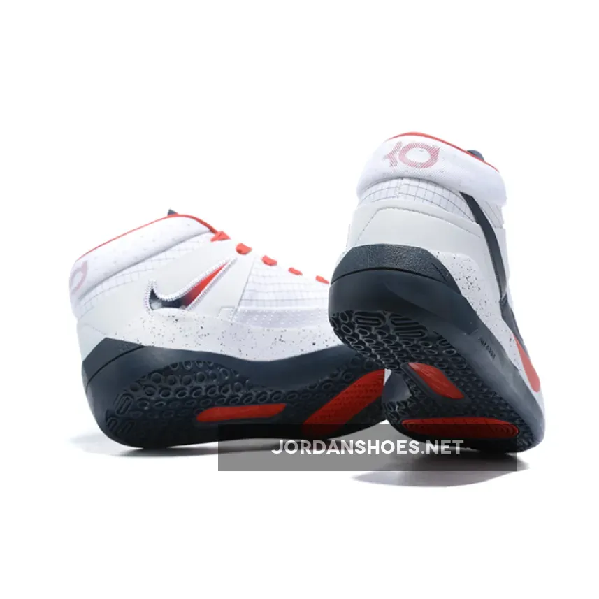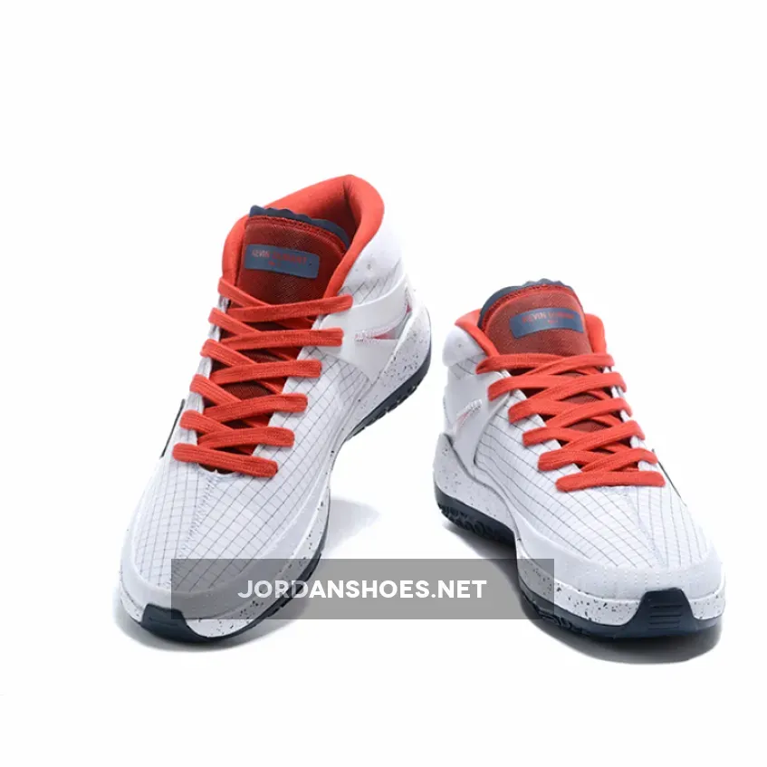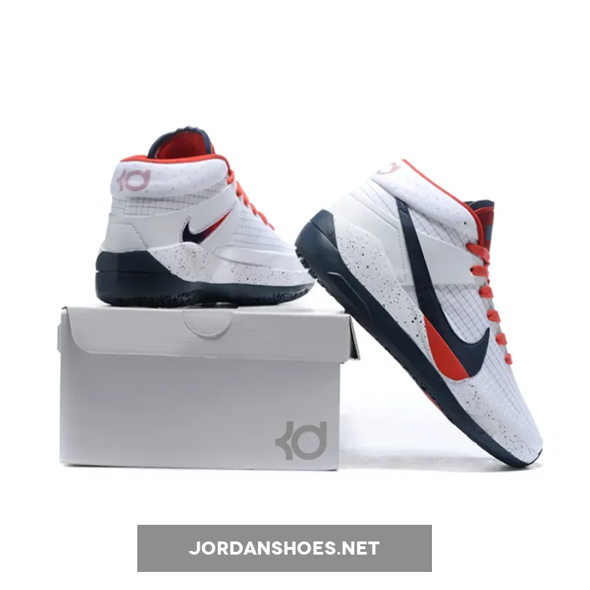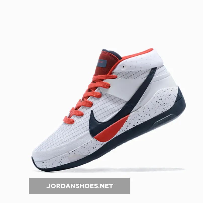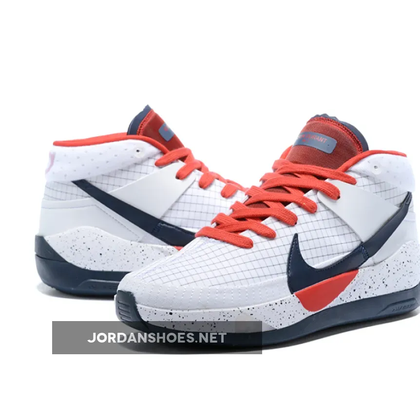 this Nike KD 13 comes with White across the upper along with a grid pattern. Following we have Red on the tongue, liner, laces, KD logo on the heel and outsole. In addition we have Navy leather on the lateral side with a gradient stitched Swoosh logon the medial. Other details includes a speckled midsole and a Navy rubber outsole.