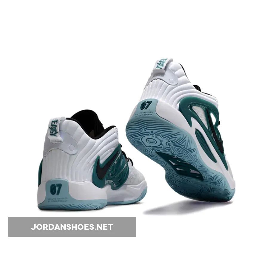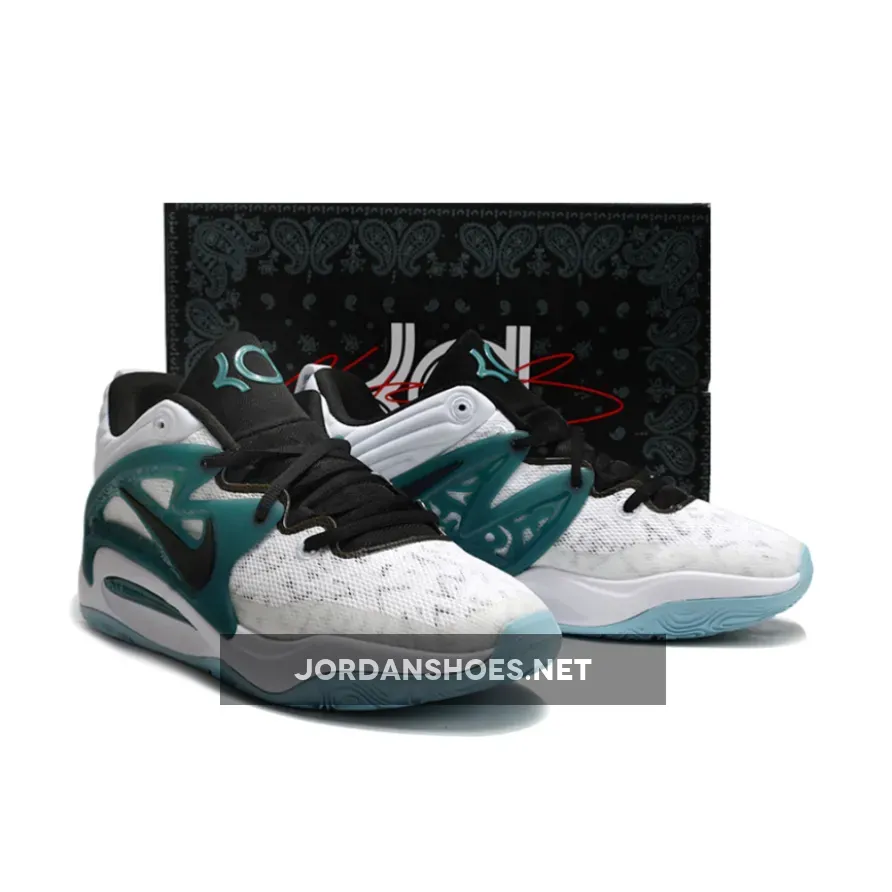 This flavor of the KD 15 features a combination of White and Light Grey throughout the multi layered mesh construction on the upper which is then contrasted by Black and Teal accents on the cage overlay, tongues, laces, inner liner, and the KD and Nike branding throughout.