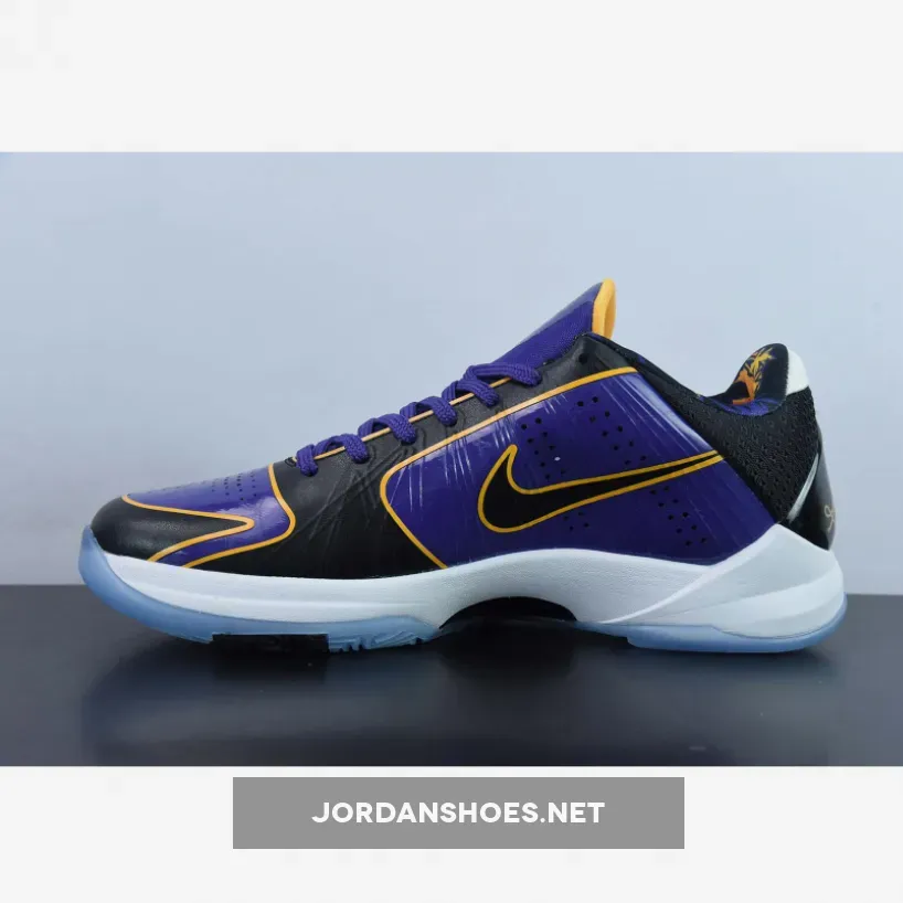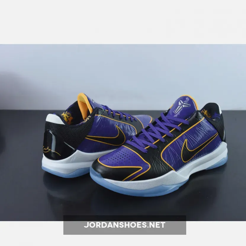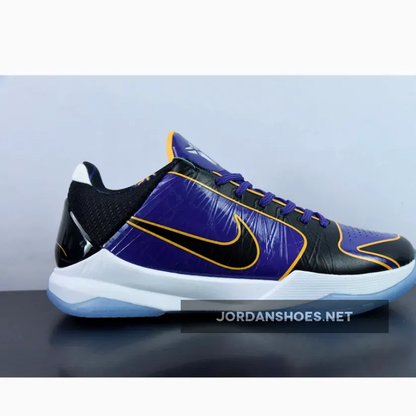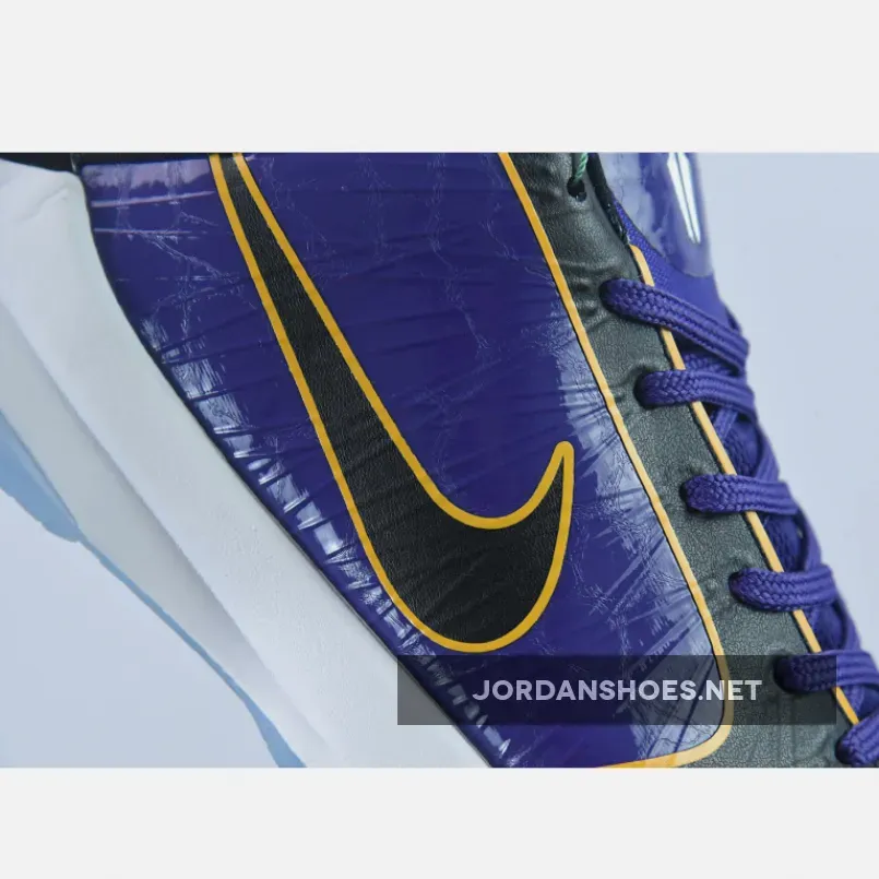 As a nod to the championship-themed jackets that Kobe Bryant was seen wearing after his second and third NBA championships, this Nike Kobe 5 Protro “5X Champ” wears the Los Angeles Lakers’ team colors with a textured purple upper paired with black with gold accents. Other details includes a snakeskin patterned on the Black heel counter with Metallic Silver Kobe branding on the tongues. A White midsole atop an icy translucent outsole and Lakers-themed graphic insoles completes the design.