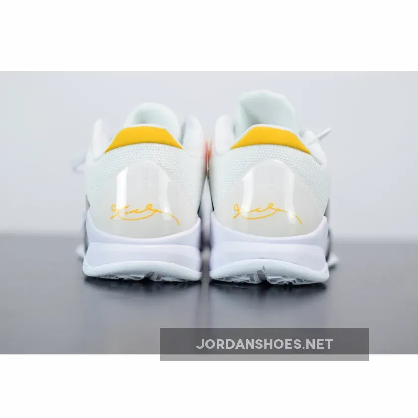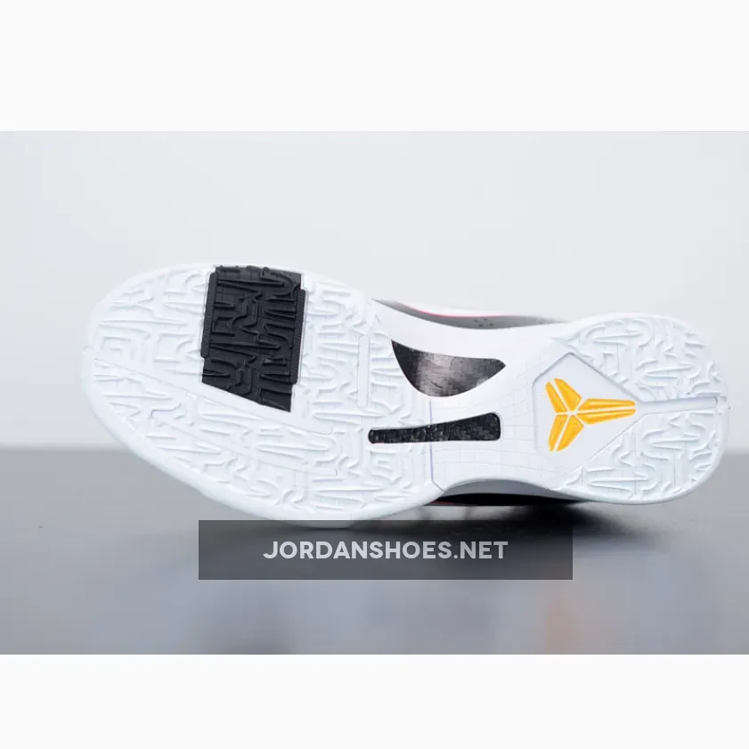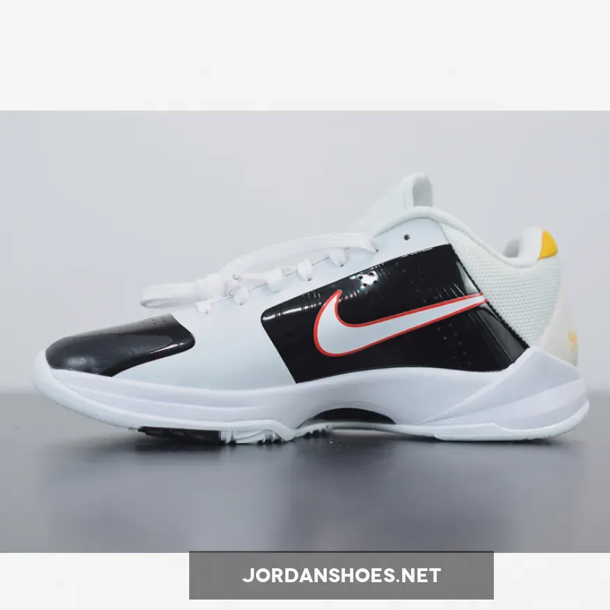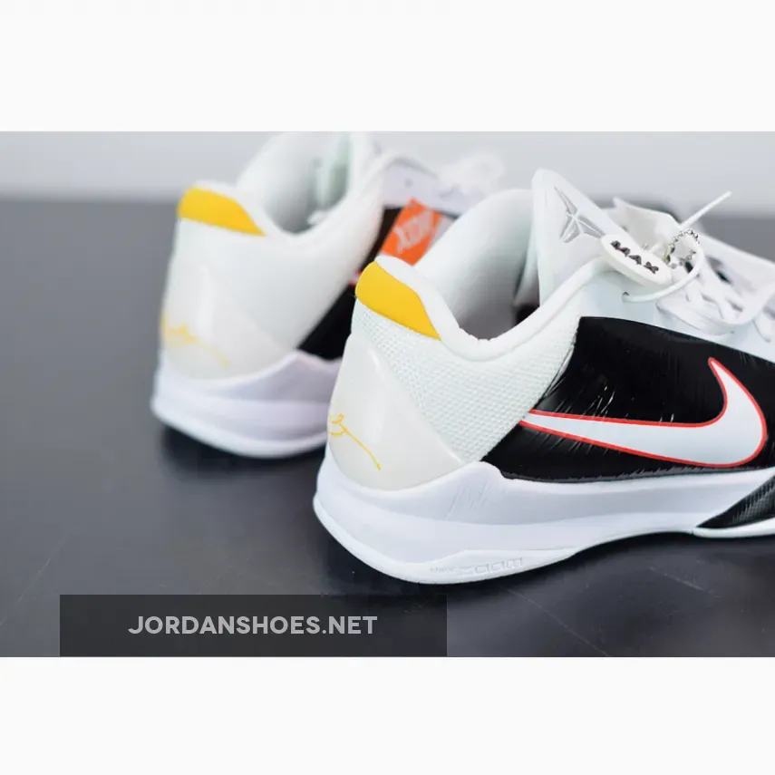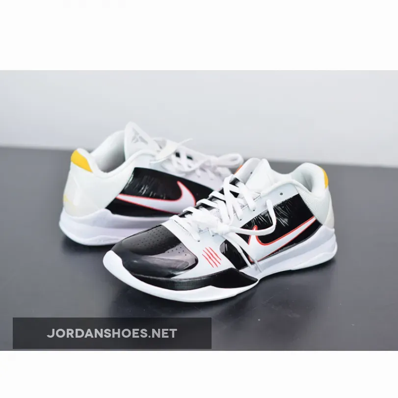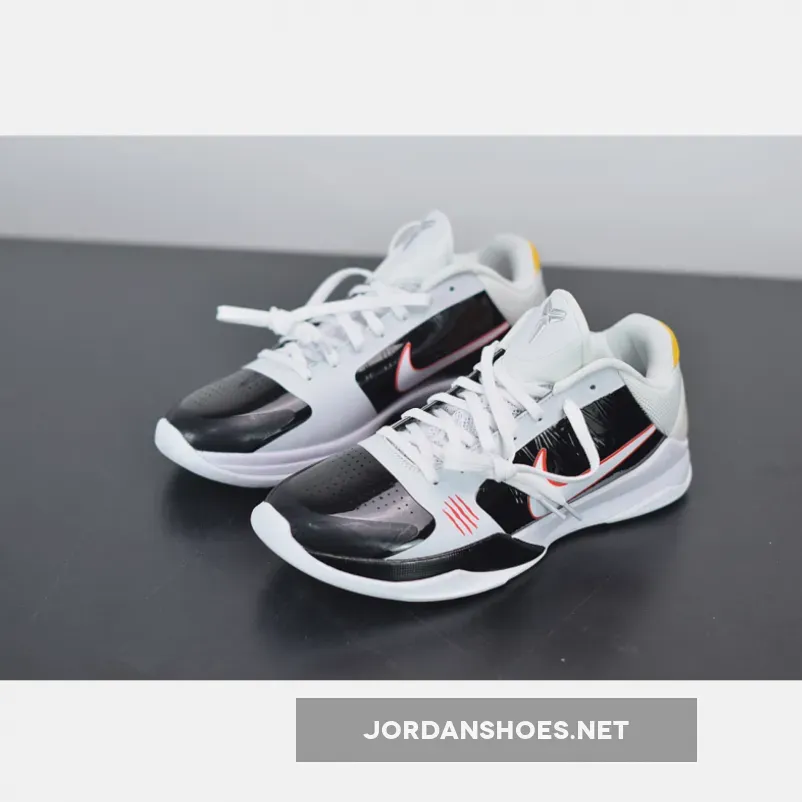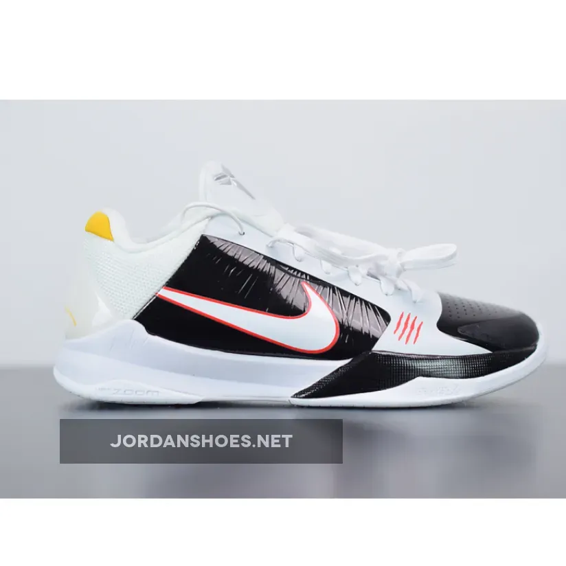 The Nike Kobe 5 Protro Bruce Lee Alternate Men's shoe with SKU CD4991-101 is a black and white take on the original. The upper is made up of black and white paneling, while hits of red can be seen outlining the Swoosh and on the lateral side scratch marks, tributing Enter the Dragon. A white and black Zoom sole, yellow heel cushioning, and silver Kobe branding on the tongue completes this alternate design. The shoe is inspired by Bruce Lee and is a second Bruce Lee inspired colorway of Kobe Bryant’s fifth signature performance basketball shoe with Nike.