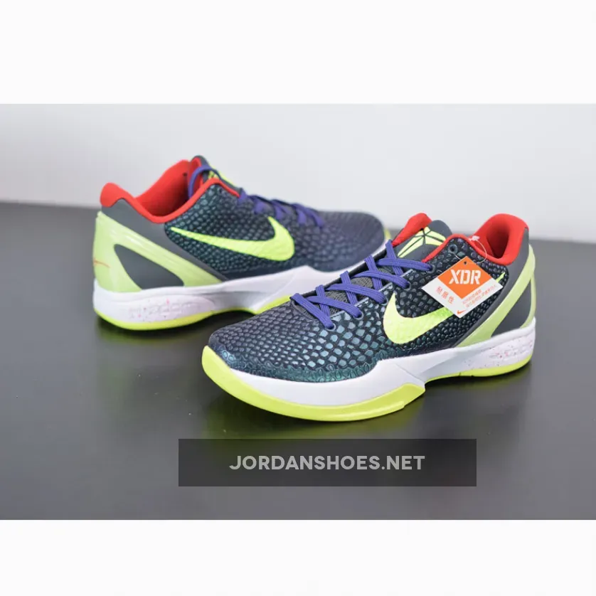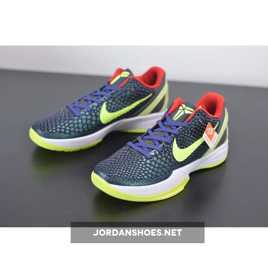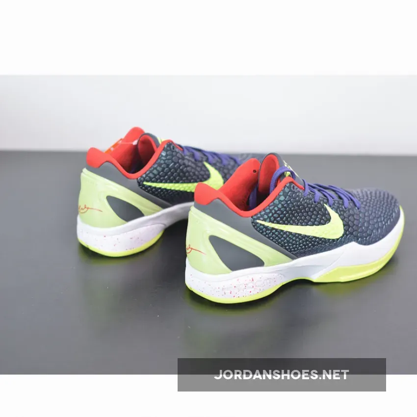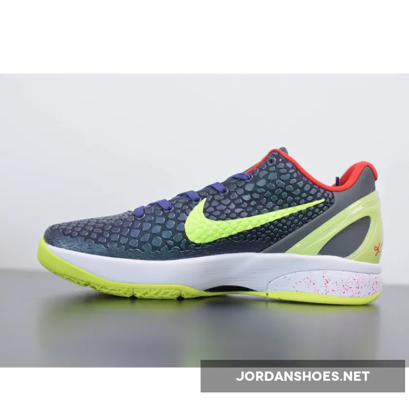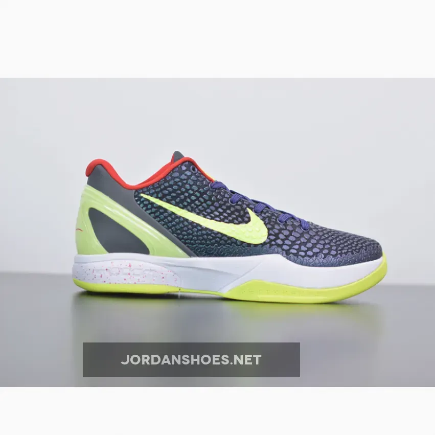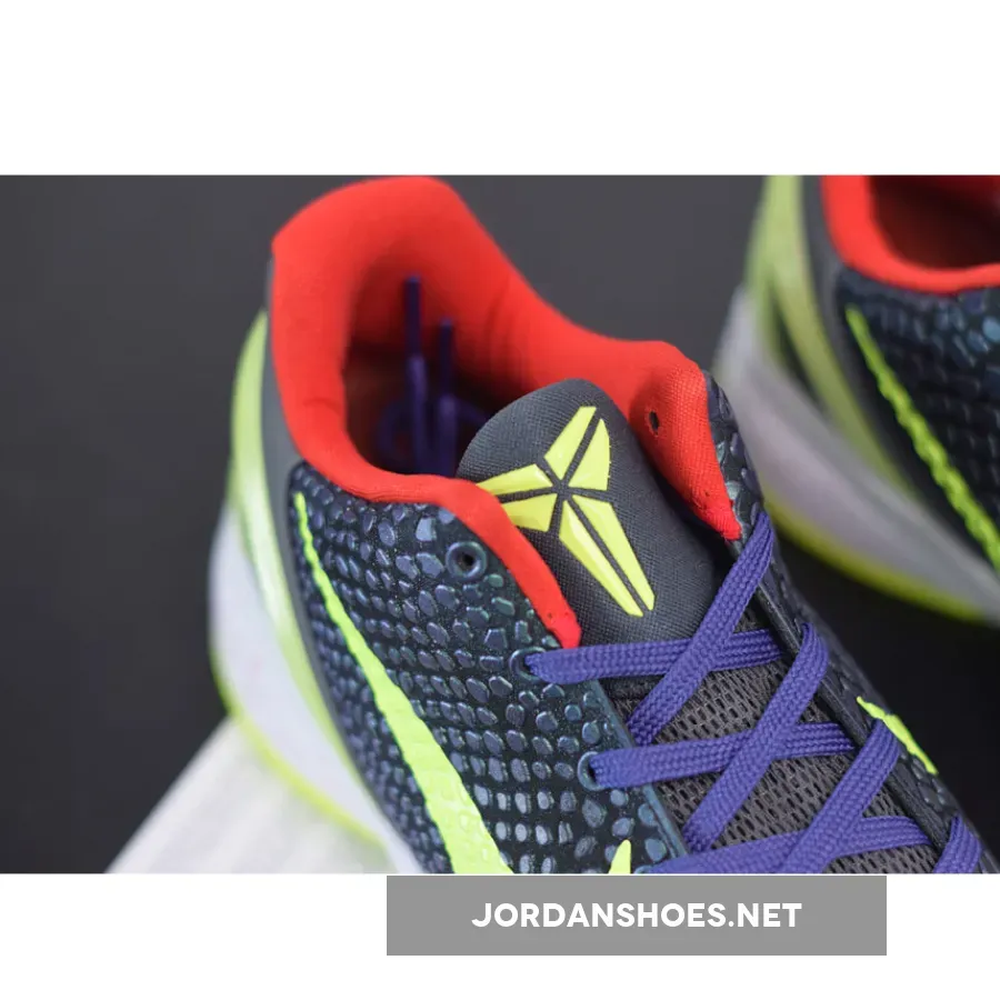 Inspired by DC Comics villain The Joker, the “Chaos” edition of the Nike Kobe 6 Protro features a snakeskin-textured upper with a chameleon finish and Purple laces. Volt Green accents on the Swoosh, Kobe tongue logo and outsole, with Red appearing on the liner and speckling at the White midsole completes the design.