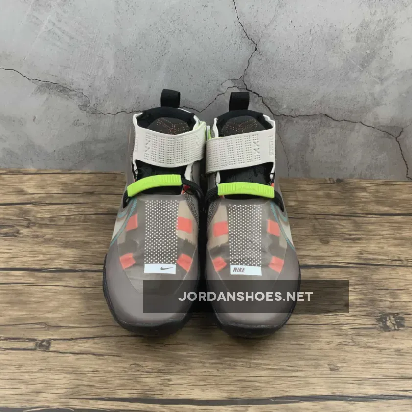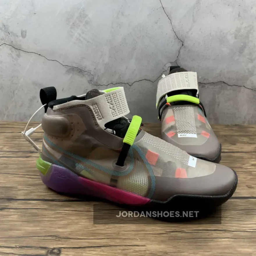 A product of innovative design, this shoe boasts a lacing system that allows quick and easy entry and a grey semi-translucent upper with a blue Nike Swoosh on the side. The upper sits atop of Lunarloan Foam midsole with a Zoom Air Unit in the heel, which sits on a multicolored sole that starts in black and leads into pink and purple.