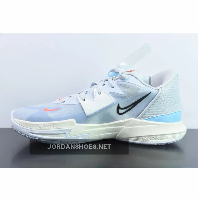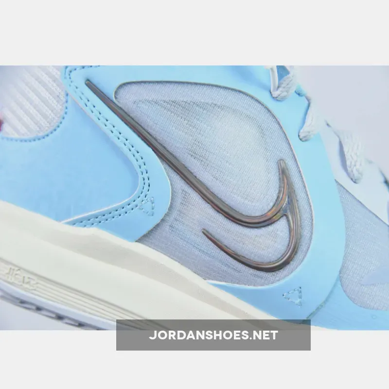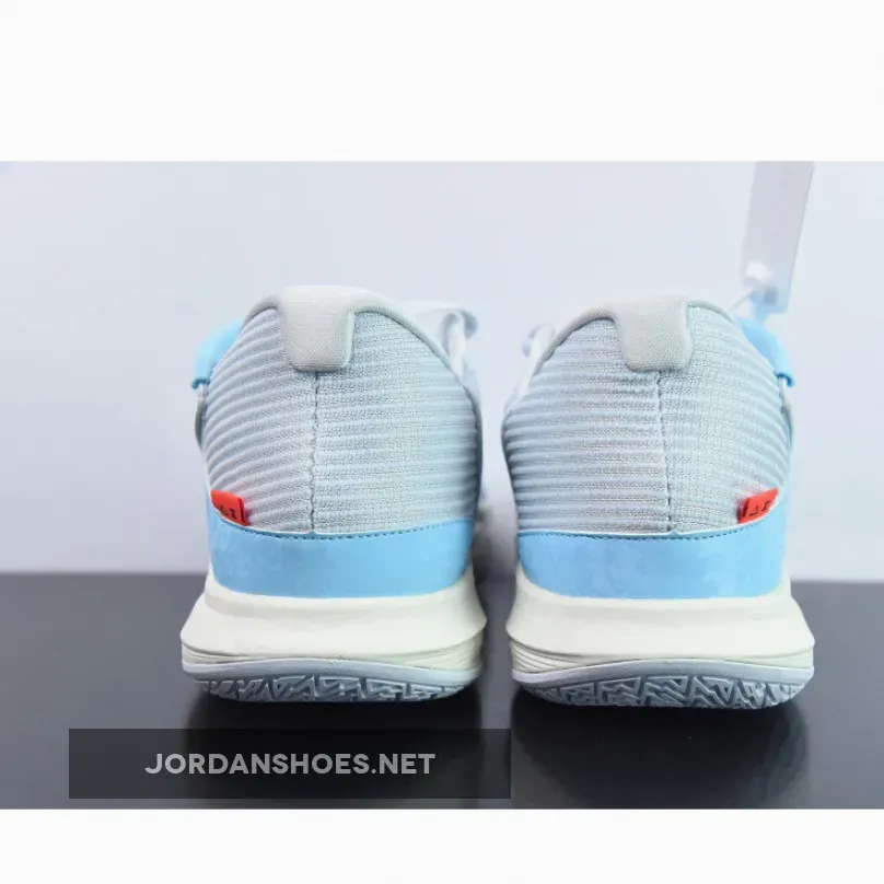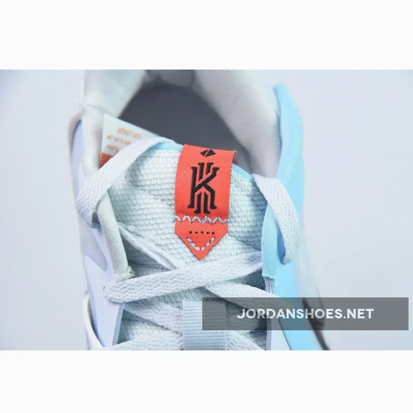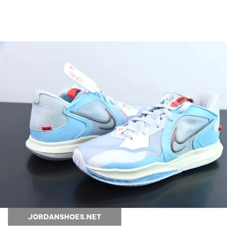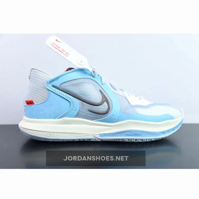 This Nike Kyrie Low 5 features an icy color scheme seeing its mesh and mixed textile base dressed in light grey while contrasting hits of light blue dress the overlays.