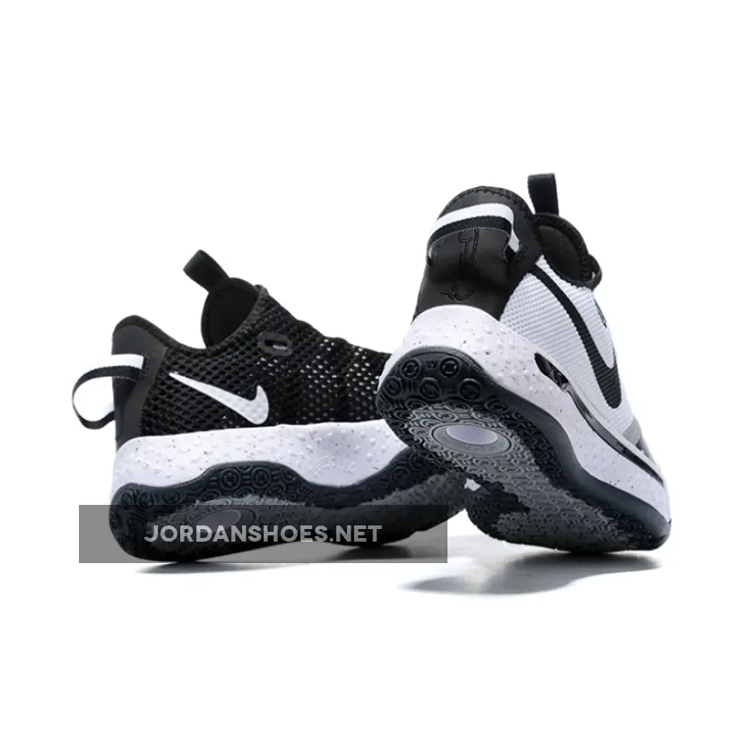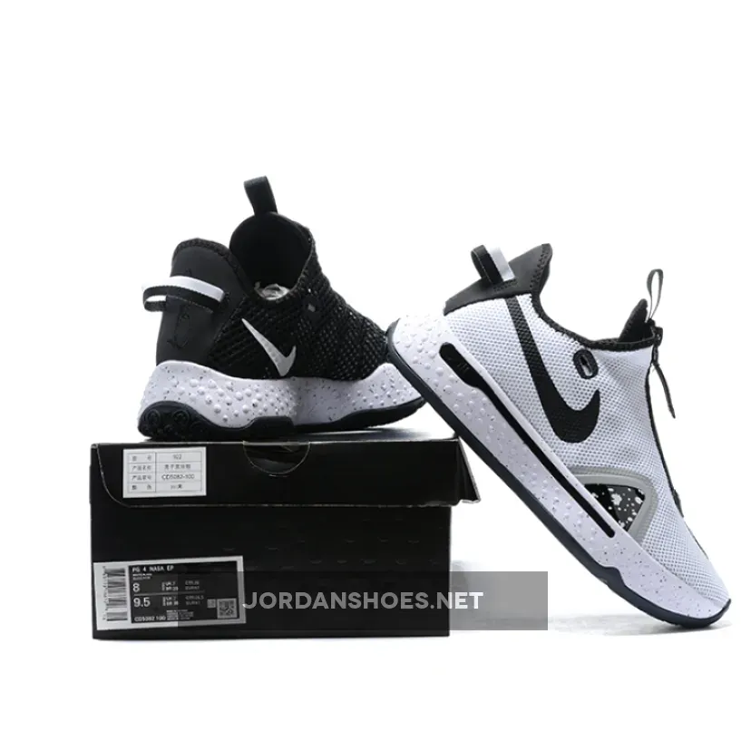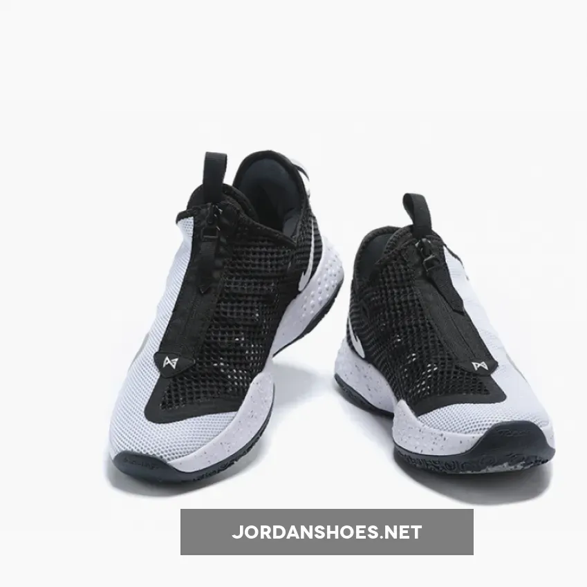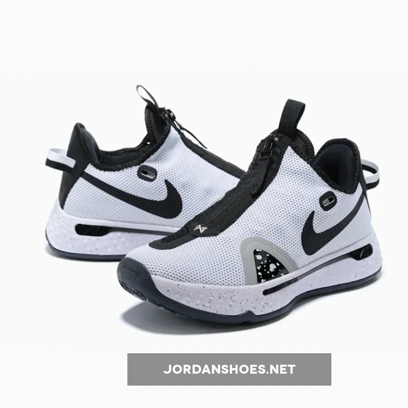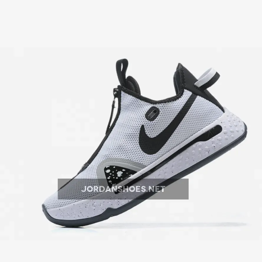 Dressed in a White, Black, and Pure Platinum color scheme. This Nike PG 4 sports has a yin-yang theme with White covering the lateral side and Black on the medial. Its signature zipper closure revealing the shoe’s lacing system atop a speckled midsole completes the design.