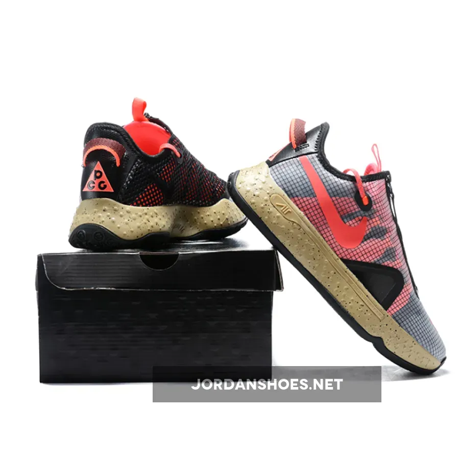This offering of the Nike PG 4 features a Black base covered fully in digital camouflage graphics detailed with Orange and Purple accents to give off an ACG vibe. A speckled midsole atop a Black rubber outsole completes the design.