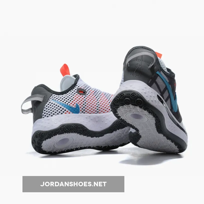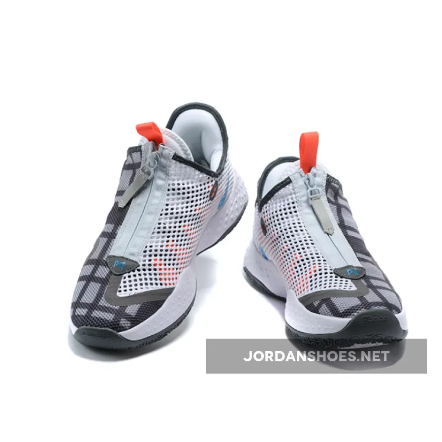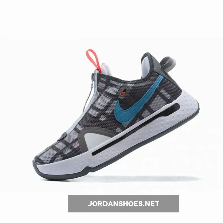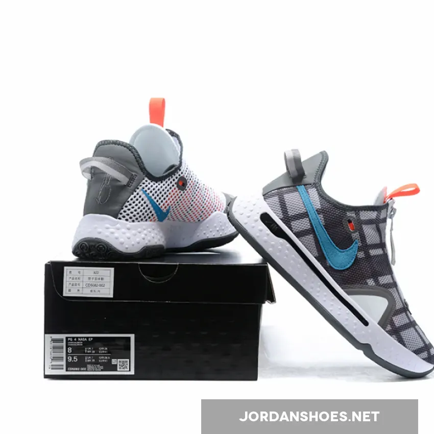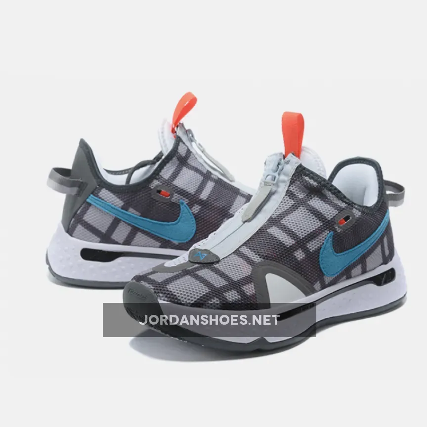 Dressed in a Football Grey, Laser Blue, and Light Smoke Grey color scheme. This PG 4 features a Grey plaid upper contrasted with White on the medial mesh side panel, Orange covering the pull tabs and lockdown cables as well as Blue Swooshes on the sides. A White foam midsole atop a dark and light Grey rubber outsole completes the design.