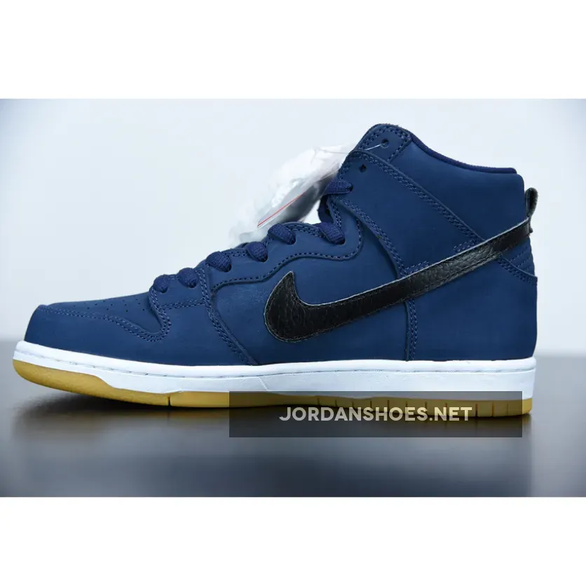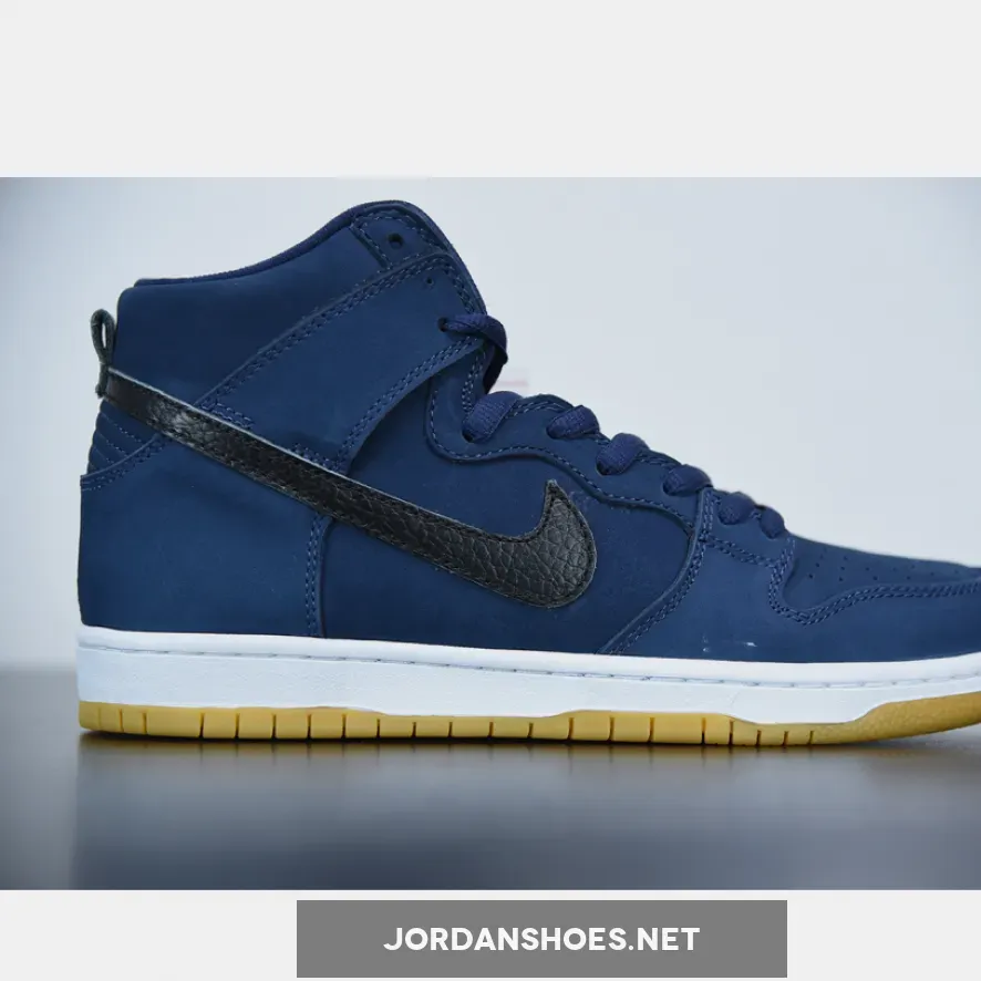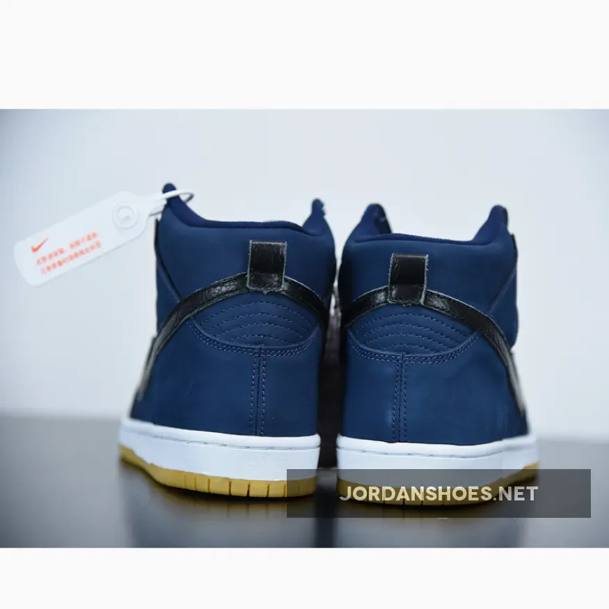 Black laces and leather side swooshes interrupt the navy scheme that takes over the rest of the upper. Underfoot, sole units indulge in a tried-and-proven white midsole/light gum brown outsole combination, which also appeared on the low-top SB Dunk. As is customary of these skateshop-exclusive shoes, the label on the tongue should don orange branding.