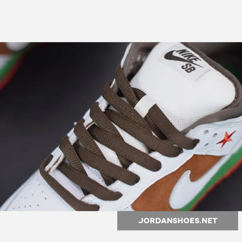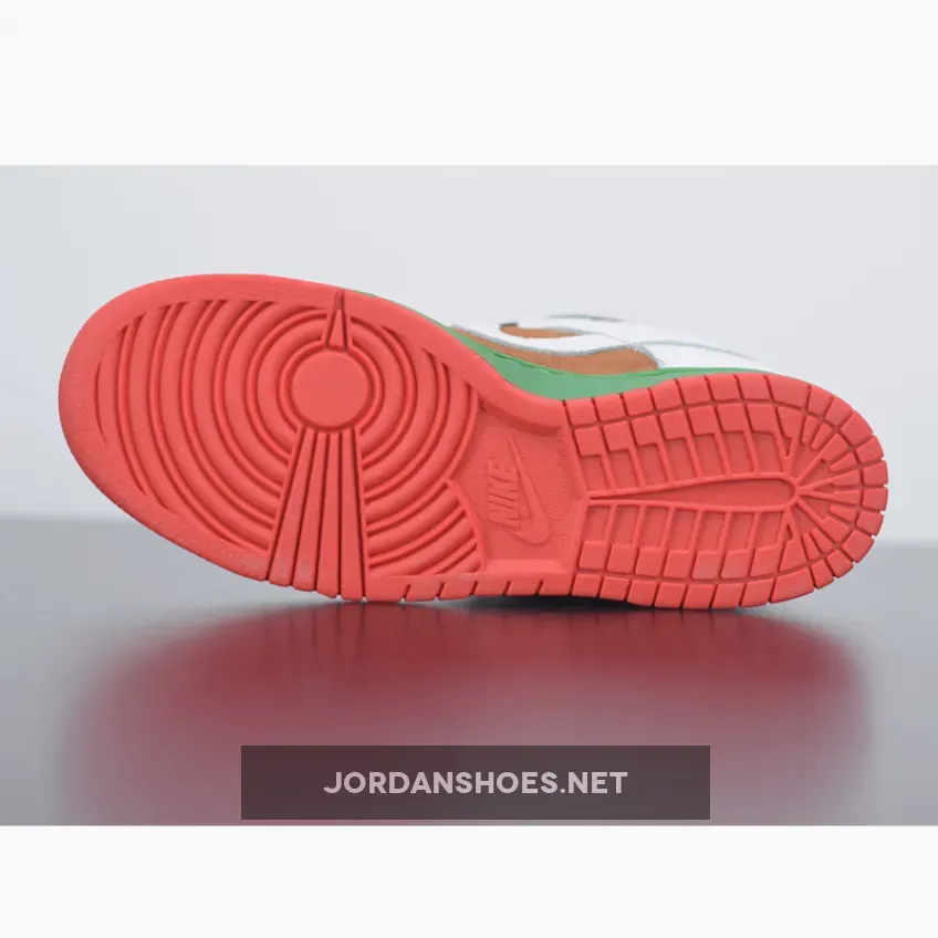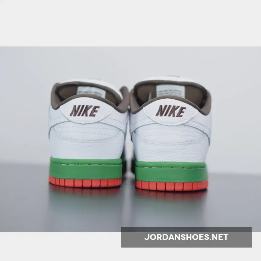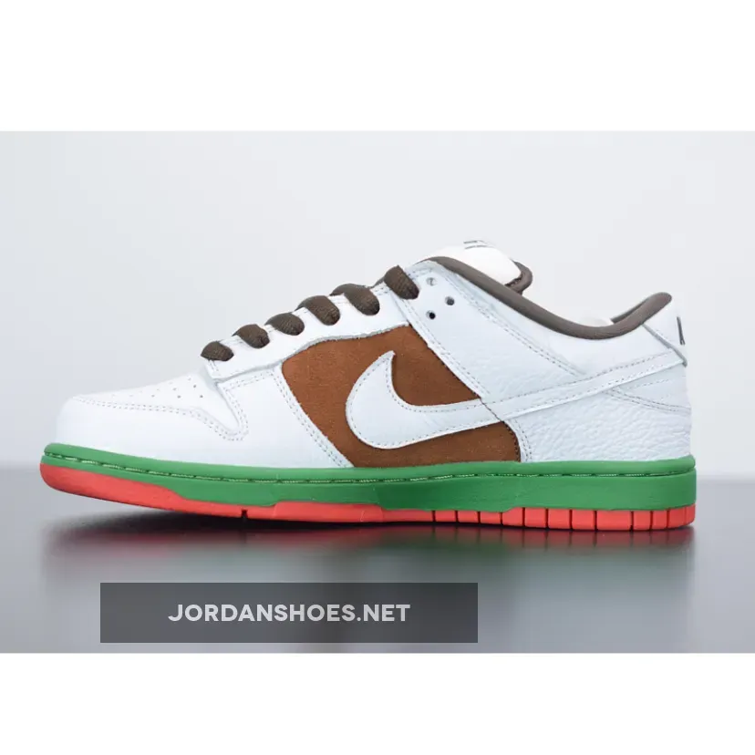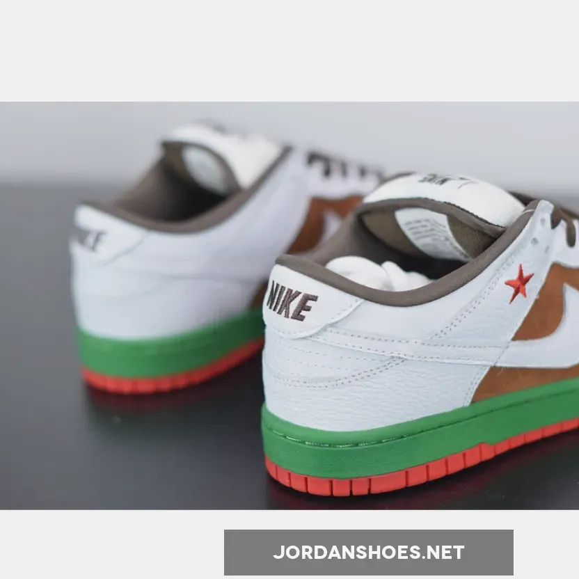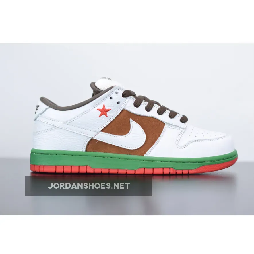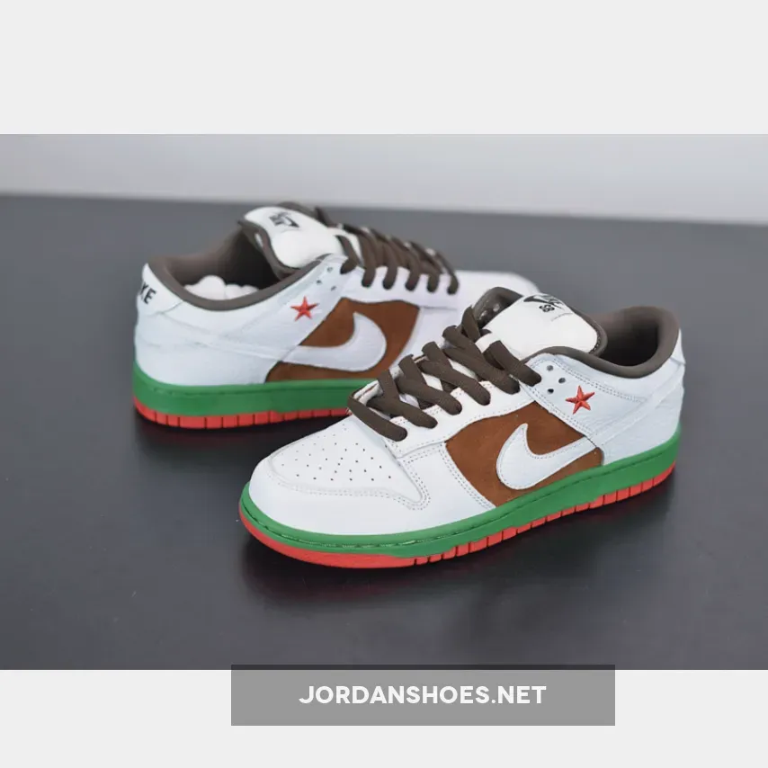 These Dunks were inspired by the California state flag, hence the nickname Cali. They shoes have a brown suede side panel, representing the bear, while the green midsole resembles the grass upon which the bear is standing. The red outsole is for the red stripe at the bottom of the flag.