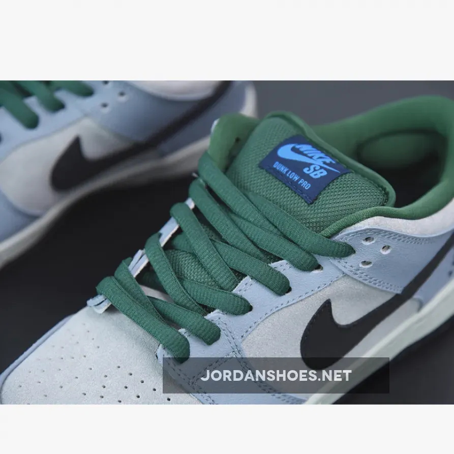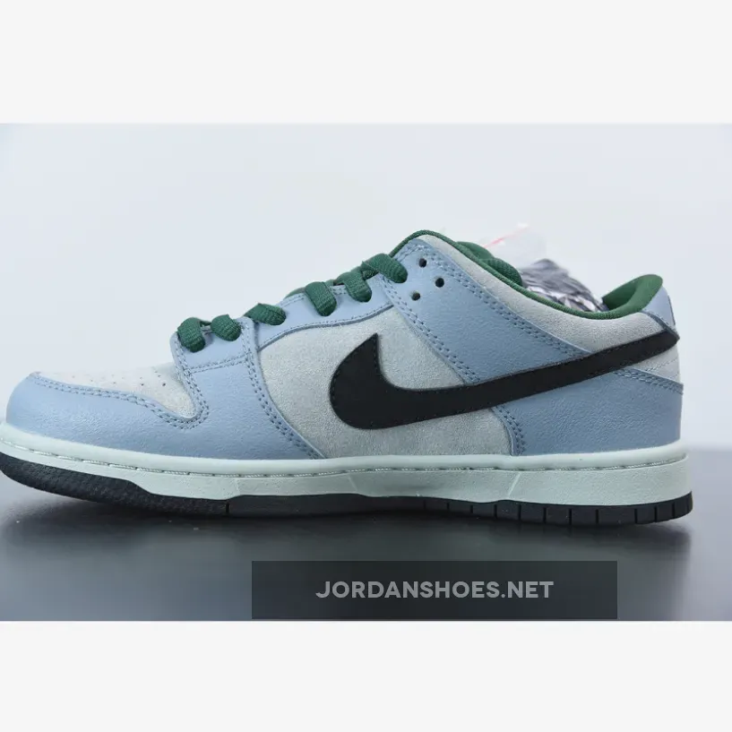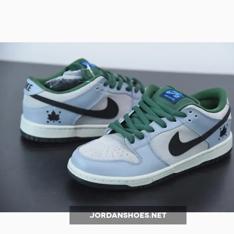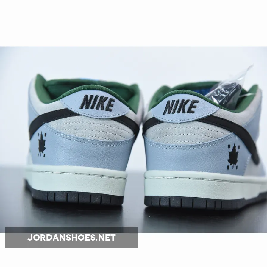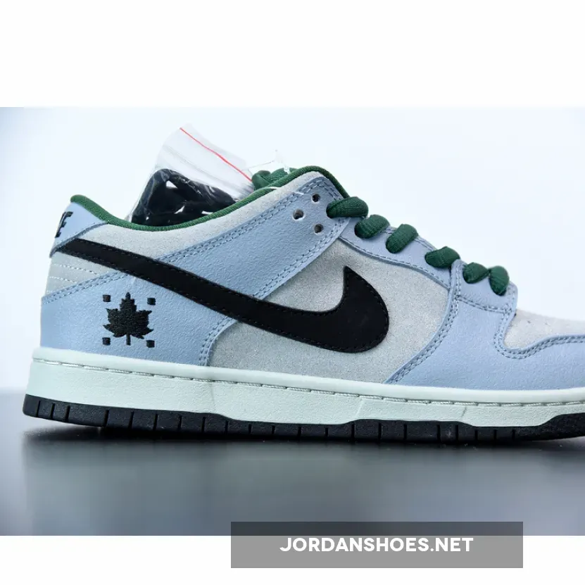 This Nike SB Dunk Low features a Dove Grey suede upper with Black detailing, minor hints of Blue on the tongue and Gorge Green accents. The shoe is also completed with a Maple Leaf embroidery on the heel.