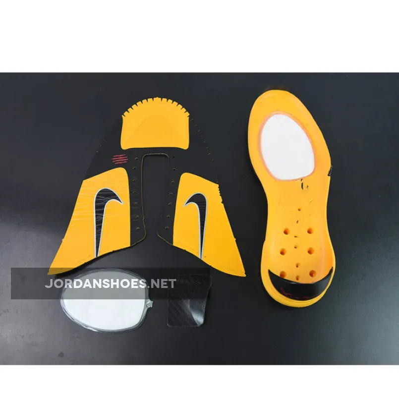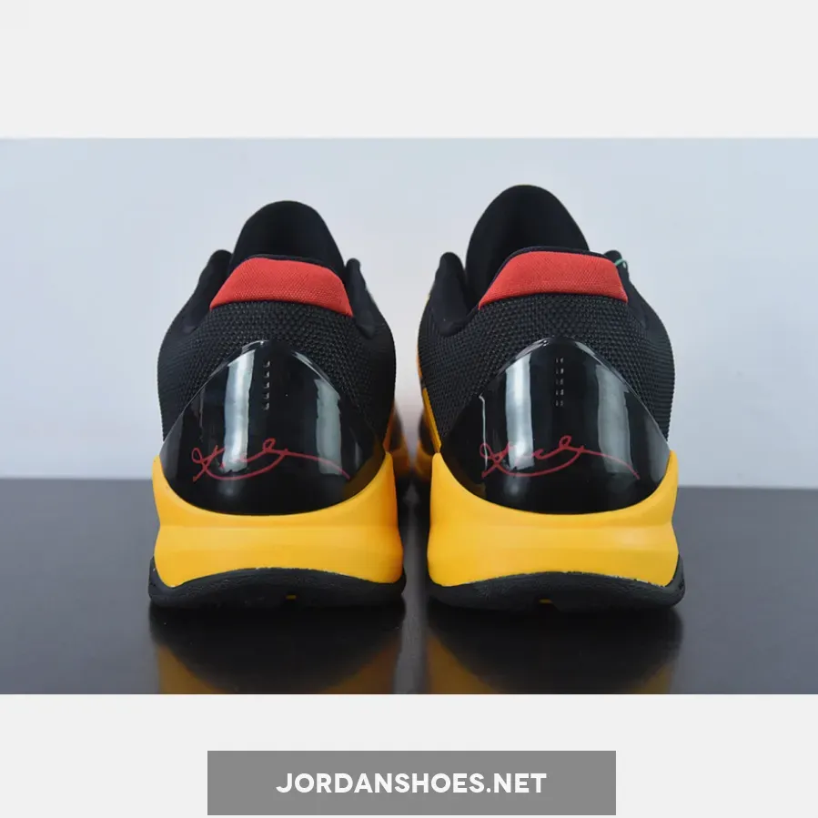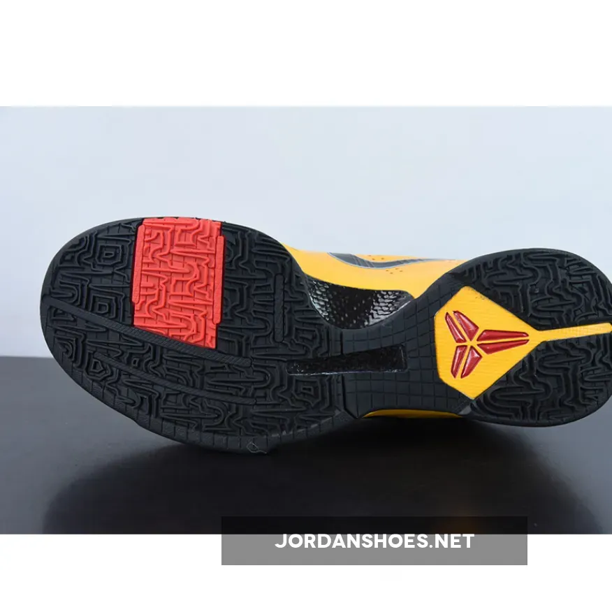 Shiny, pitch-black material draped around the entire upper, allowing the vibrance of the orange overlays take away the spotlight. Besides, laces flaunt a fiery look that can light the tracks on fire. Similarly, the toe box, side panels, and heels also come done in orange. The rest of the runner gives off a dark black aesthetic. Nike’s signature Swoosh logo hits the sidewalls, and Kobe’s signature sheath logo appears on the tongues, in metallic silver. Also, subtle tints of red also hit the heels, forefoot, and Kobe’s autograph printed onto the heels.